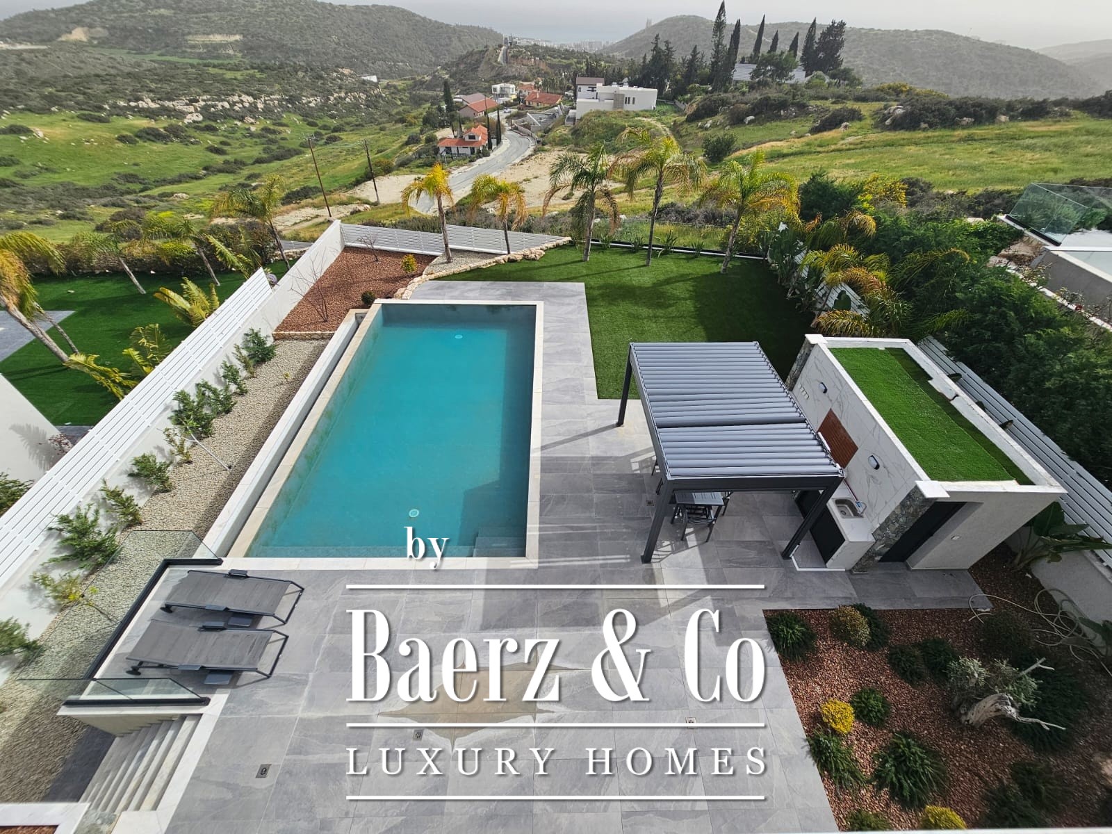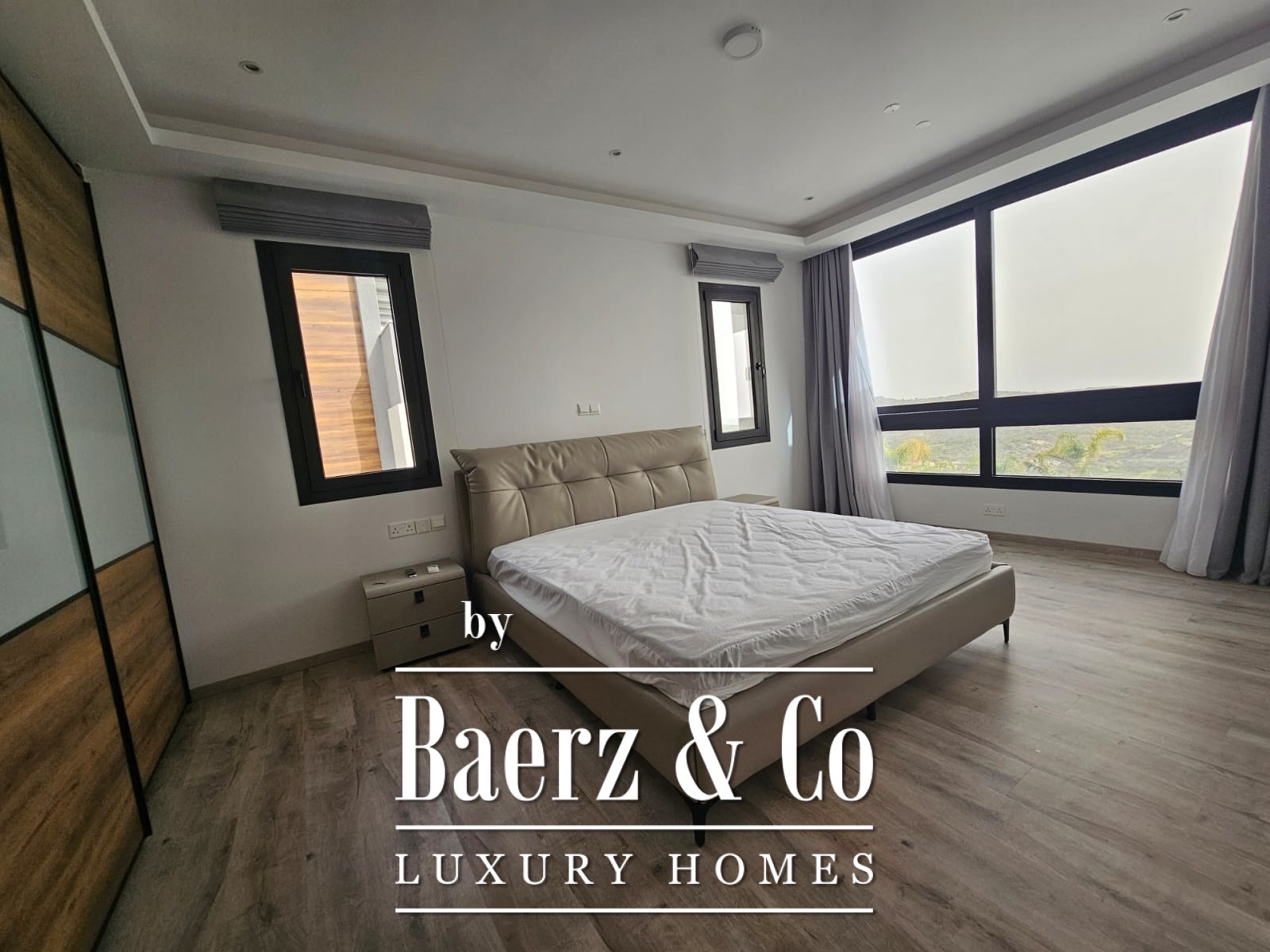 Outdoors, the landscaped garden frames a private swimming pool and BBQ area, complemented by a poolside shower and toilet. Eight parking spaces, ample storage, a security door, and a dedicated service room complete the offering. This villa defines high-end living for those drawn to the unique panorama and tranquility of Parekklisia.