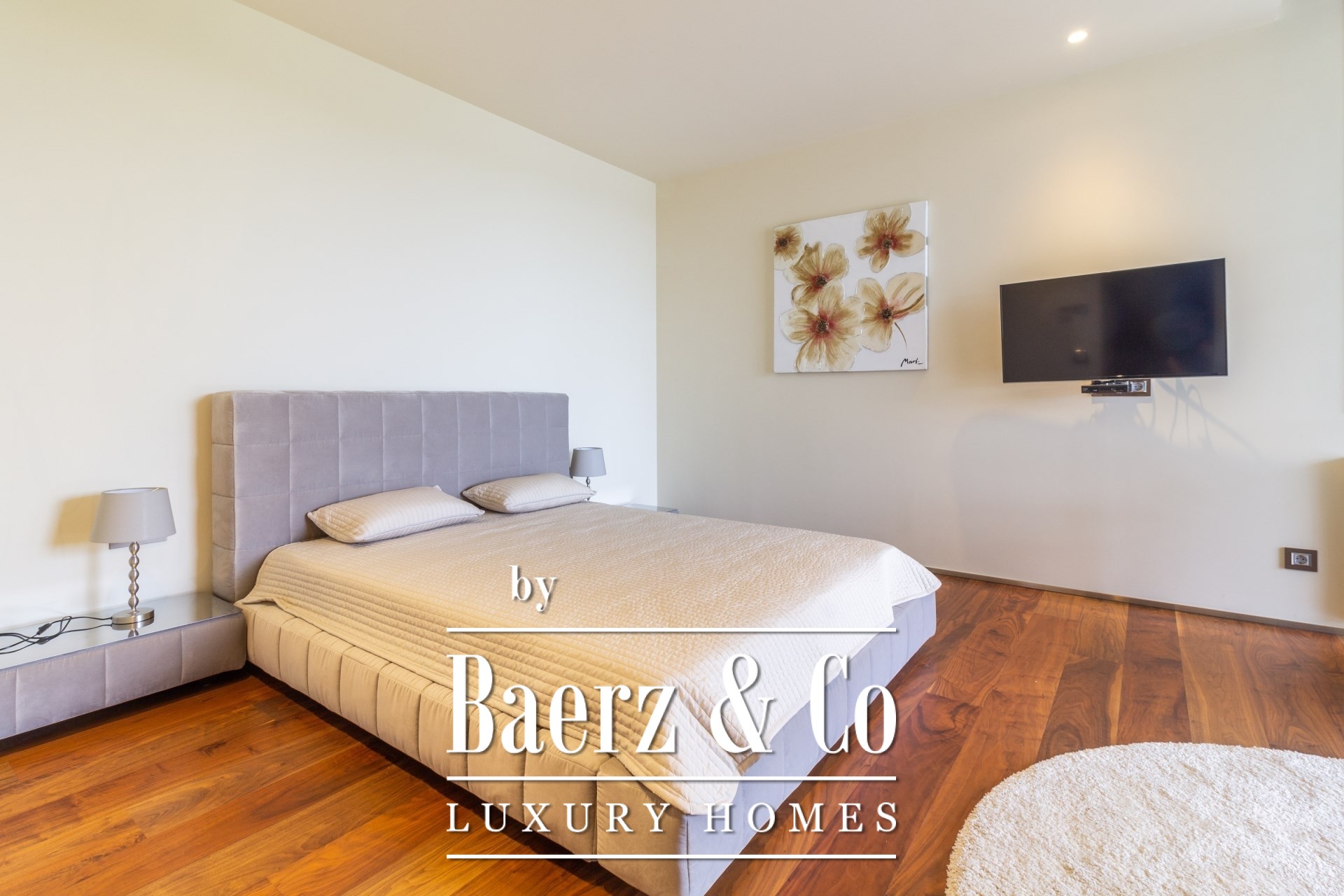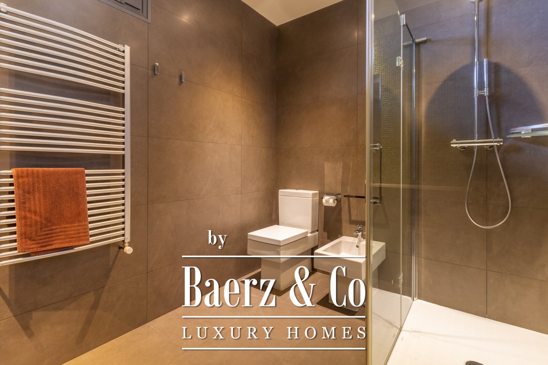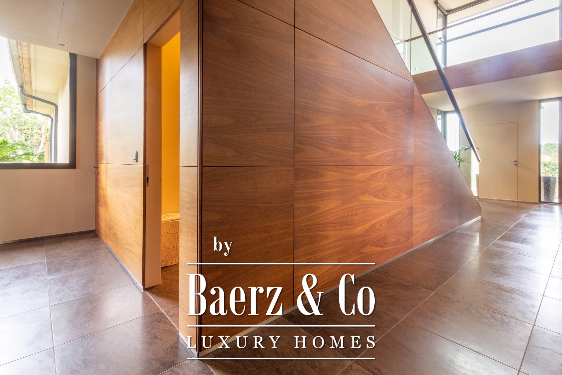 Outdoors, mature gardens surround the pool with its waterfall feature, a barbecue and outdoor kitchen, and expansive chill-out spaces. Underfloor heating, ducted air conditioning, electric windows, integrated audio, complete surveillance, and an elevator underscore the emphasis on comfort and security.