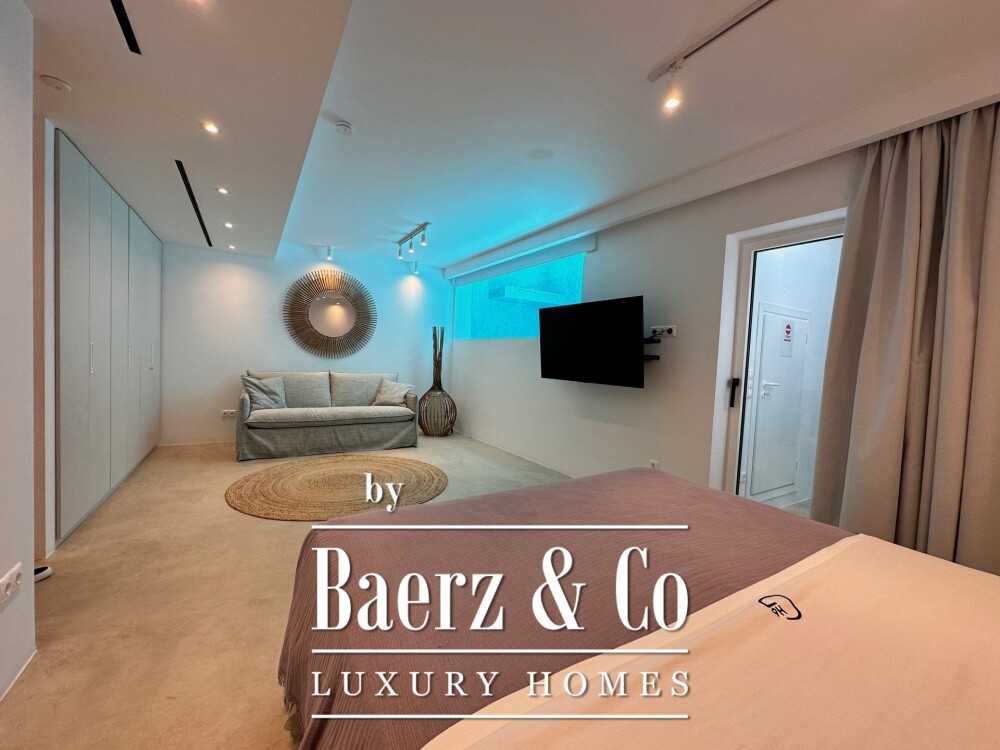 Terraces define the rhythm of daily life, one with a heated swimming pool and hot tub, the other hosting a covered dining table for meals that flow from sunlit breakfast to midnight cocktails, all overlooking the sea. The basement master suite is marked by distinctive natural light filtered through the pool, while amenities such as air conditioning, heat pump, and autonomous heating provide year-round comfort. The property also offers a sauna and double-glazed insulation.