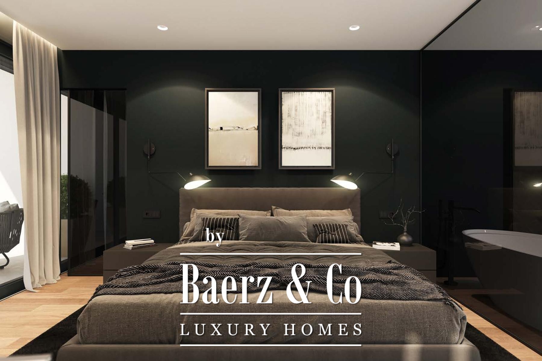 Spanning 213 m², this property is thoughtfully arranged over two levels. The ground floor centers around a spacious, open-plan living area with a kitchen island and dining space, where expansive glass walls invite natural light and connect the interiors to a covered terrace and landscaped garden. The layout includes a bedroom with ensuite bath and walk-in wardrobe, a guest toilet, laundry, and technical room. Upstairs, three luxurious bedrooms each feature a private bathroom, walk-in wardrobe, and access to wide sea-facing terraces.