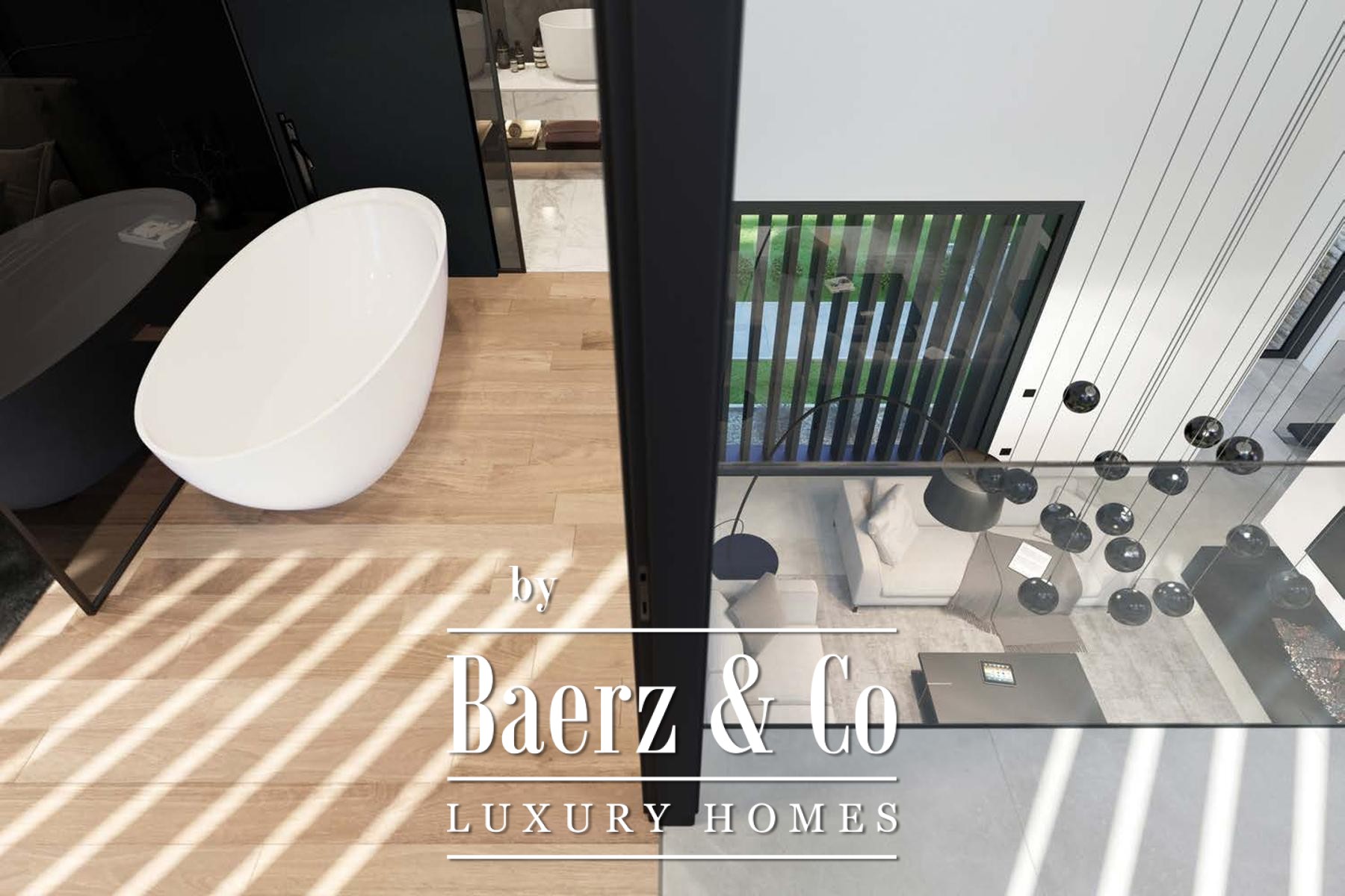 Spread over two thoughtfully designed floors, the villa features four spacious bedrooms and four bathrooms. On the ground floor, an open-plan living space integrates the living room, a kitchen with an island, and a dining area, illuminated by large glass walls that connect to a covered terrace and landscaped garden. This floor also includes a bedroom with private bathroom and walk-in wardrobe, a guest toilet, laundry room, and technical space, ensuring comfort and functionality.