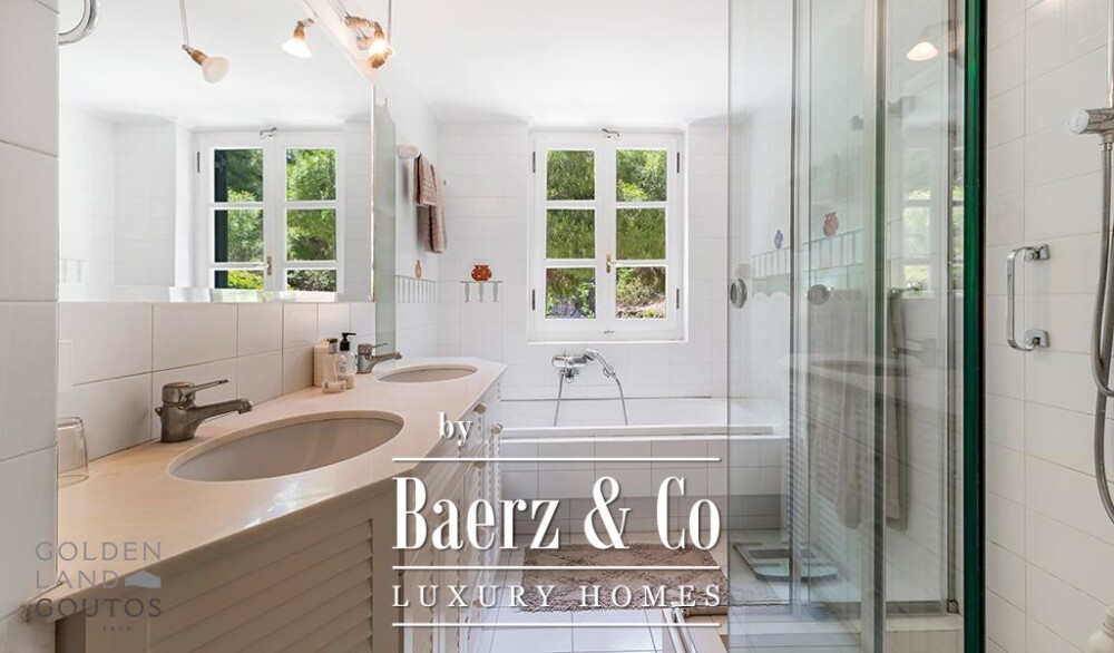 Outdoors, the fully equipped kitchen and barbecue area overlook an expansive pool and terraced grounds, where mountain views and sweeping sunsets become daily rituals. As one of the few true seafront villas for sale in Porto Heli, this residence balances serenity and connectivity, inviting a pace of life defined by privacy and understated luxury.