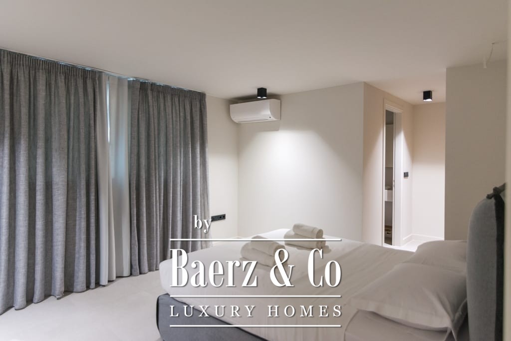 Throughout, interiors are shaped by understated luxury, merging timeless Mediterranean character with contemporary comfort. Striking wooden roof details and expansive aged marble floors create a tactile sense of elegance, while generous openings allow light to move freely across spacious reception areas. The living and dining areas flow out to broad terraces and wide balconies, perfectly framing panoramic sea views toward Spetses, Hydra, and the horizon beyond.