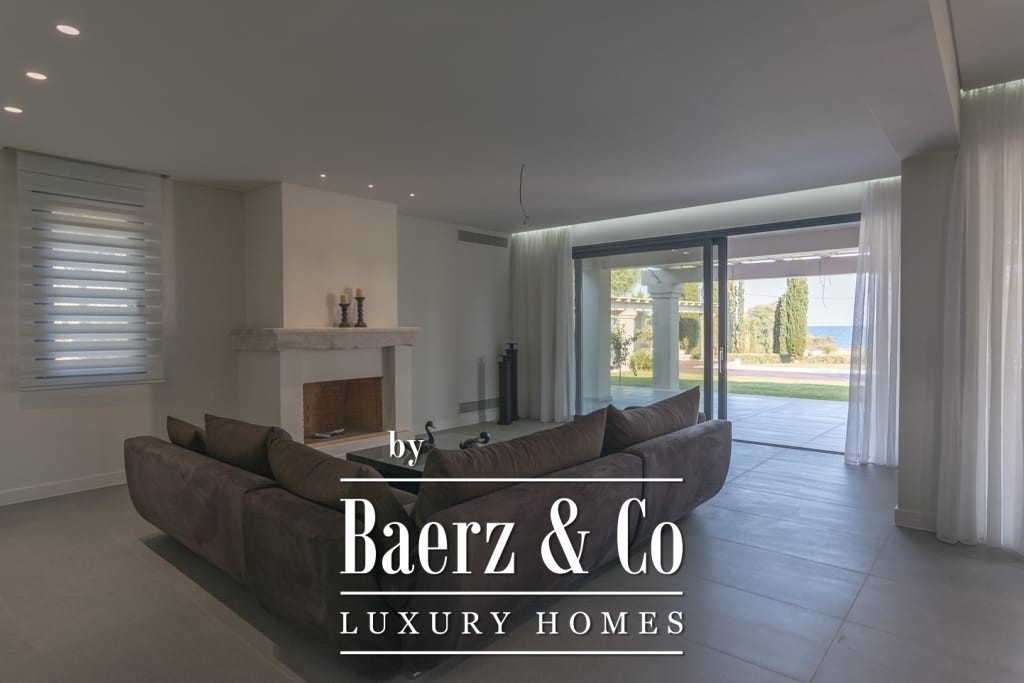 The villa’s features include a fireplace, air conditioning, heating, high-speed internet, and satellite TV to ensure year-round convenience. Outdoors, the landscaped Mediterranean garden surrounds a 12 x 5 meter swimming pool, expansive patios, alfresco dining space, and two barbecue kiosks. Ample parking enhances everyday practicality. A rare 40-meter sea frontage establishes a direct connection to the coastline, making this coastal villa in Porto Heli a discreet retreat of architectural distinction and a remarkable opportunity in one of Greece’s most desirable residential settings.