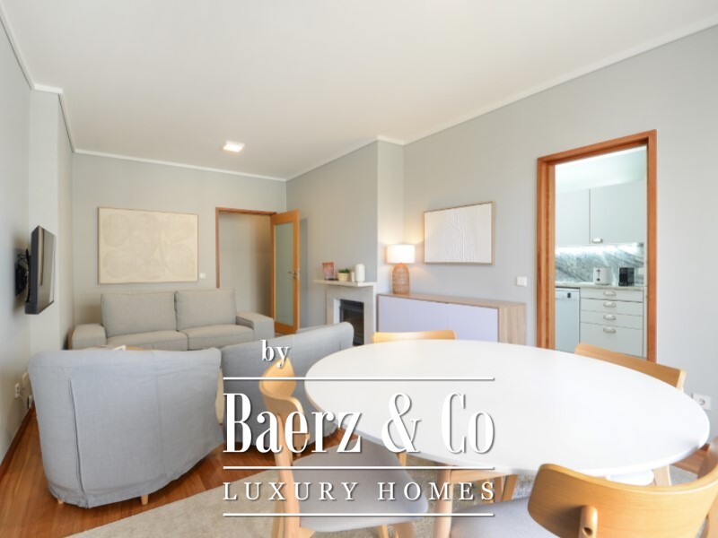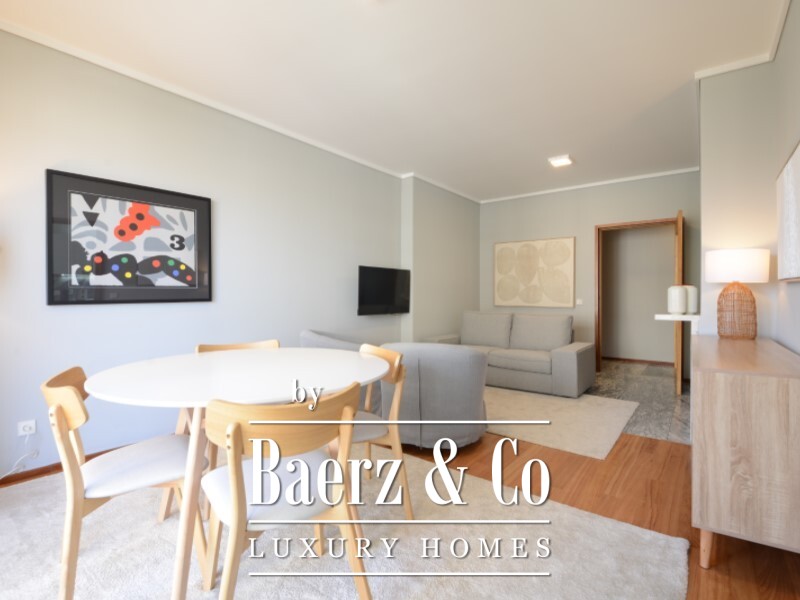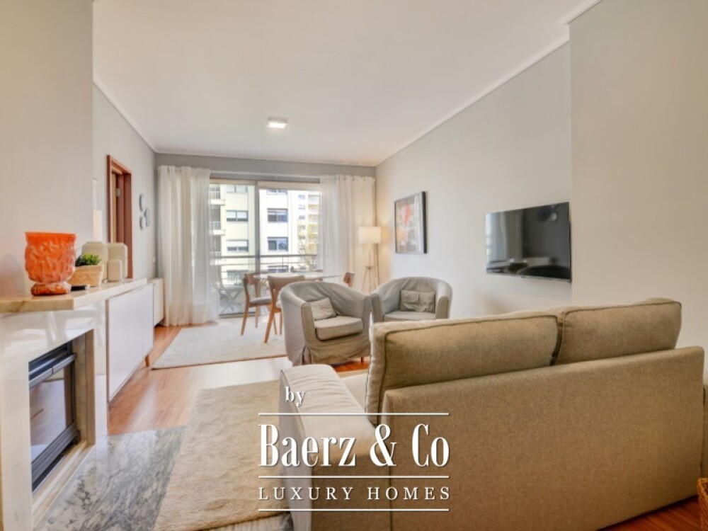 2 bedroom flat Porto presents a refined living space in one of the city’s most sought-after residential locations. This fully furnished flat spans 104 m² on the fifth floor, and is distinguished by its thoughtful division between social and private spheres. Upon entering, a welcoming hall separates the living zones. The living room, enhanced by a fireplace and direct access to a furnished balcony, benefits from an east and south orientation that brings in morning and daytime light.