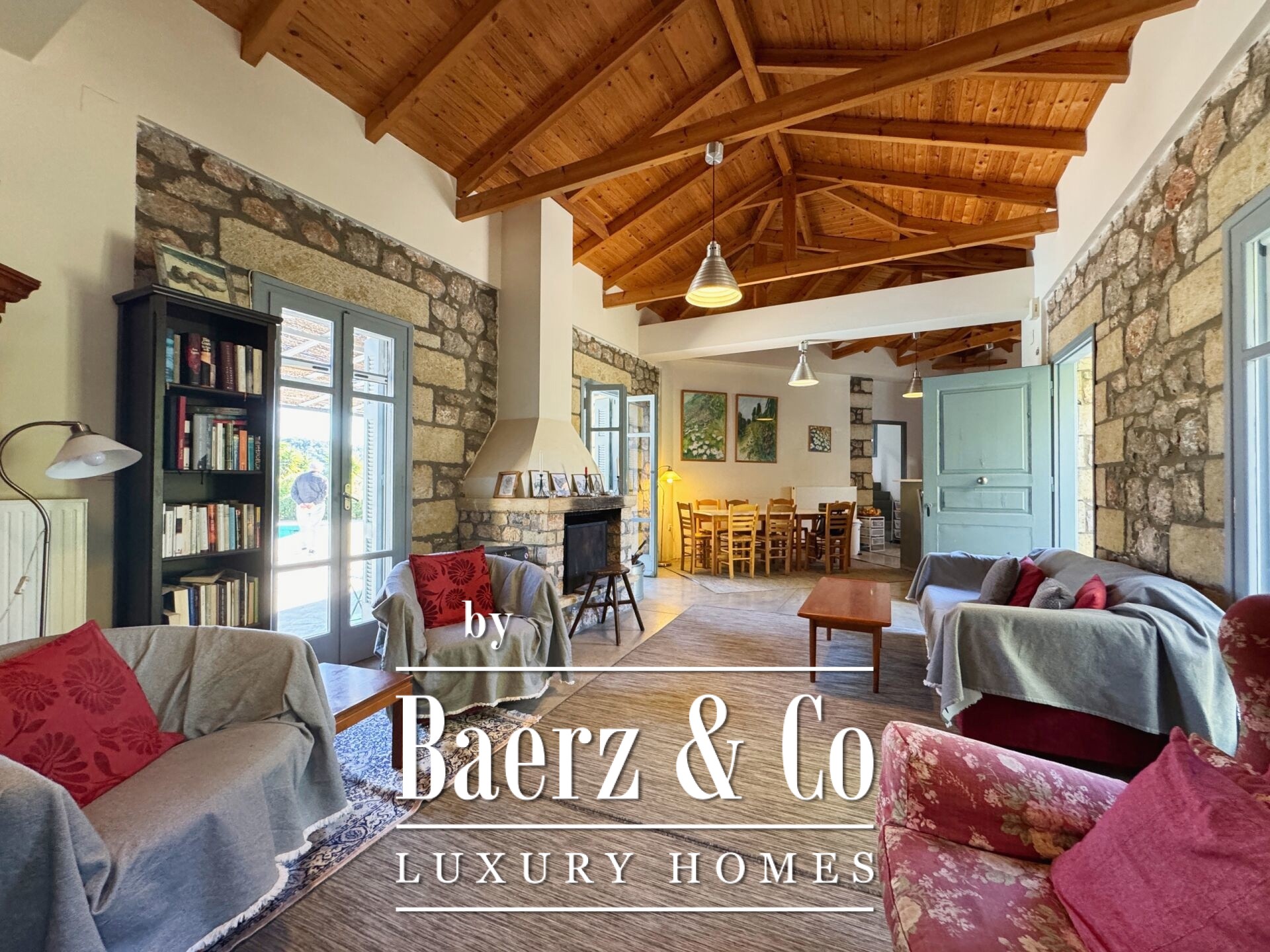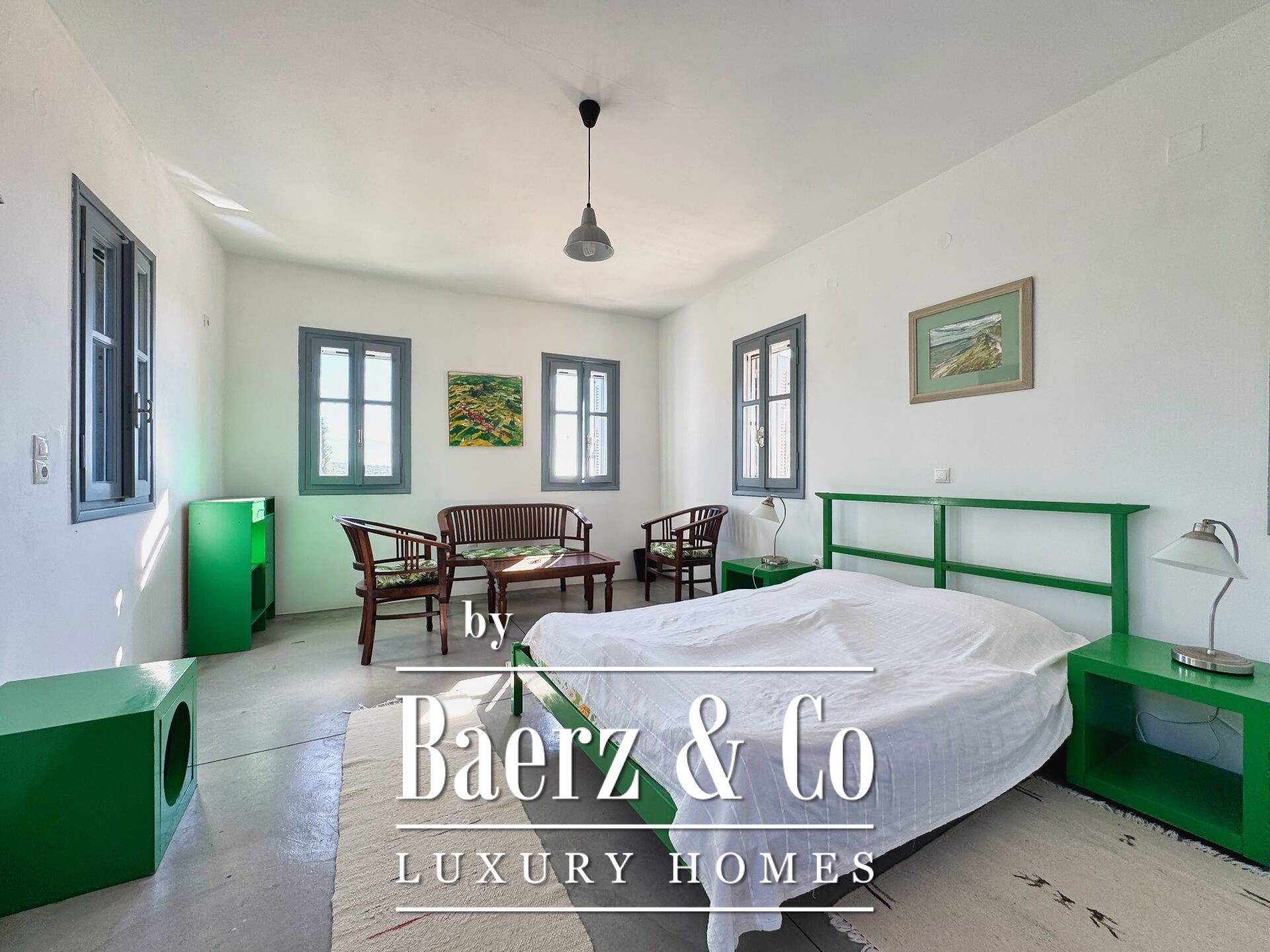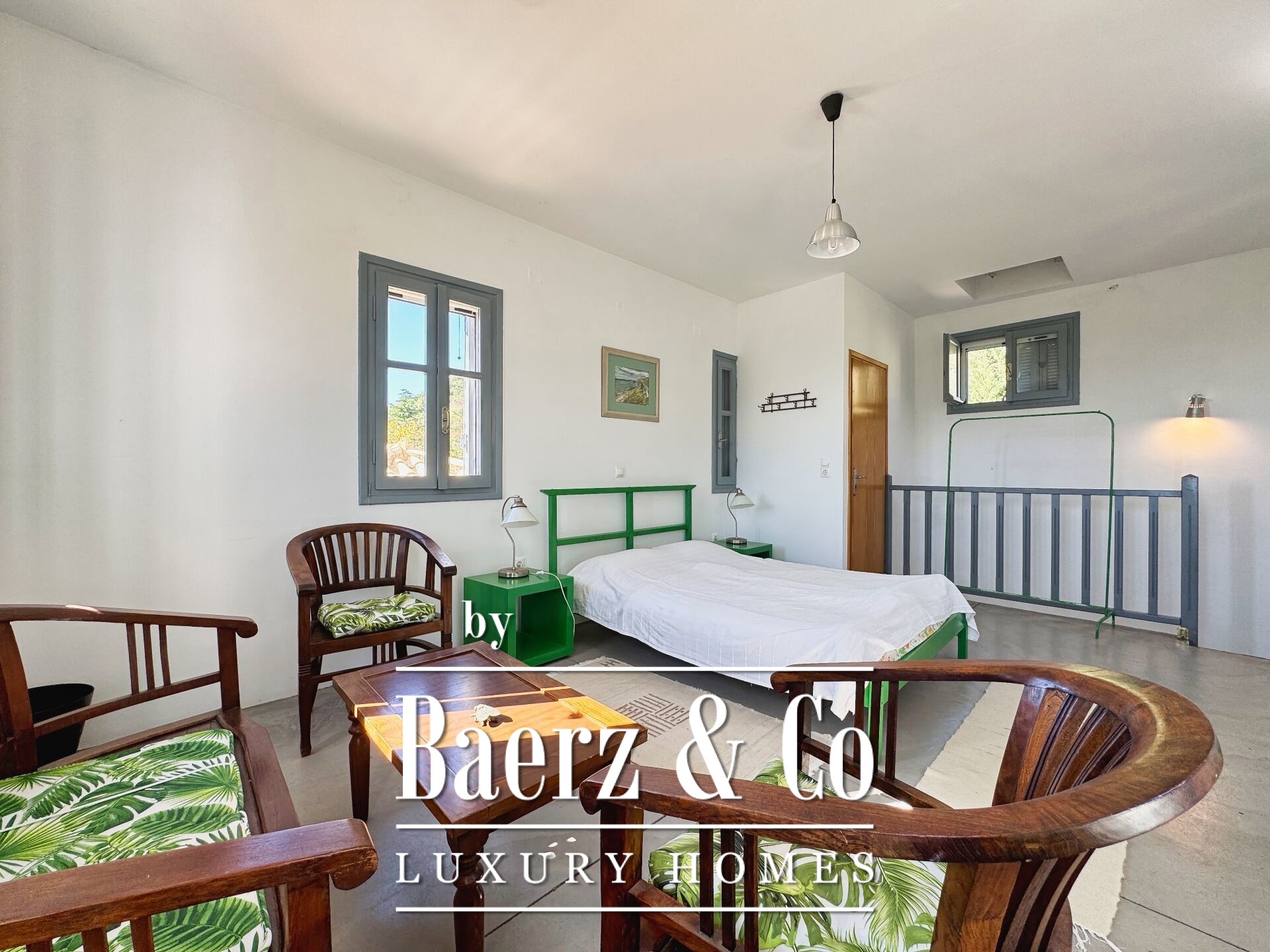 On the same level, a flexible open-plan area with its own bathroom can serve as a guest house, wellness suite, or creative atelier. Outdoors, a private swimming pool frames the mountain-to-sea panorama, inviting quiet reflection. Heating systems—central, oil, solar water, and boiler—support year-round living. This luxury villa for sale in Prosilio honors the Mani tradition, delivering a home of enduring quality, privacy, and serene connection to both land and sea.