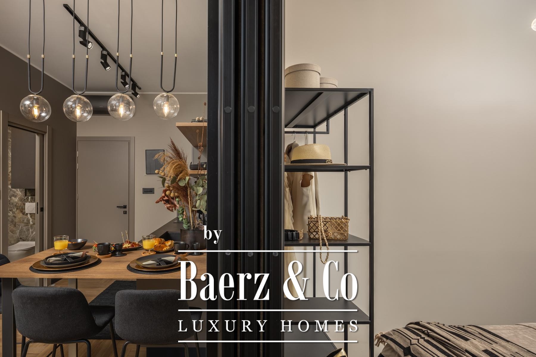 The interiors are shaped by a refined use of warm beige and anthracite, highlighted by gold details and custom lighting. Italian furnishings, large-format porcelain tiles, and matte black Veneta Cucine kitchens with sophisticated stone-marble backsplashes set an elevated tone. Frosted glass partitions, wooden wall slats with LED accents, and designer brass lighting complete the ambience.