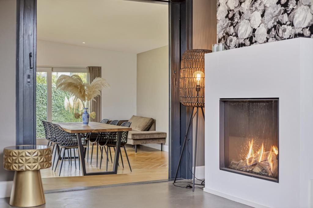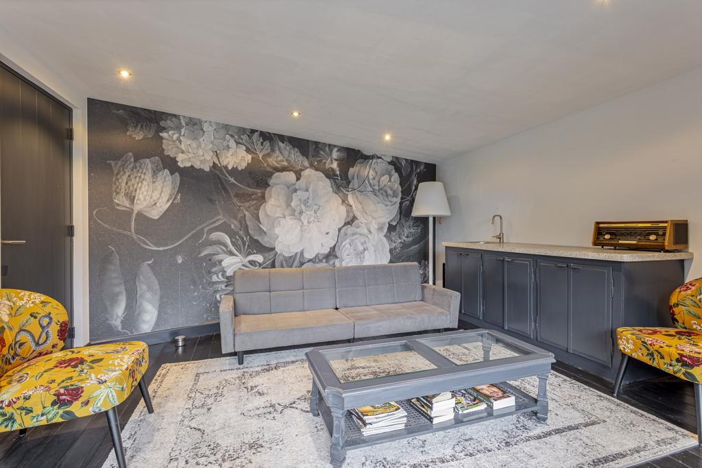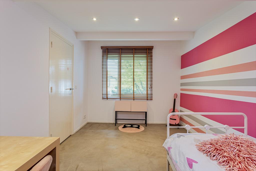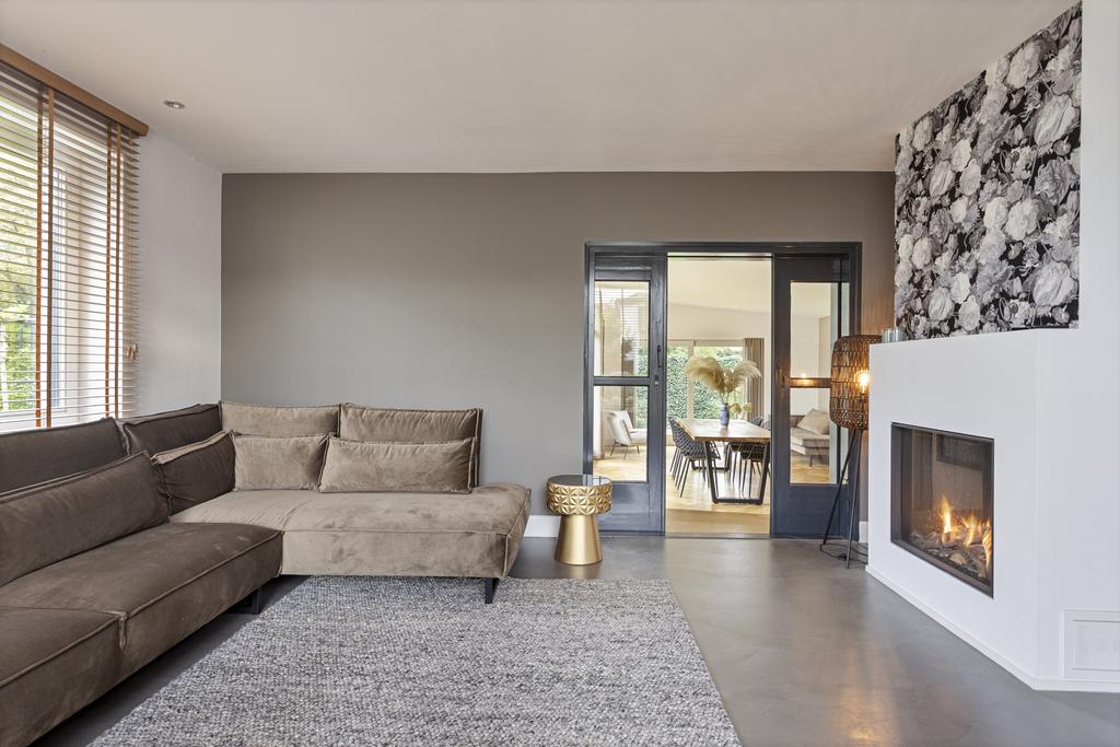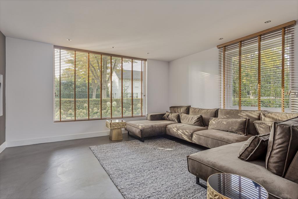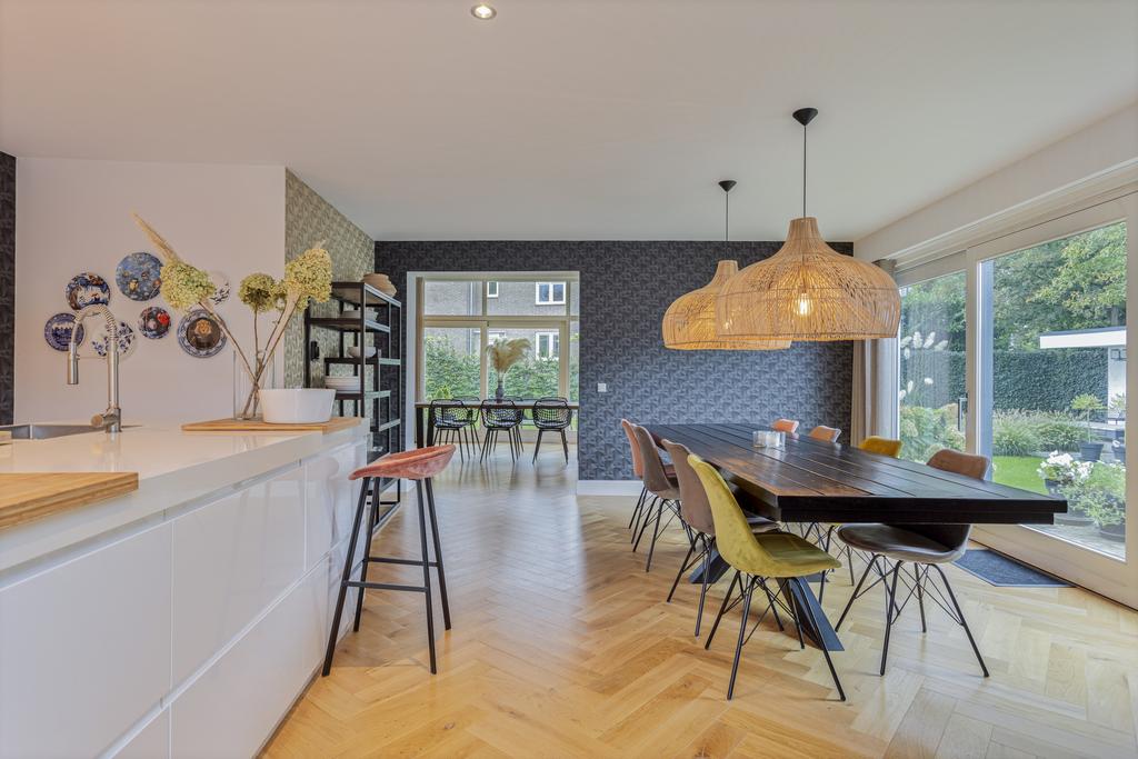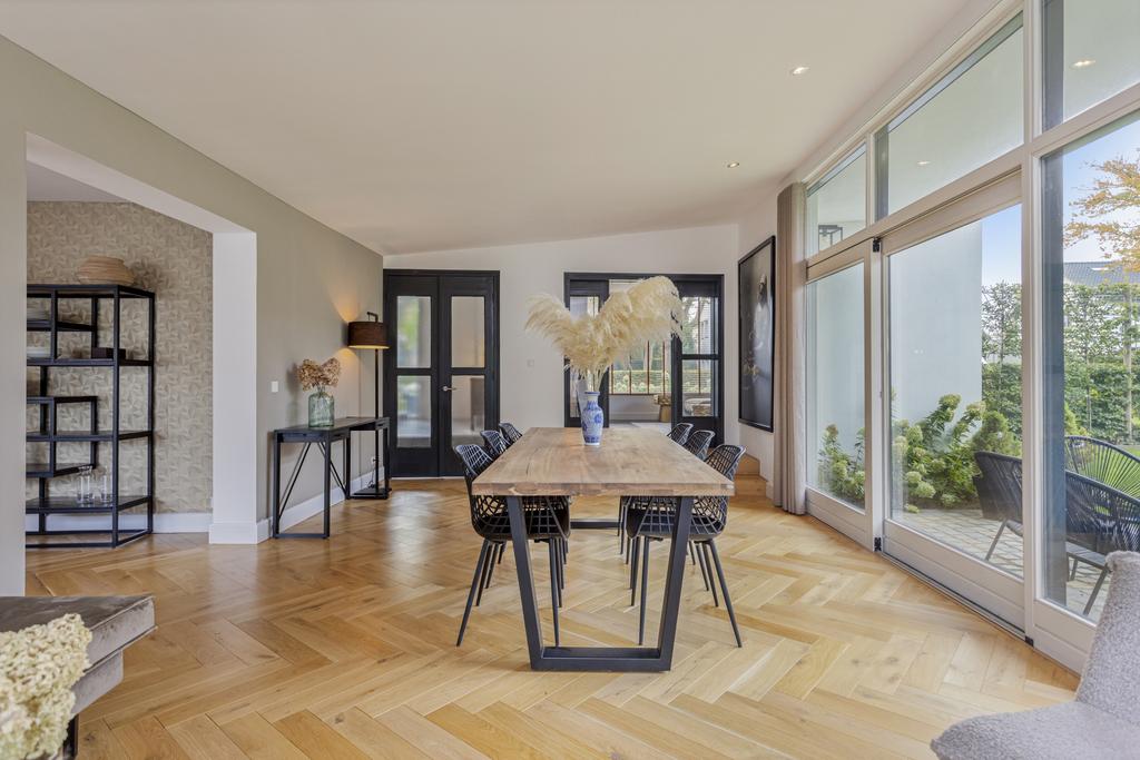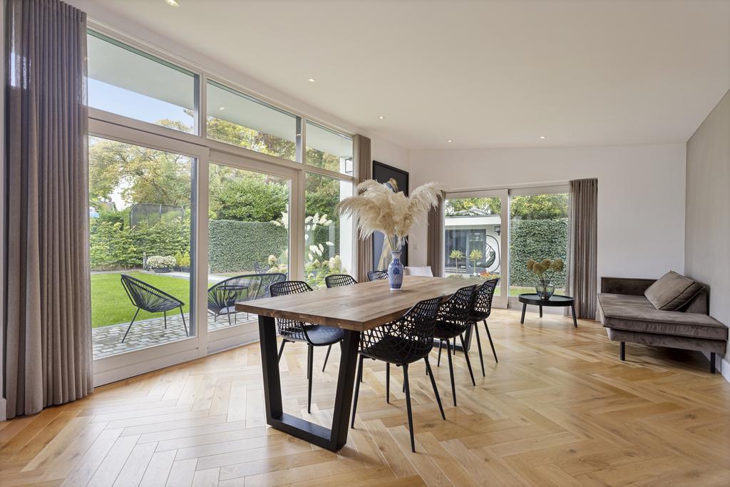 The side and rear gardens are accessible via four large sliding doors. All rooms are finished with either a modern concrete-look floor or a classic wooden herringbone floor. The kitchen is designed around a central island and is fully equipped with all necessary built-in appliances.