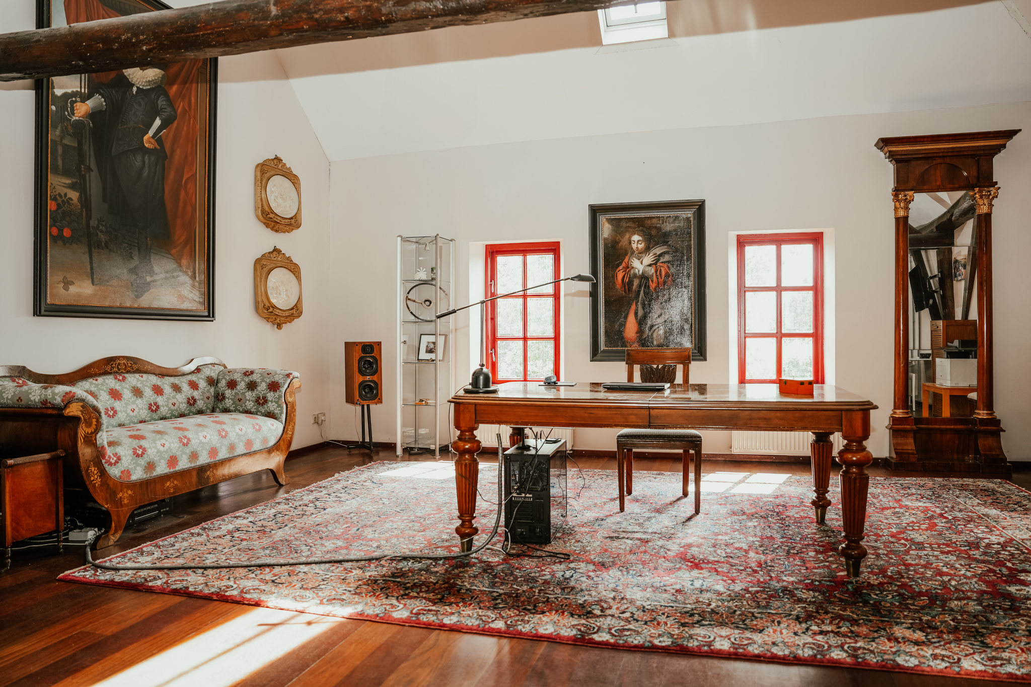 On the first floor, there is a spacious office with archive space, three bedrooms (two of which have fireplaces), a workspace, two bathrooms, and a laundry room with an infrared sauna. The second floor offers two additional bedrooms, a fourth bathroom, a play attic, and a technical room.