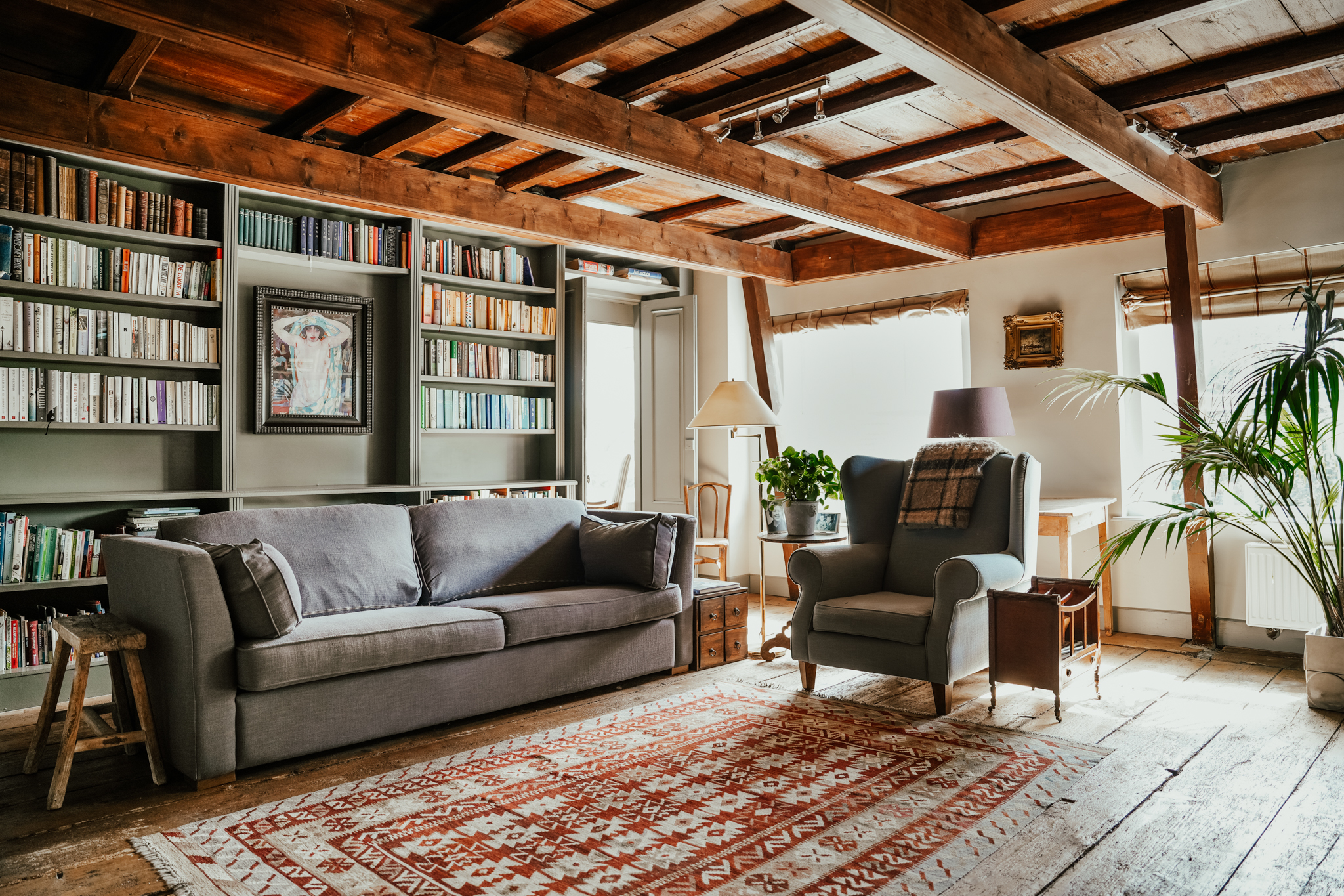 Of the two rear-facing rooms overlooking the garden, the largest currently serves as a second living room, TV room, and has an adjoining workspace. This room radiates authenticity with its beautifully restored beamed ceiling, sash windows, 200-year-old wide floorboards, and a fireplace with fixed cupboards. This room also provides access to the laundry room, workspace, and office.