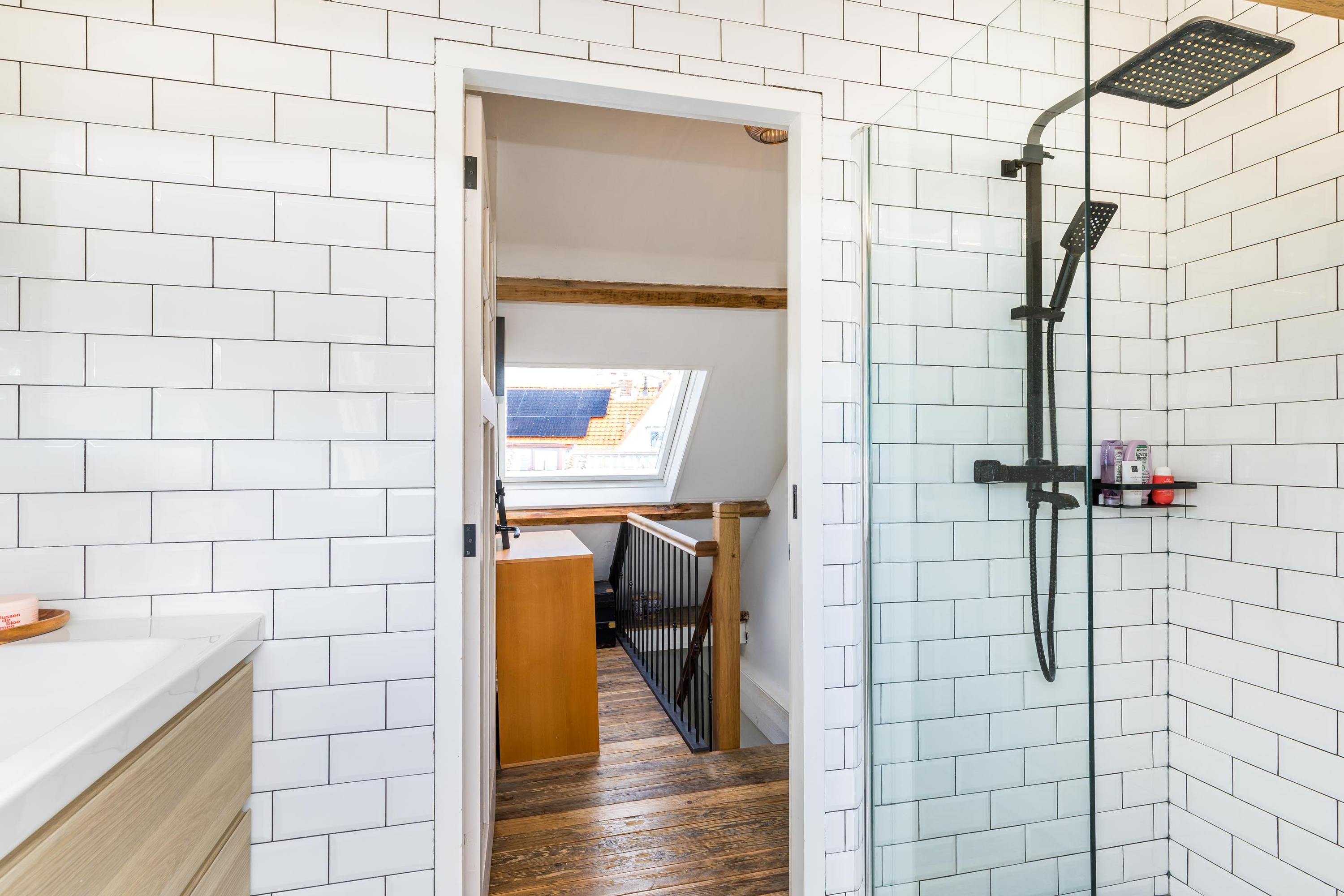 On the first floor, you’ll find a large bedroom with generous built-in wardrobes, a separate toilet, and a comfortable bathroom with a bathtub and double shower.