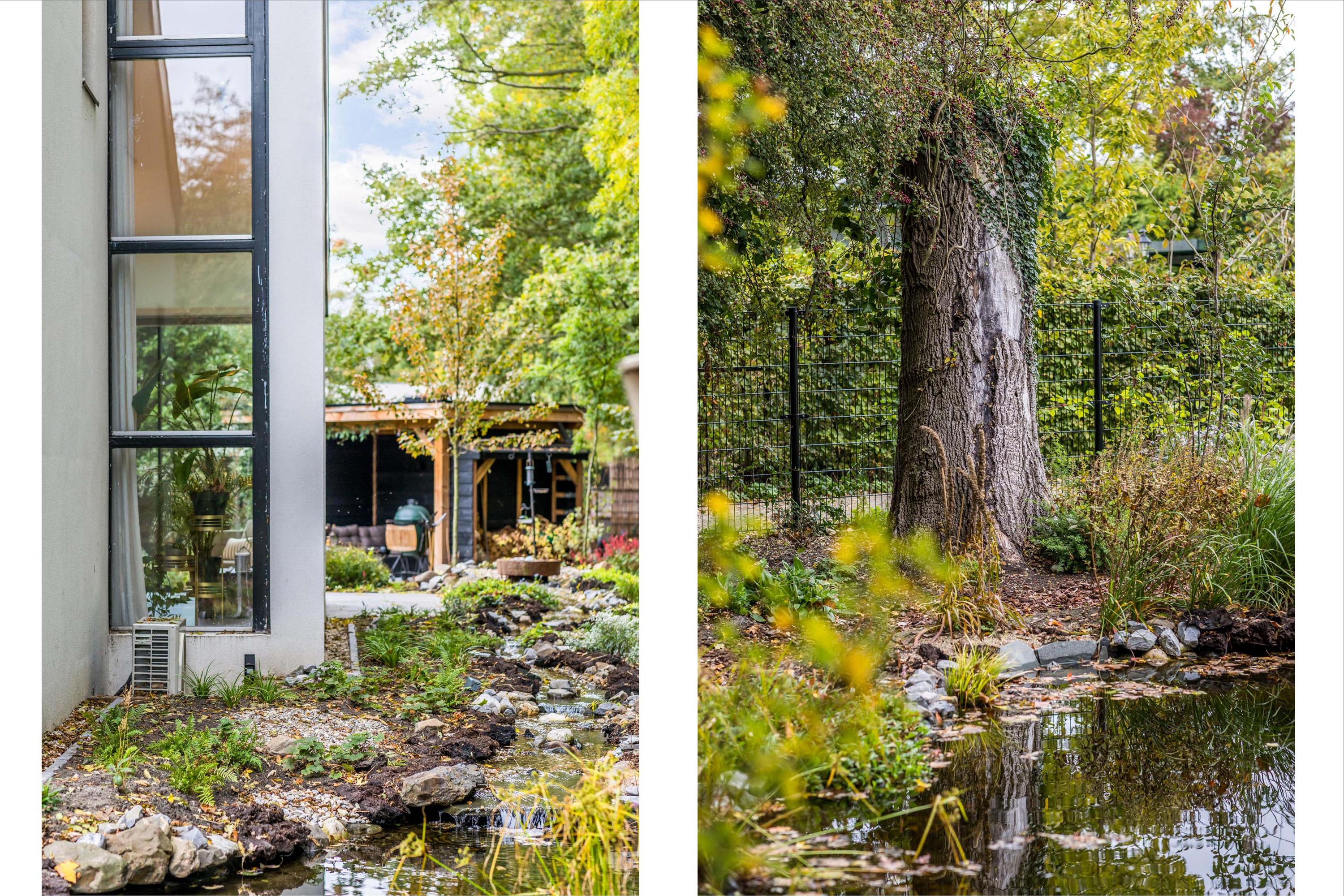 Garden: landscaped by an architect and offering a remarkable amount of privacy, featuring on-site parking, a swimming pool, a charming covered area that can serve as an outdoor kitchen, two storage rooms, and a covered bicycle shed.