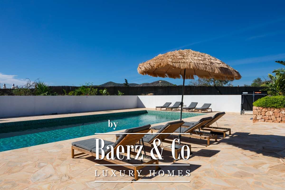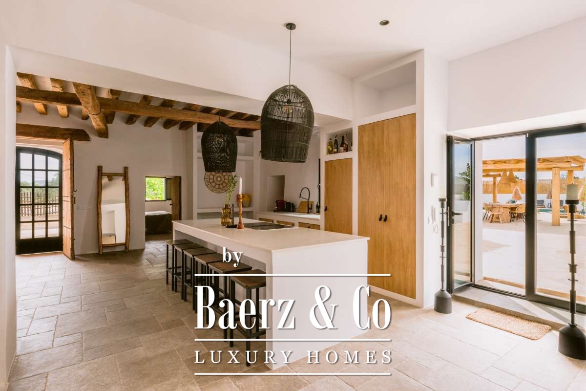 The surroundingsNestled in the heart of Sant Jordi, Ibiza, this exceptional property offers a unique location just a 3-minute drive from the airport and a 10-minute drive from bustling Ibiza Town. Moreover, within a 10-minute drive you will also find the island's most renowned coastal gems, including Las Salinas, Sa Caleta, Cala Jondal and the exclusive Blue Marlin Beach Club. These beautiful beaches and hotspots are close to the residence, in the heart of the island's vibrant lifestyle. This is a perfect location for those who are looking for privacy yet would like to live close to the center. This residence offers a harmonious blend of serenity and easy accessibility.The villaThis beautiful villa, renovated in 2023 with high-quality materials, exudes a unique bohemian chic style. Upon entering, you are welcomed by the open-plan living and dining room, which feature different floor levels. These flow seamlessly into one another and create an inviting and cozy atmosphere. The finca features a fully equipped designer kitchen with modern appliances. Every detail of the house has been carefully chosen to match the new modern style with the authentic Ibicencan charm. The main house consists of 5 spacious, beautiful bedrooms, each with an ensuite bathroom equipped with luxurious rain showers. The master bedroom also features a comfortable bathtub. In addition, there is a charming guest house, the "casita," consisting of a fully equipped open-plan living-dining room, two bedrooms and a shared bathroom.