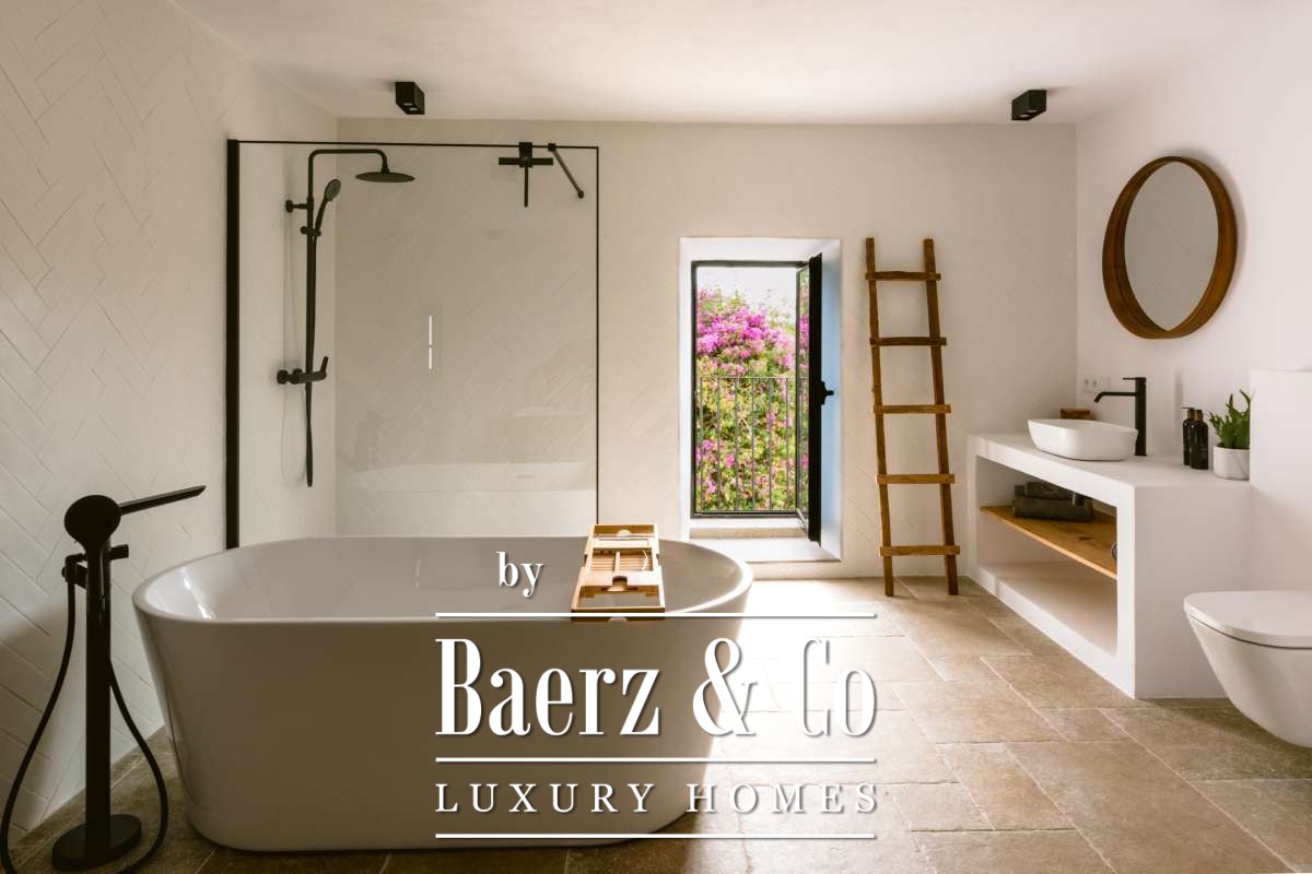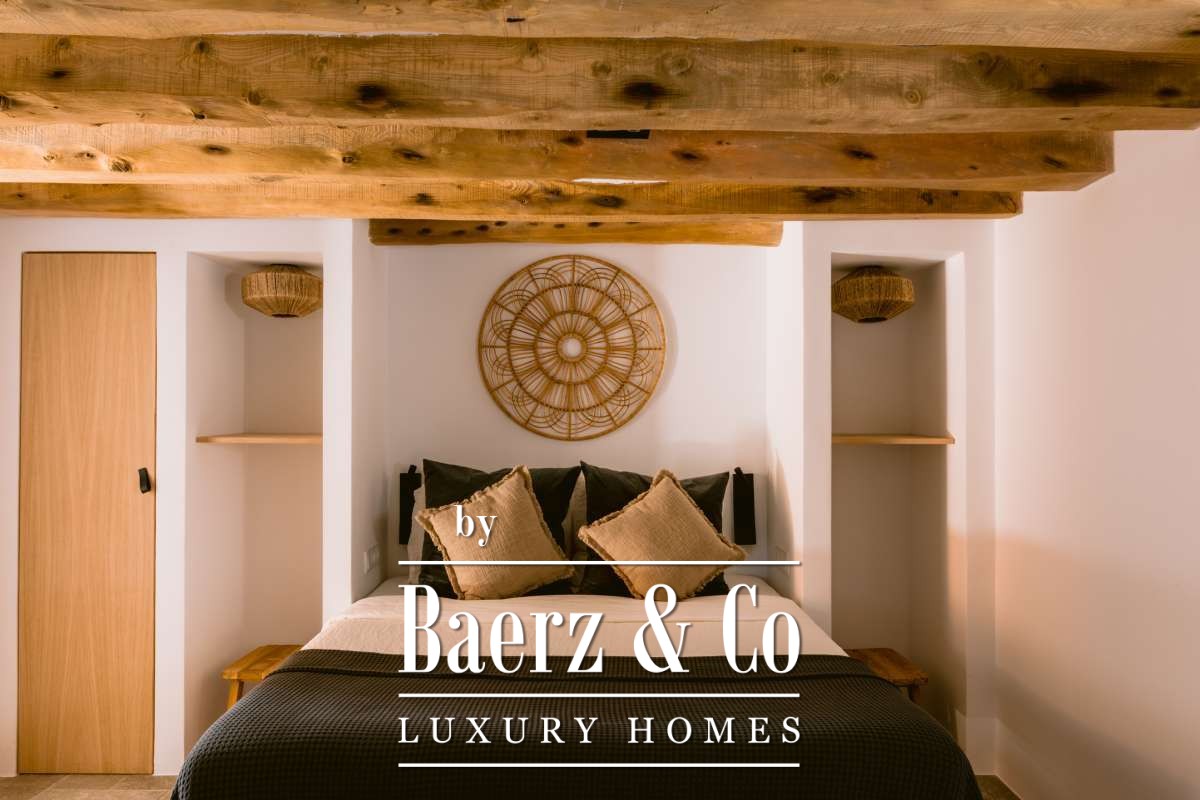 The casita is located about 50 meters in front of the main house, ensuring optimal privacy and providing an ideal space for renting out or hosting guests. Both the main house and the casita feature underfloor heating as well as air conditioning systems in each room, ensuring a pleasant temperature all year round. Both residences offer fiber optic high-speed internet and are equipped with modern alarm systems, guaranteeing a perfect connection and optimal security. On top of that, all inventory is included with this magnificent finca, making it a turnkey retreat, ready for you to move into.The outdoor spacesStepping into the garden, you will find several spacious terraces, a wonderful shaded al fresco dining area, and a sun-drenched swimming pool of over 90m², accompanied by comfortable loungers. The modern fence provides the privacy you desire, while the luxurious Ibicenco atmosphere is accentuated by the white-painted property and wooden garden furniture and decorations. The spacious land extending between the main house and the guest house is ideal for landscaping and surrounds both houses. In the garden of the main residence is an original monumental Ibicencan tower, which adds a historical touch to this beautiful property. Another special detail is the lighting design of the gardens. The path to the casita, for example, has discreet spotlights on the ground, showing you the way to this separate residence. This property offers traditional Ibiza allure combined with a modern luxury lifestyle.