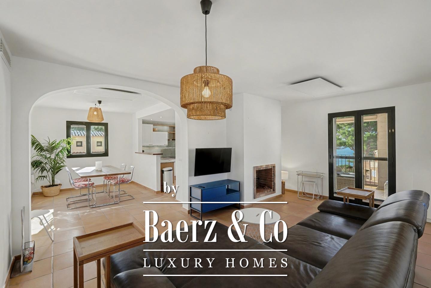 A generous entrance hall invites you into refined, luminous interiors. The living room, complete with fireplace, opens onto a terrace where the sea becomes a constant companion. An open-plan kitchen and dining area transitions to a second terrace for al fresco gatherings, connected by an exterior staircase to communal Mediterranean gardens and a pool.