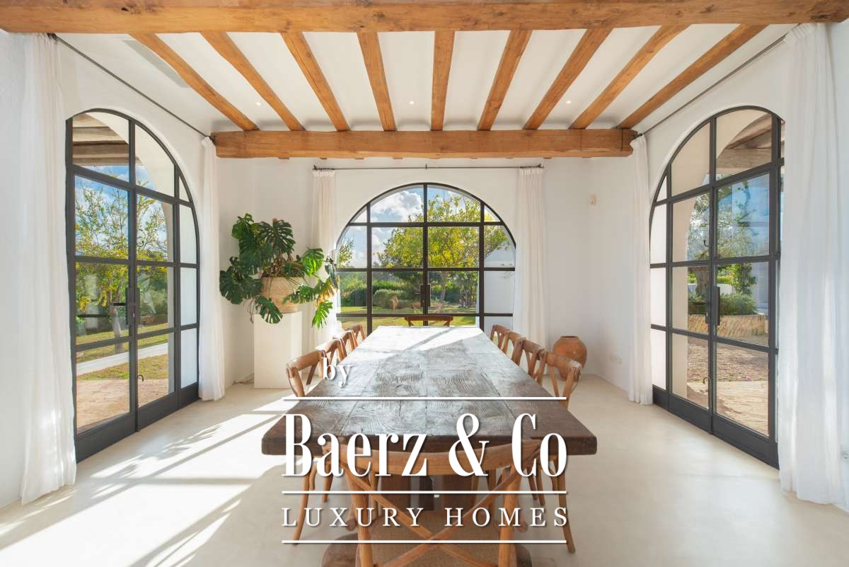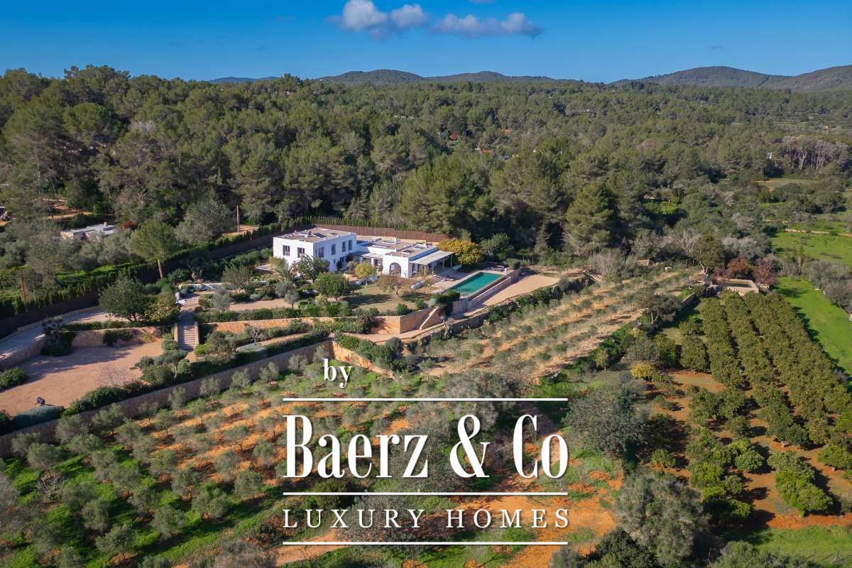 This farmhouse Sant Llorenç de Balàfia resides at the island’s highest valley point, where rolling agricultural land meets forest and mountain views. The property’s terraces open onto a tapestry of olive groves and fruit trees, with vistas extending to the church tower of Balafí and historic walls in the far distance. On the opposite side, the springs of San Rafael bring freshness to the landscape, softening the horizon. Quiet and privacy envelope this 24,215 m² estate, though Eivissa and Santa Gertrudis remain easily within reach.