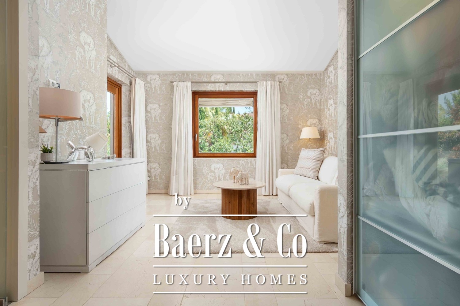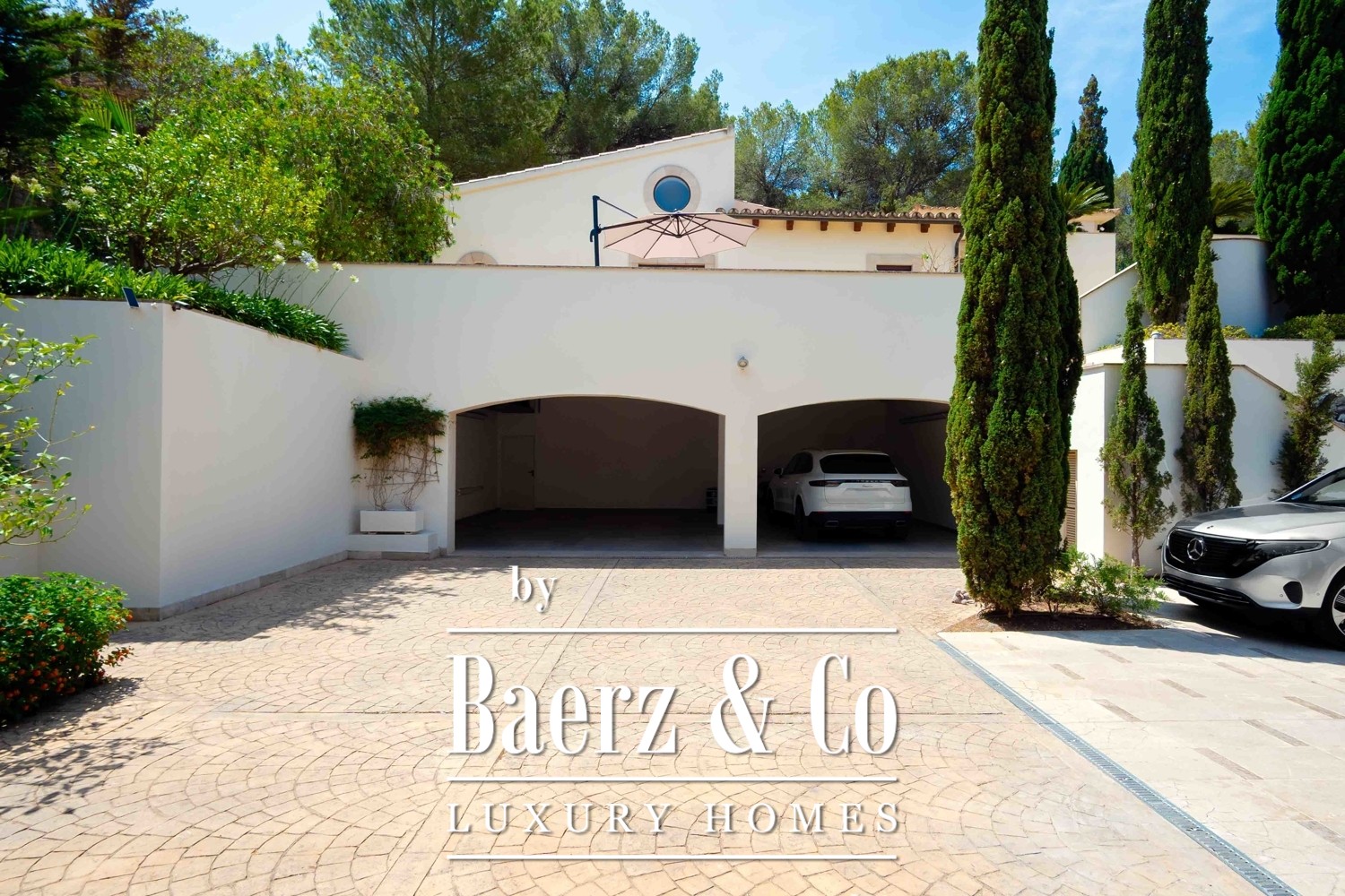 This luxury villa Santa Ponça is a statement of refined living within an exclusive gated community in Mallorca. Upon arrival, a private driveway unfolds through lush Mediterranean gardens, accommodating seven vehicles and an integrated electric charging station. The entrance signals both serenity and understated grandeur, inviting you into 851 m² of carefully composed interiors that allow light and space to define the experience.