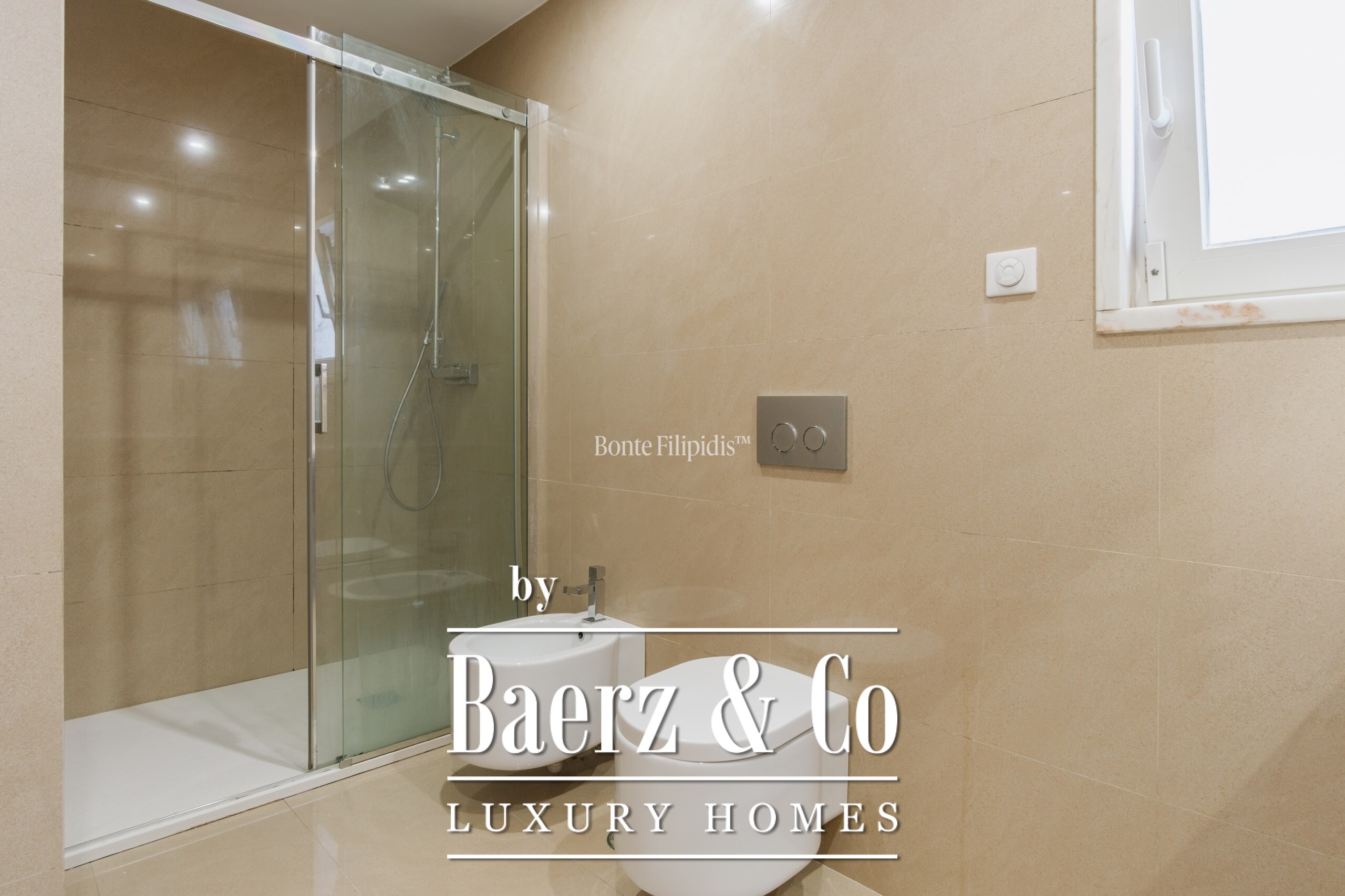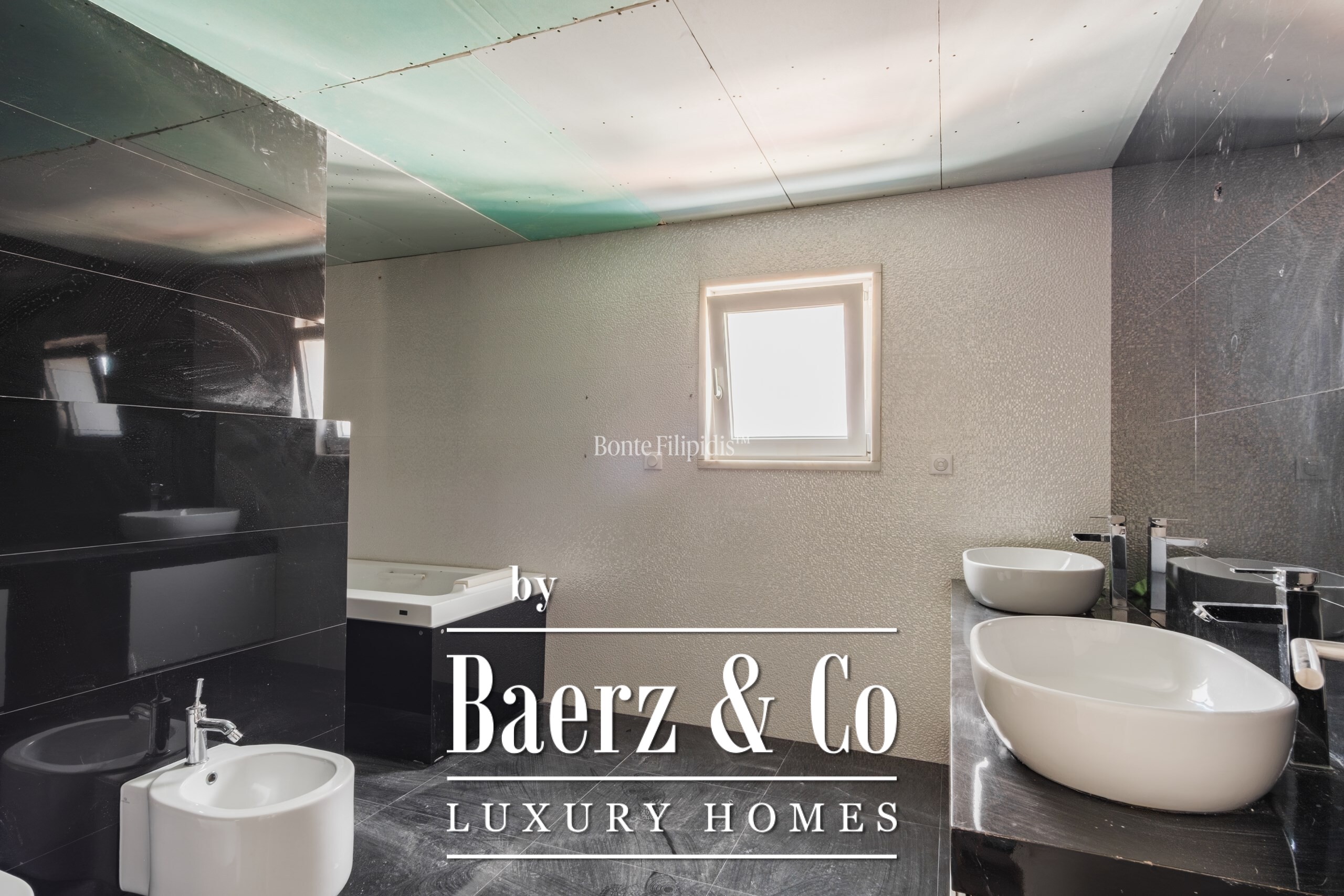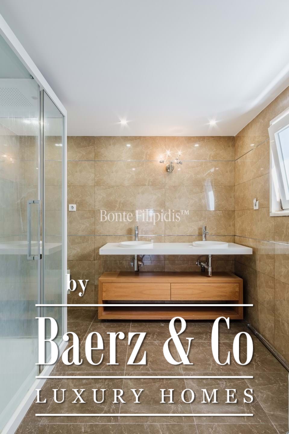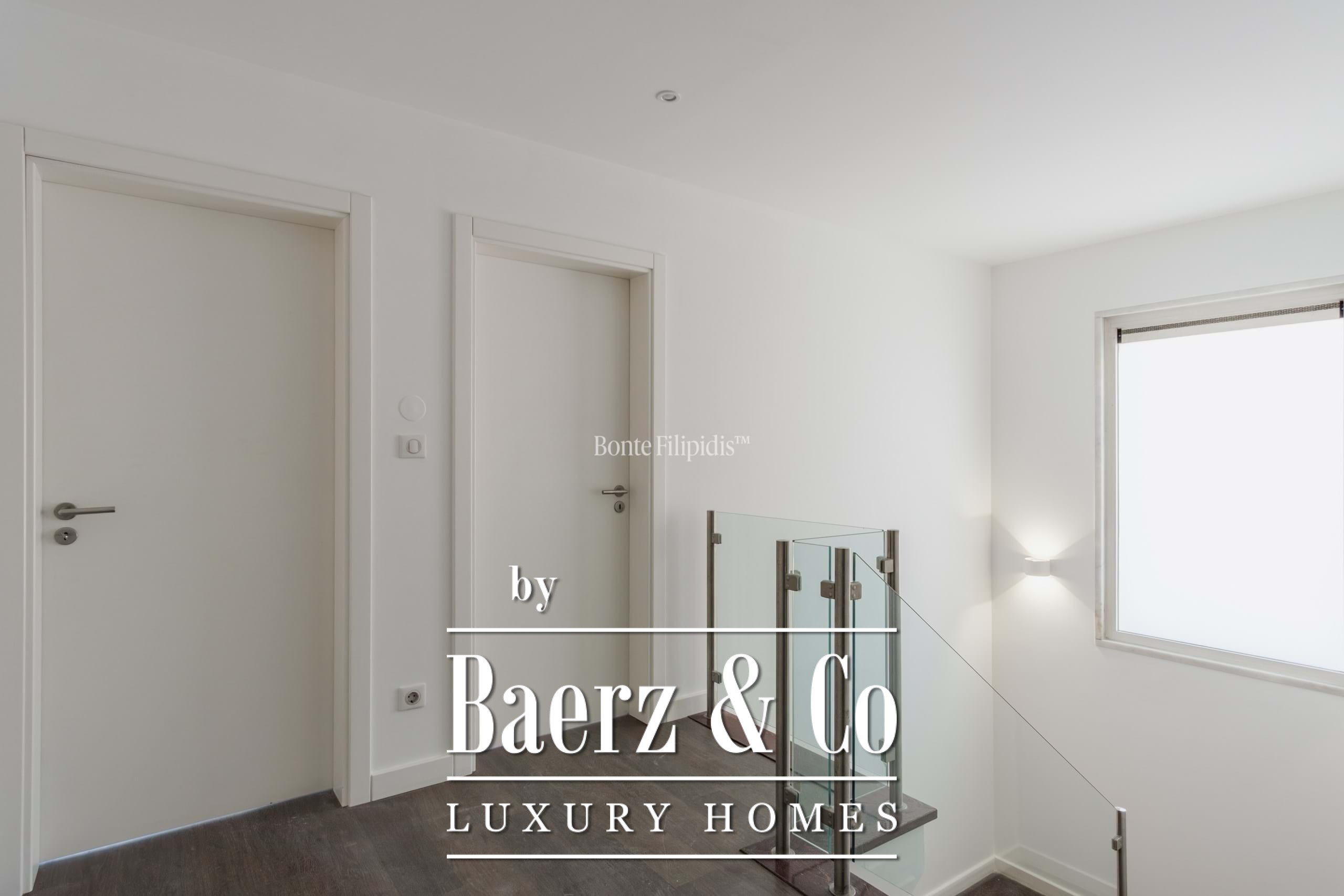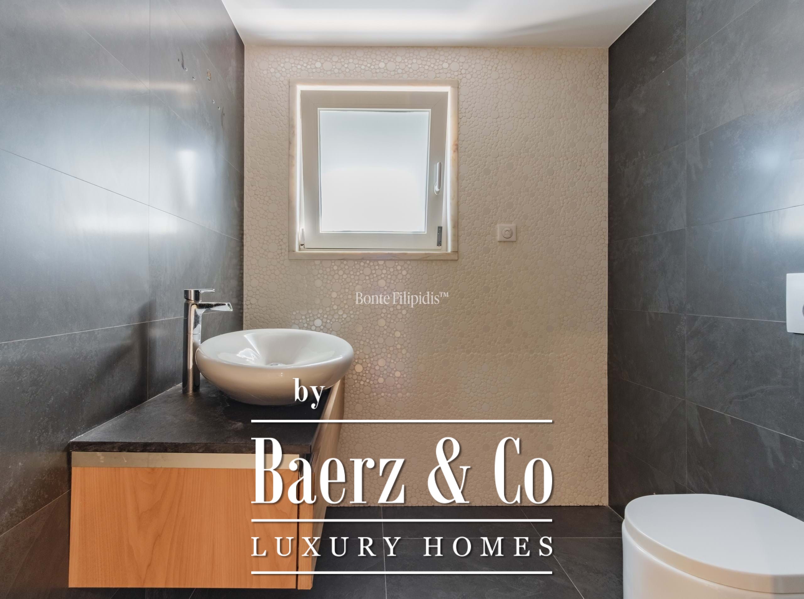 Underfloor heating runs throughout, providing comfort across every season. The villa features a private 35 m² swimming pool, a landscaped garden, and practical details including a garage for three vehicles plus an additional parking space. Four bathrooms balance function and privacy for family and guests.
