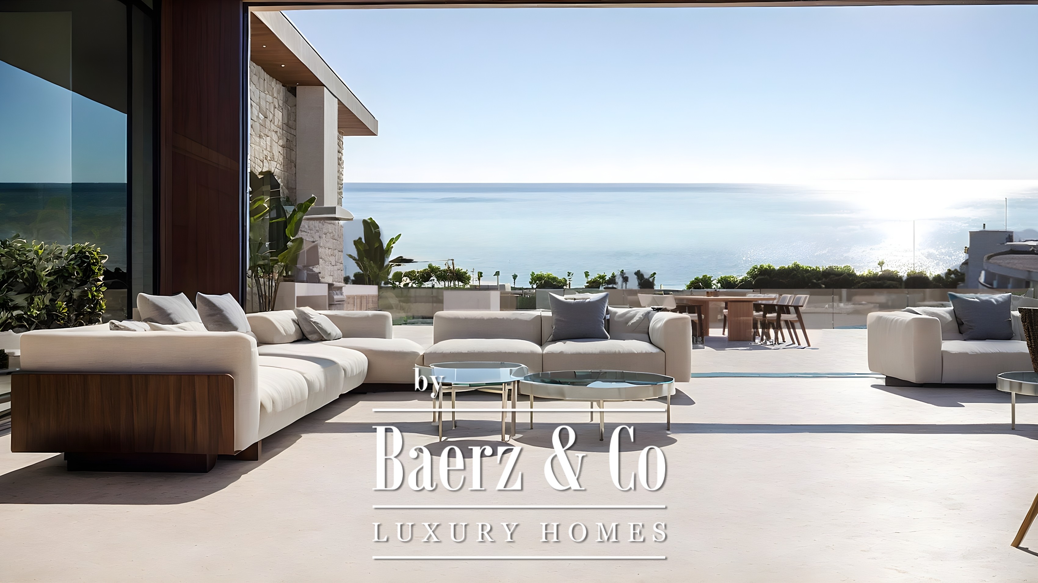 Upon entering, the main floor reveals a living room, dining area, and kitchen combining effortlessly across more than 150 m², all embracing garden and pool through expansive glass that dissolves boundaries between inside and out. Two master suites on this level each feature private bathrooms and dressing rooms. Upstairs, three further suites include a primary suite with a dedicated 42 m² retreat space and uninterrupted views across the Mediterranean.