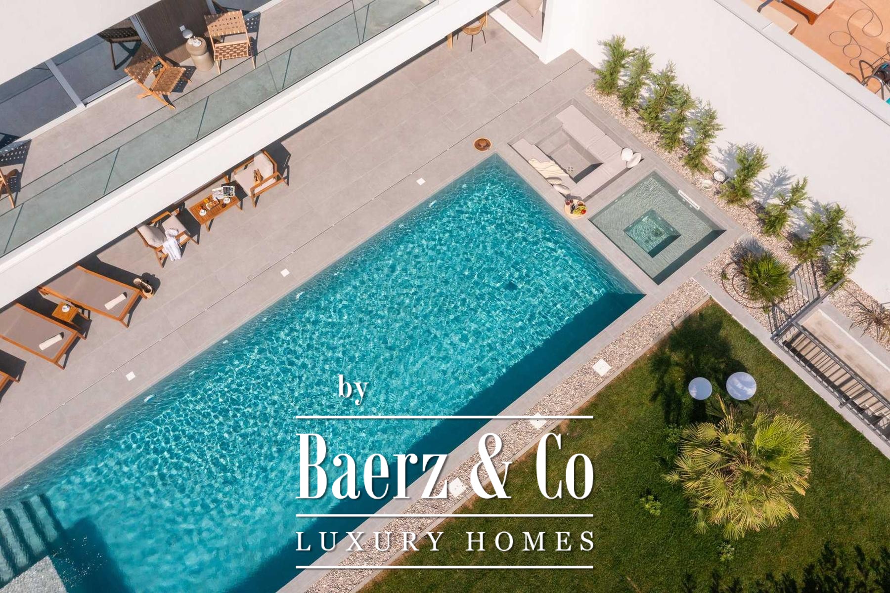 Ascending to the upper floor, four bedrooms each offer en-suite bathrooms, affording personal space and calm. Design details blend seamlessly with high-quality materials, evoking both comfort and clarity. Outdoors, the garden is fully fenced for peace of mind and features a children’s play area, bocce court, and private parking.