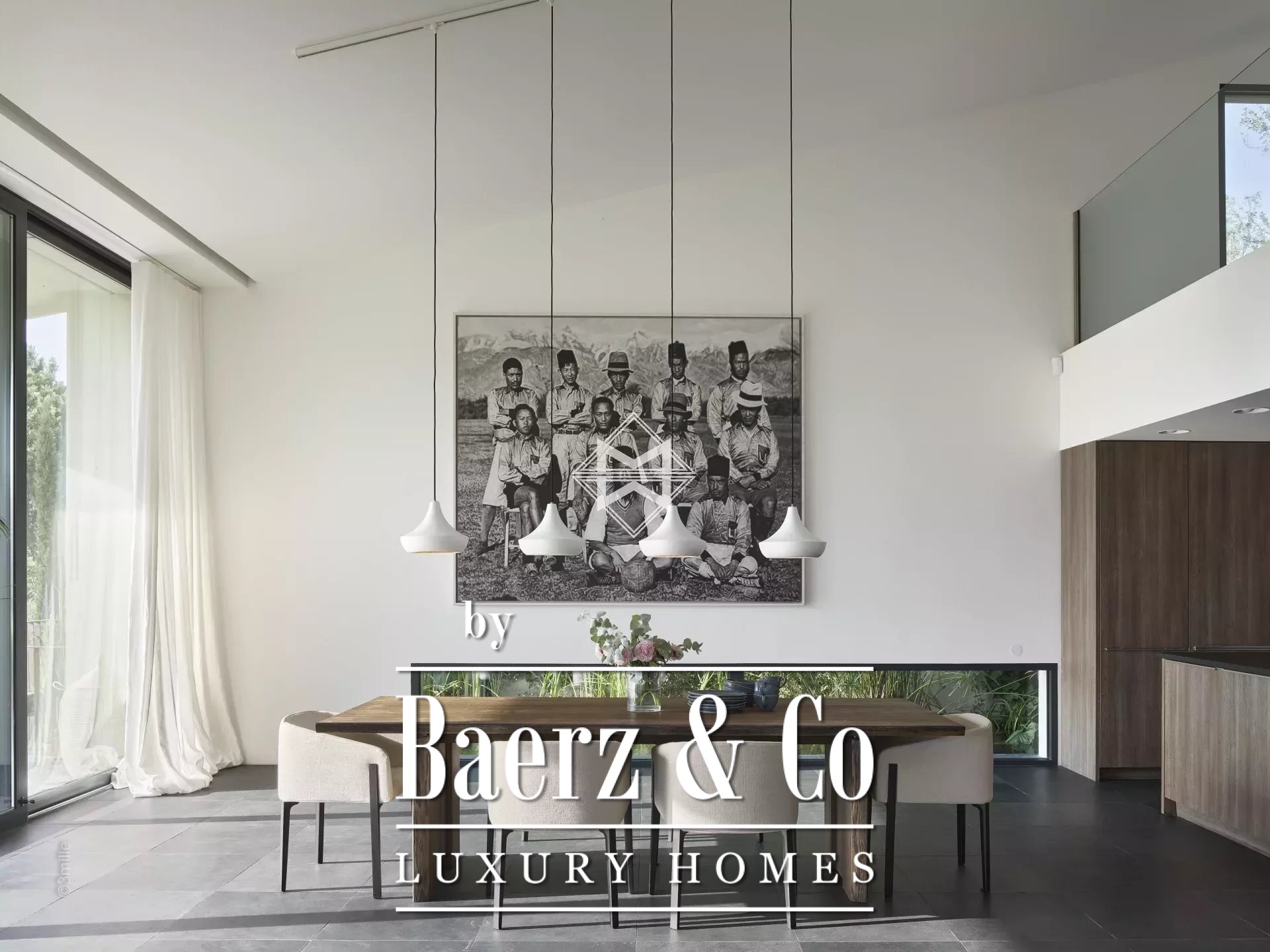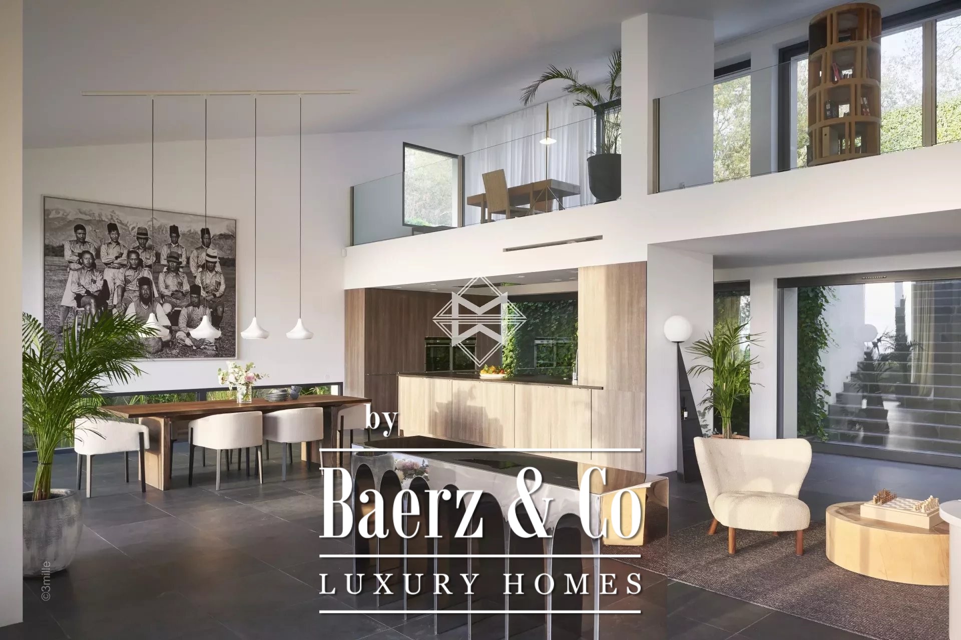 The villa’s upper grounds reveal an expansive grassed terrace and a striking 36-metre swimming pool, an ideal setting for gatherings and private events. Below, olive, pine, and fruit trees fill the landscape, their seasonal scents carried by the breeze. Inside, generous living spaces unfold through large bay windows, drawing in light and framing the natural panorama. A bright mezzanine offers a quiet office and reading area, set apart yet connected to the main living volumes.