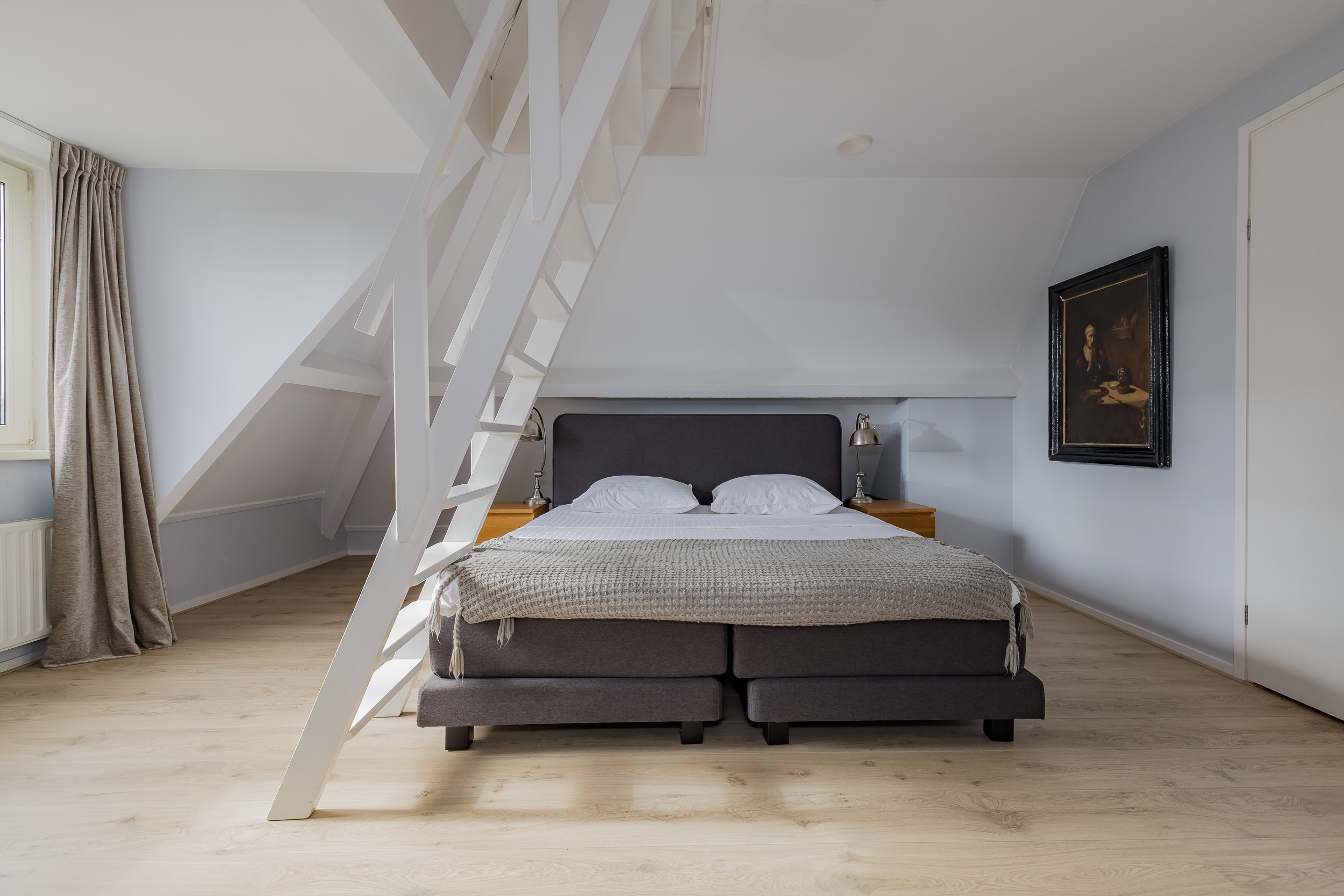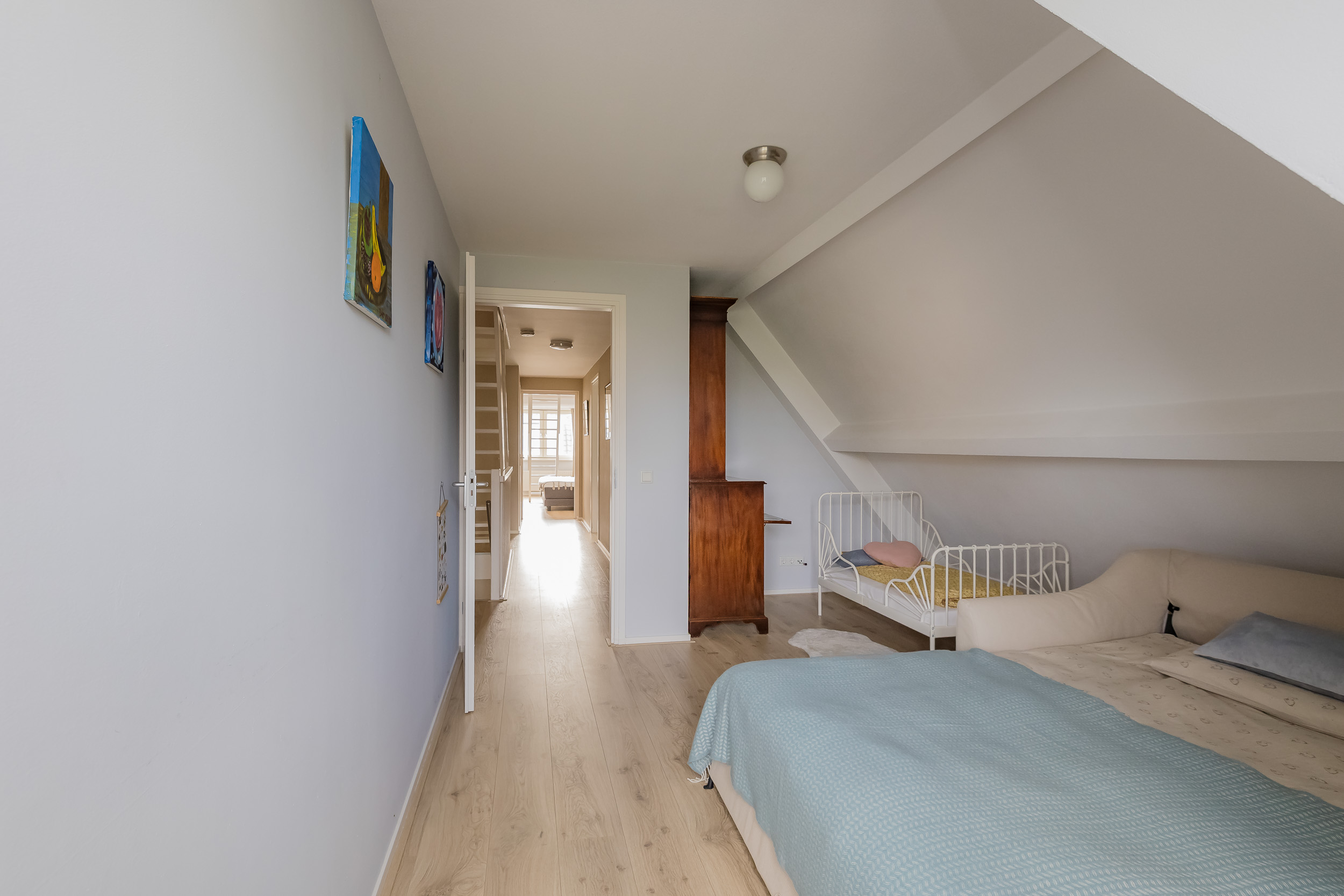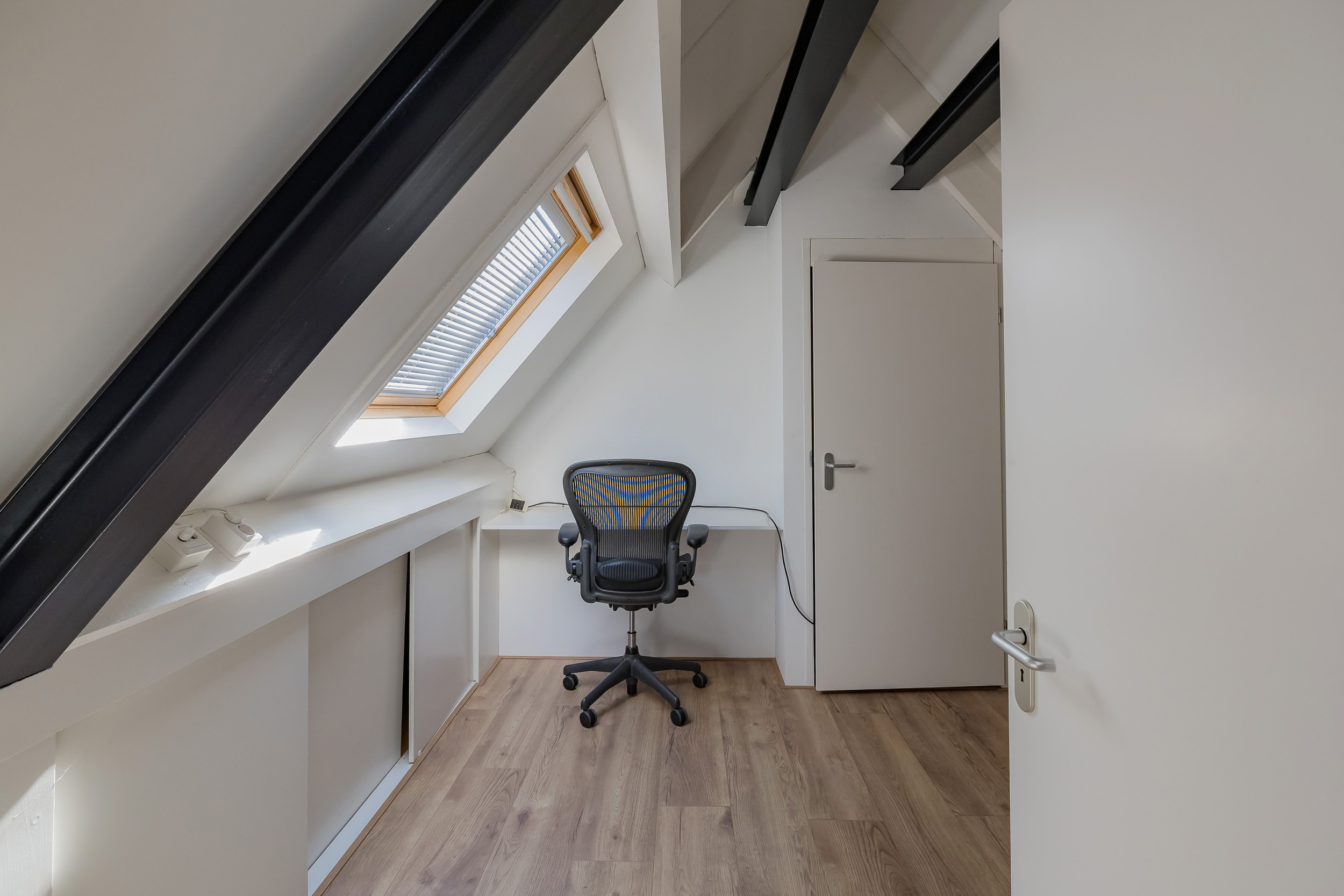 A fixed staircase leads to the second floor with two more (bed)rooms, which are currently used as office space. From the back room, you have access to the boiler room with central heating system (2016) and the heat recovery ventilation system.