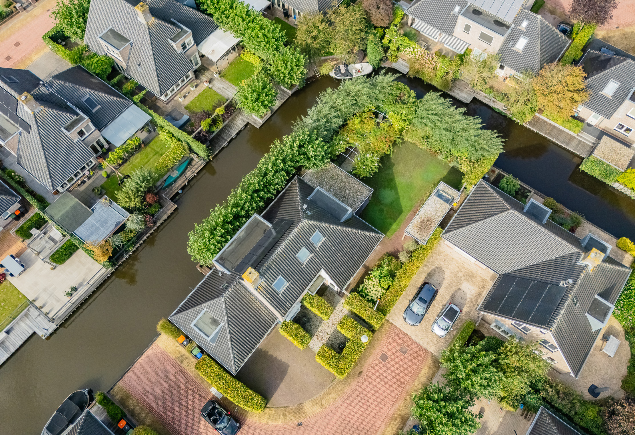 Built in 2004, living area 232m², volume 946m³, plot size 610m², + approx. 151m² of property in the jointly owned plot of 2,657m², consisting of navigable water and a ramp for sloops and boats.