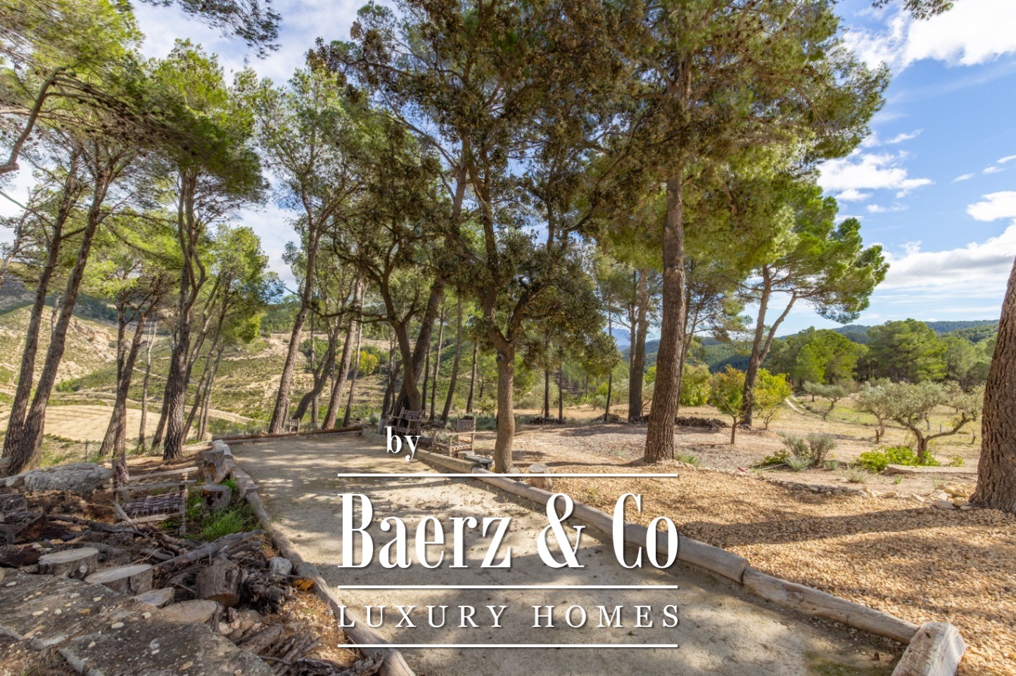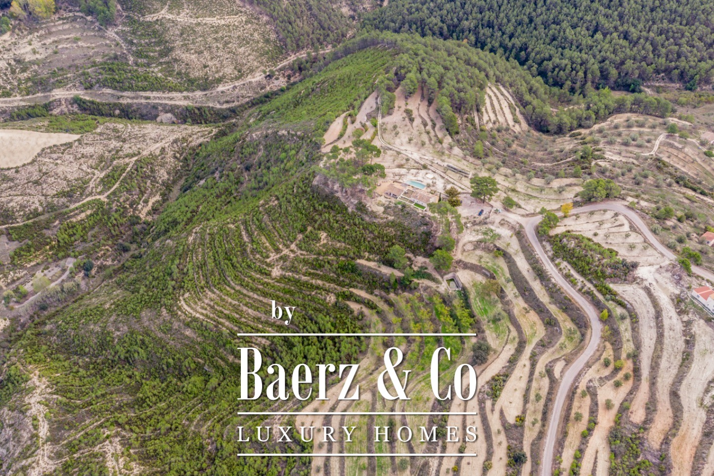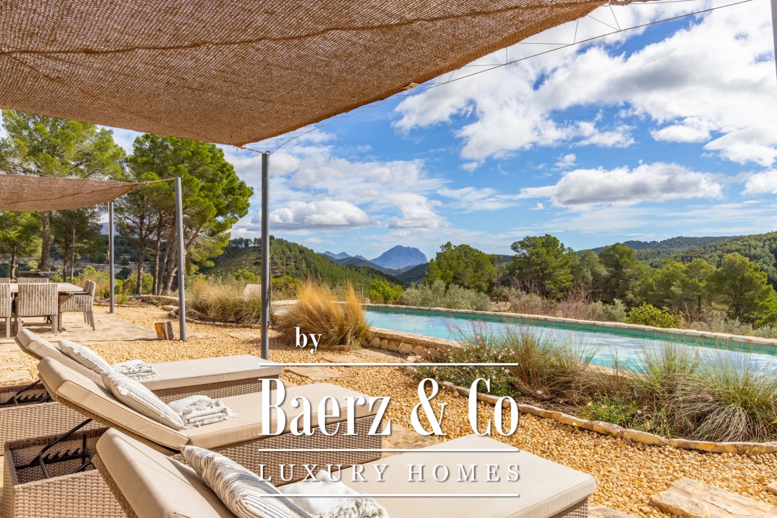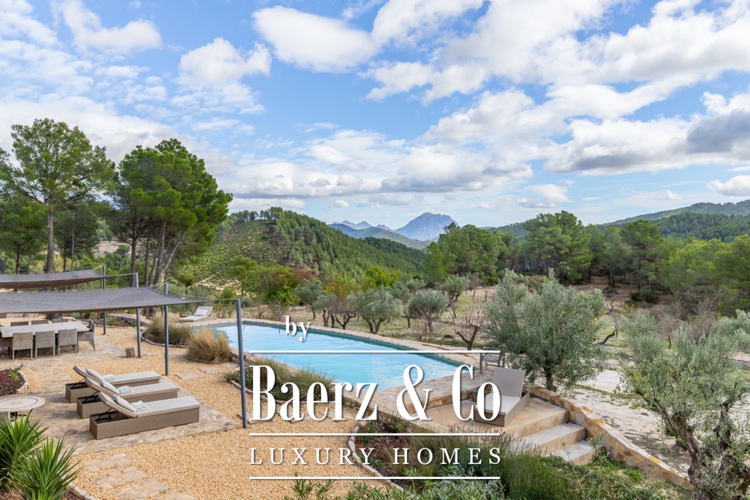 Finca Torremanzanas stands as a rare property type in one of Spain’s most tranquil inland regions. Set on 18 hectares of lush, Mediterranean land at 850 meters altitude, this beautifully revived estate is just 3 km from the village of Torremanzanas and offers panoramic views of Puig Campana. Thoughtfully renovated in 2022, the 450 m² main house merges refined modern finishes with authentic Mediterranean character. Each living space is bright and elegantly restrained, opening to a landscape planted with olive, almond and walnut trees.