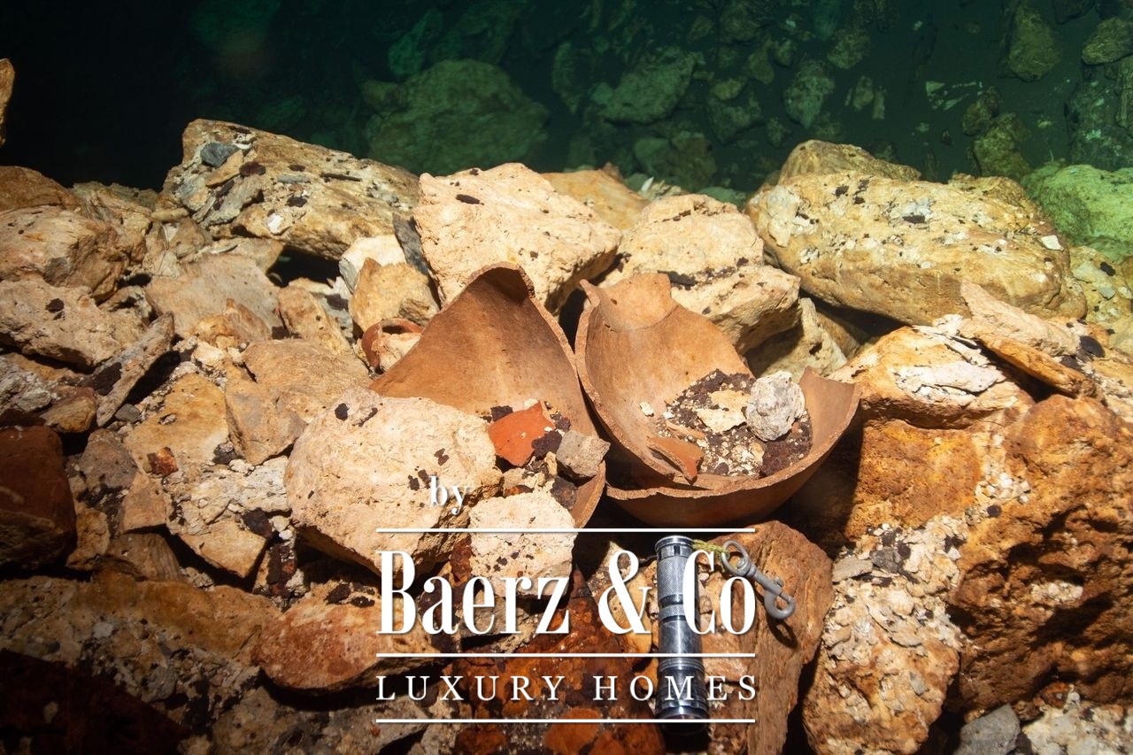 Natural elements are central to its appeal. The land contains a rare rejollada, a limestone formation creating a singular microclimate and landscape for climbing, hiking, and eco experiences scarcely found elsewhere. Beneath the property, a large underground cenote of roughly 55 meters in diameter and 60 meters in depth adds historic significance and avenues for research, having yielded Mayan artifacts during professional explorations. Water access is reachable at 18 meters, highlighting the property’s sustainability.