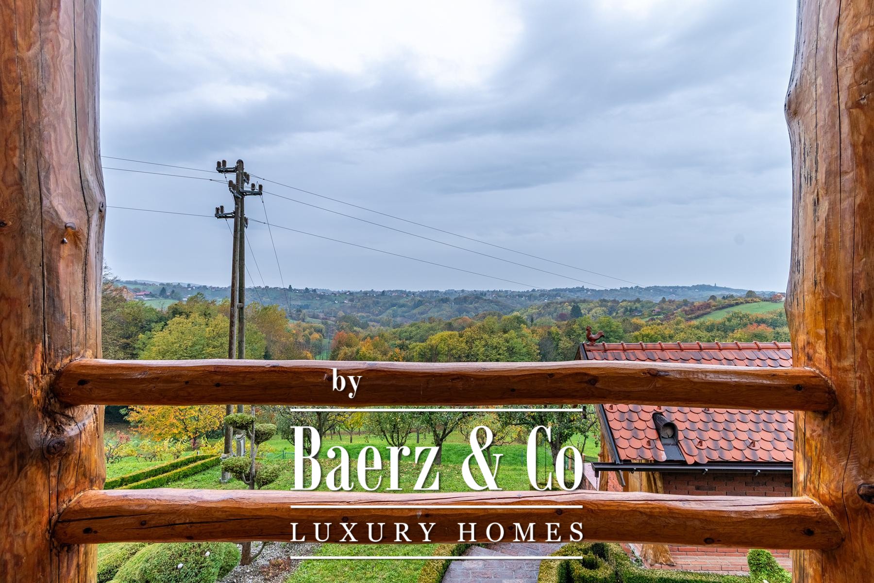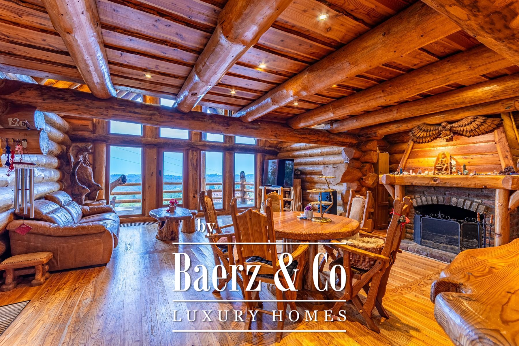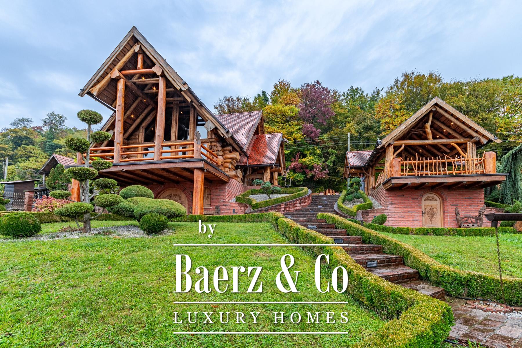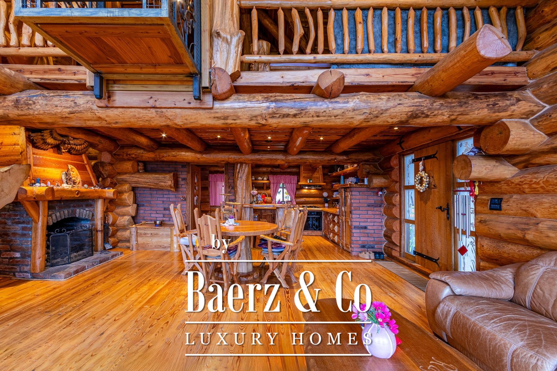an outdoor toilet. This unique log house, considered by many as one of the most beautiful in Europe, offers more than just a property - it provides an experience.Set on a 3,500 m² plot surrounded by forest and vineyards, the property boasts carefully landscaped grounds. It offers complete privacy, breathtaking panoramic views, and a lush green oasis with a variety of fruit trees - apples, plums, figs, aronia, raspberries, and many more.For more information or to arrange a viewing, please feel free to contact us.