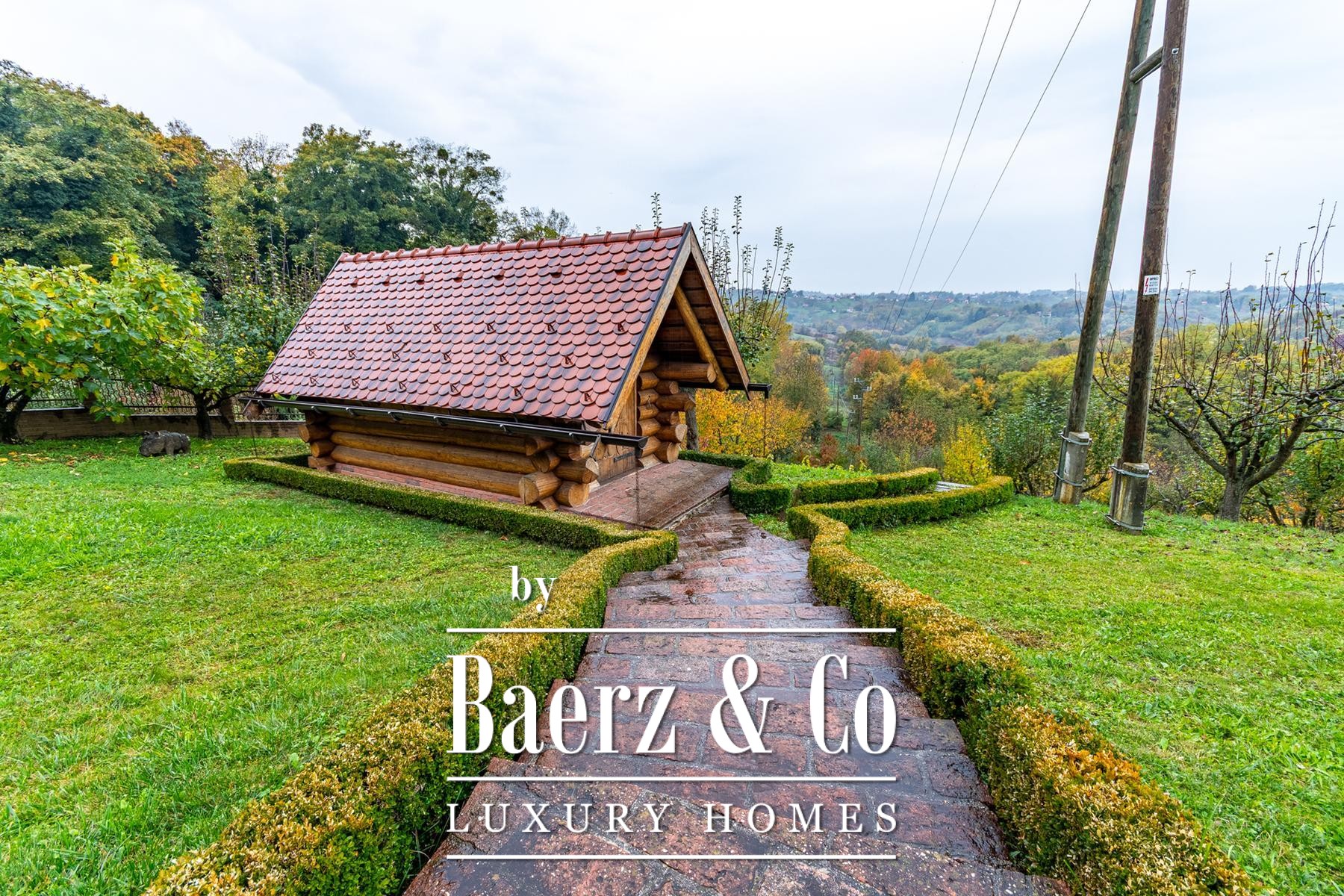 Varaždinske Toplice, Martinkovec, a luxurious estate ready to move in.The wooden house, with a total area of 190 m², consists of a ground floor and a gallery accessible by a lift. The entrance area includes a dining room, kitchen, bathroom, and a living room with access to the terrace. On the gallery, there is a bedroom and a wardrobe. The basement features a fitness area, kitchen, dining space, relaxation corner, wardrobe, and laundry room.The estate also includes three auxiliary buildings - a gazebo, a workshop, and
