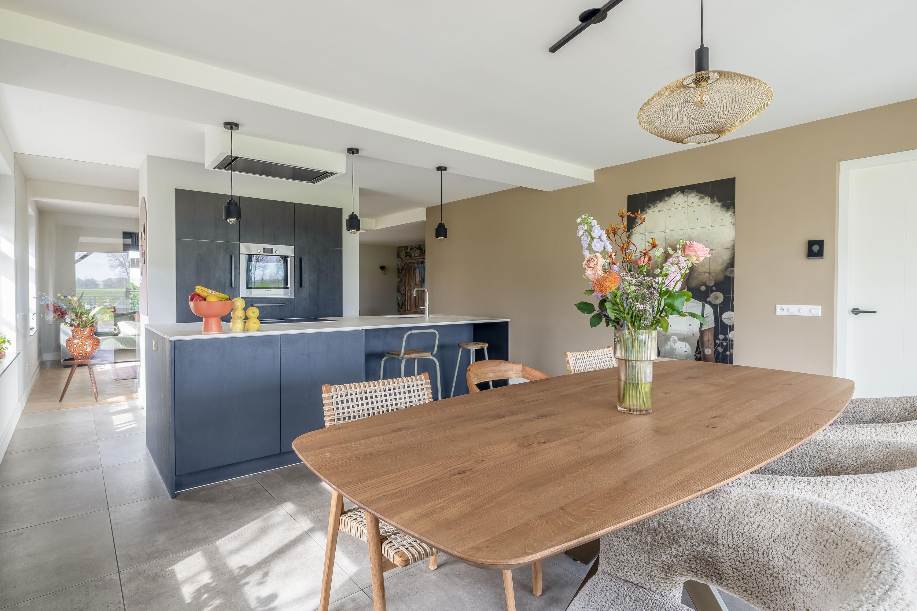 With a living area of 226 m², the property offers a comfortable and move-in ready living space. The living areas are spacious and light, flowing logically into one another. The layout is well thought-out, featuring, among other things, a kitchen-diner and a bedroom on the ground floor. Upstairs, there are three spacious bedrooms and a modern bathroom, where exposed timber structures contribute to the atmosphere and authentic character of the whole.