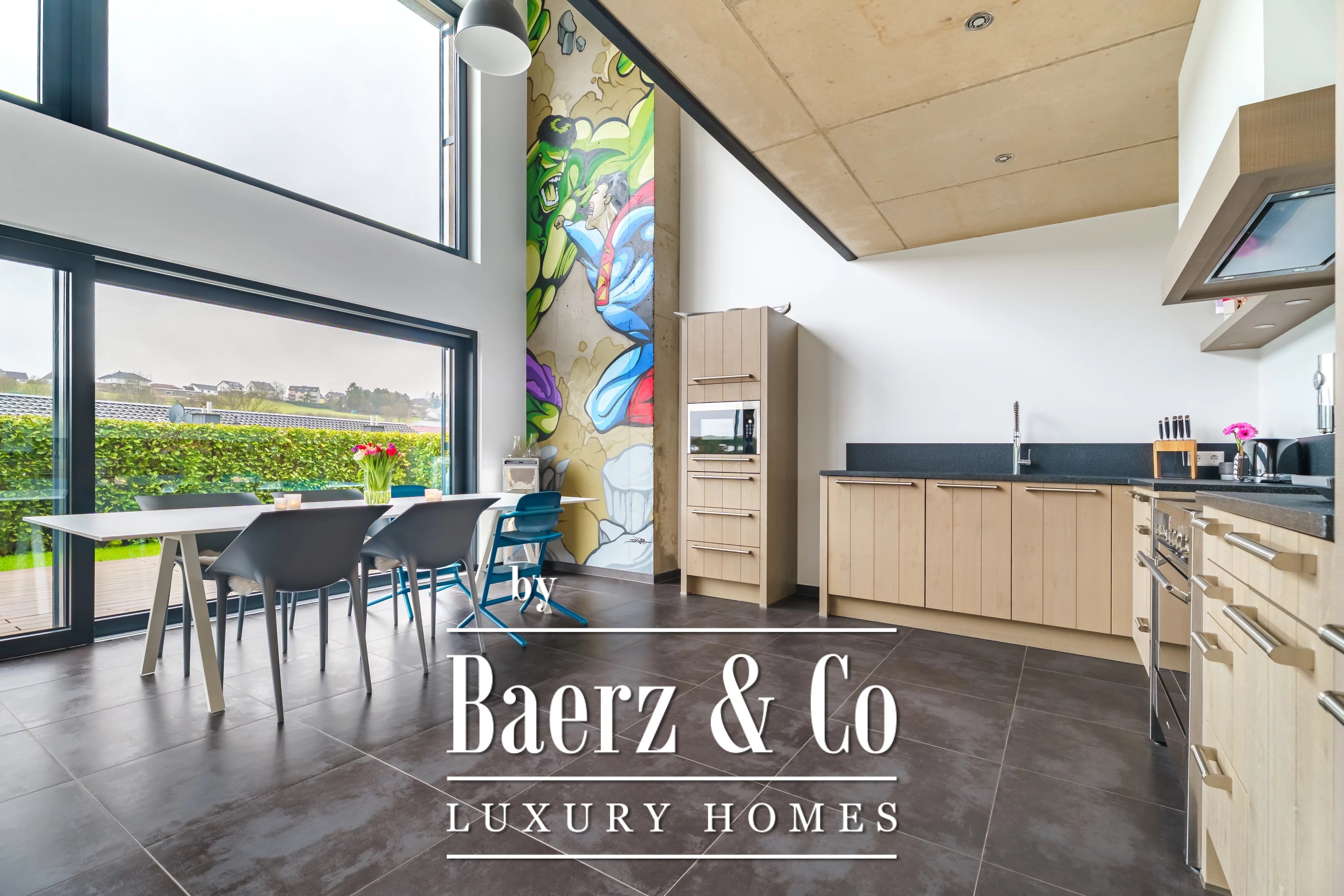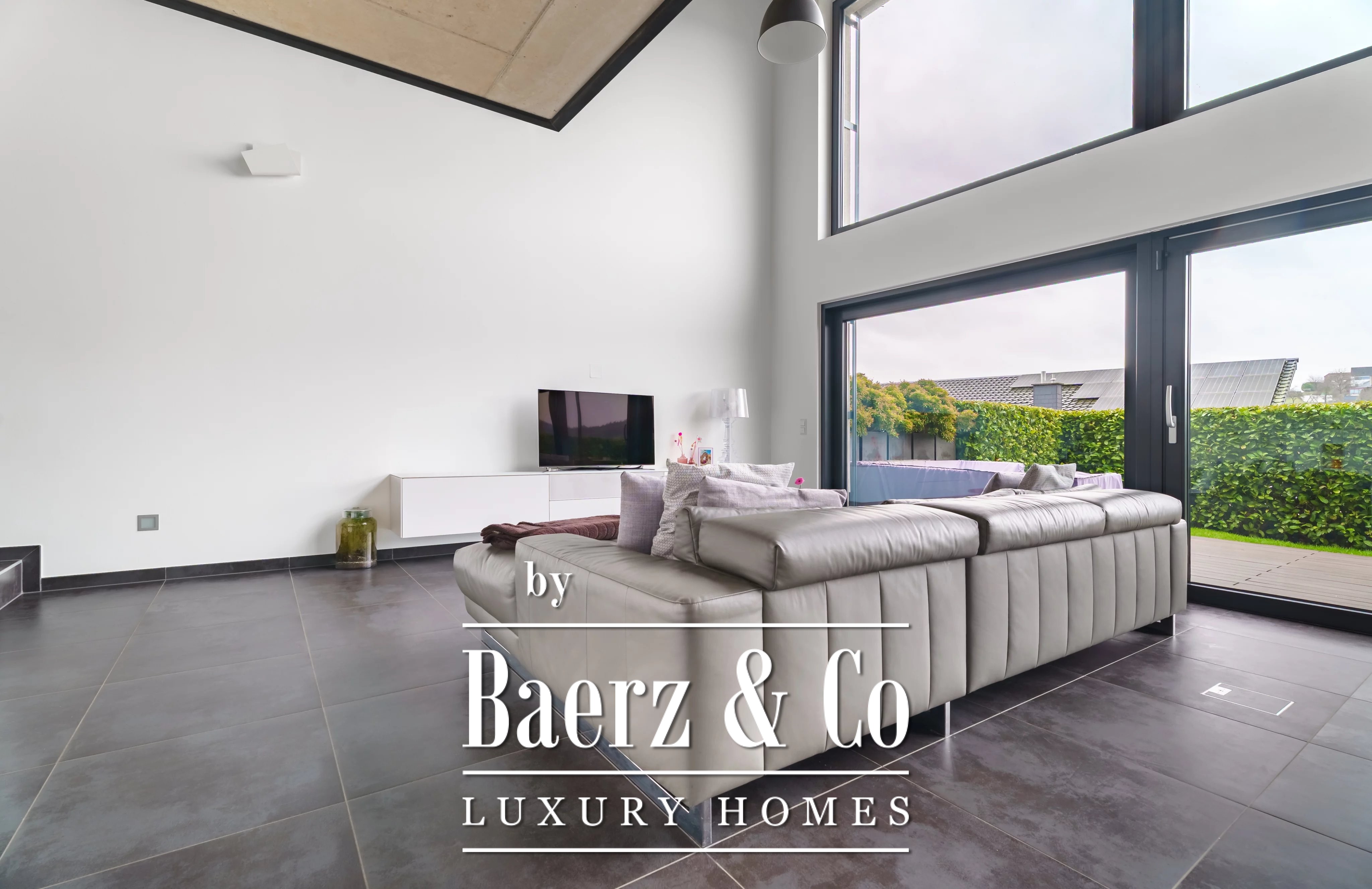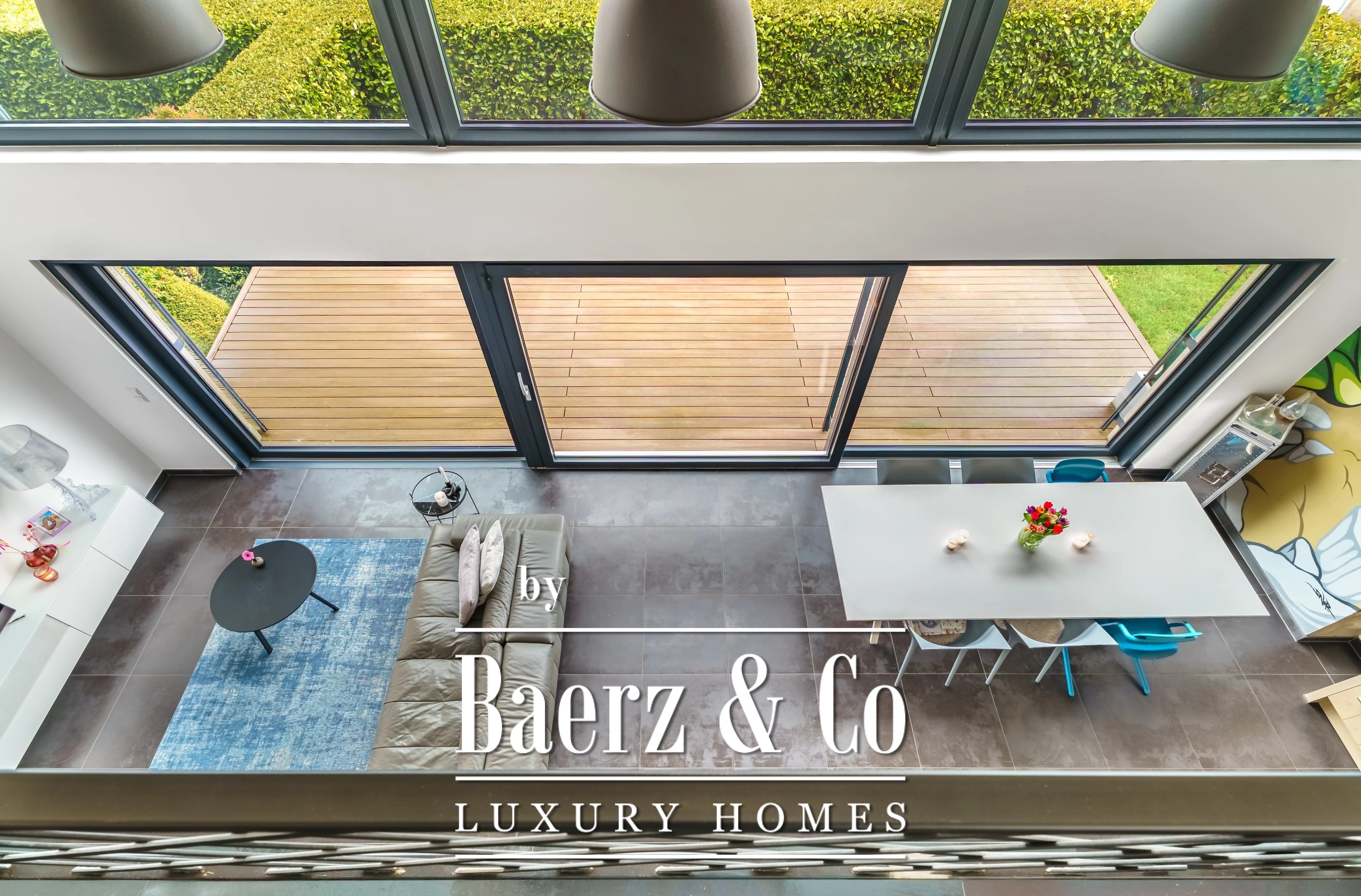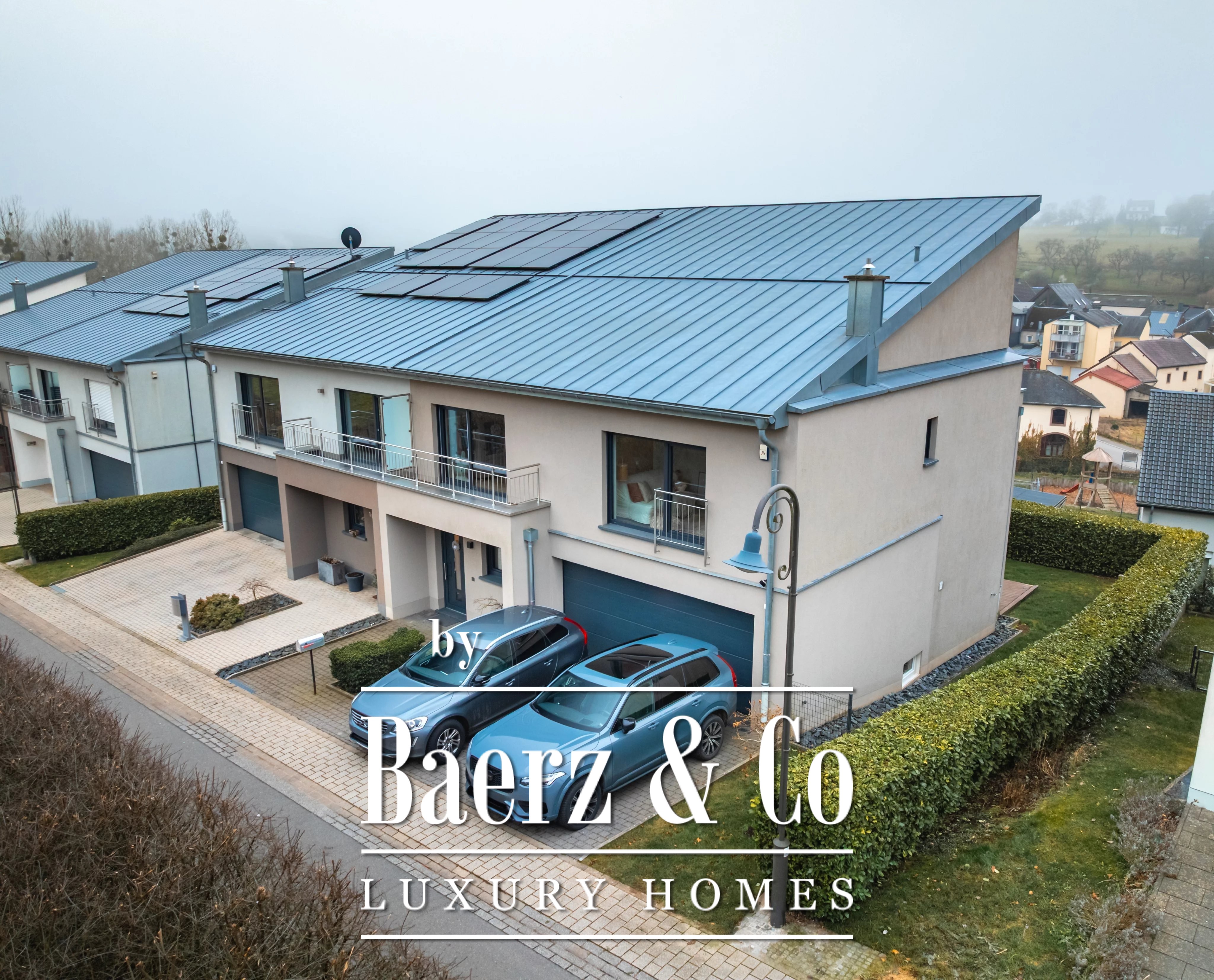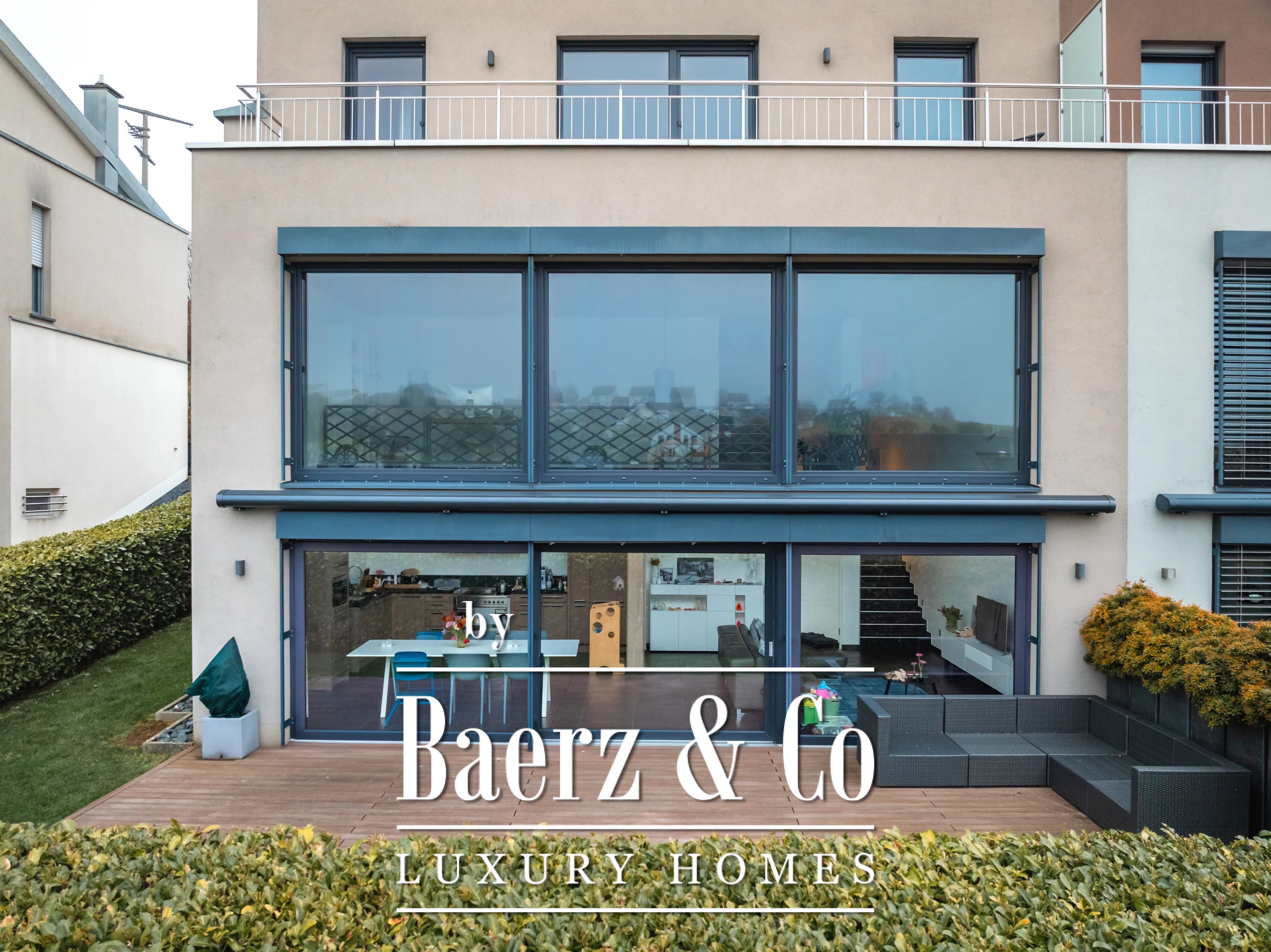 Privacy and security are paramount, further underscored by optical fiber and outdoor lighting. Set on a 348 m² plot with village views, the residence articulates light, space, and discretion for those seeking a prestigious modern retreat in Luxembourg.