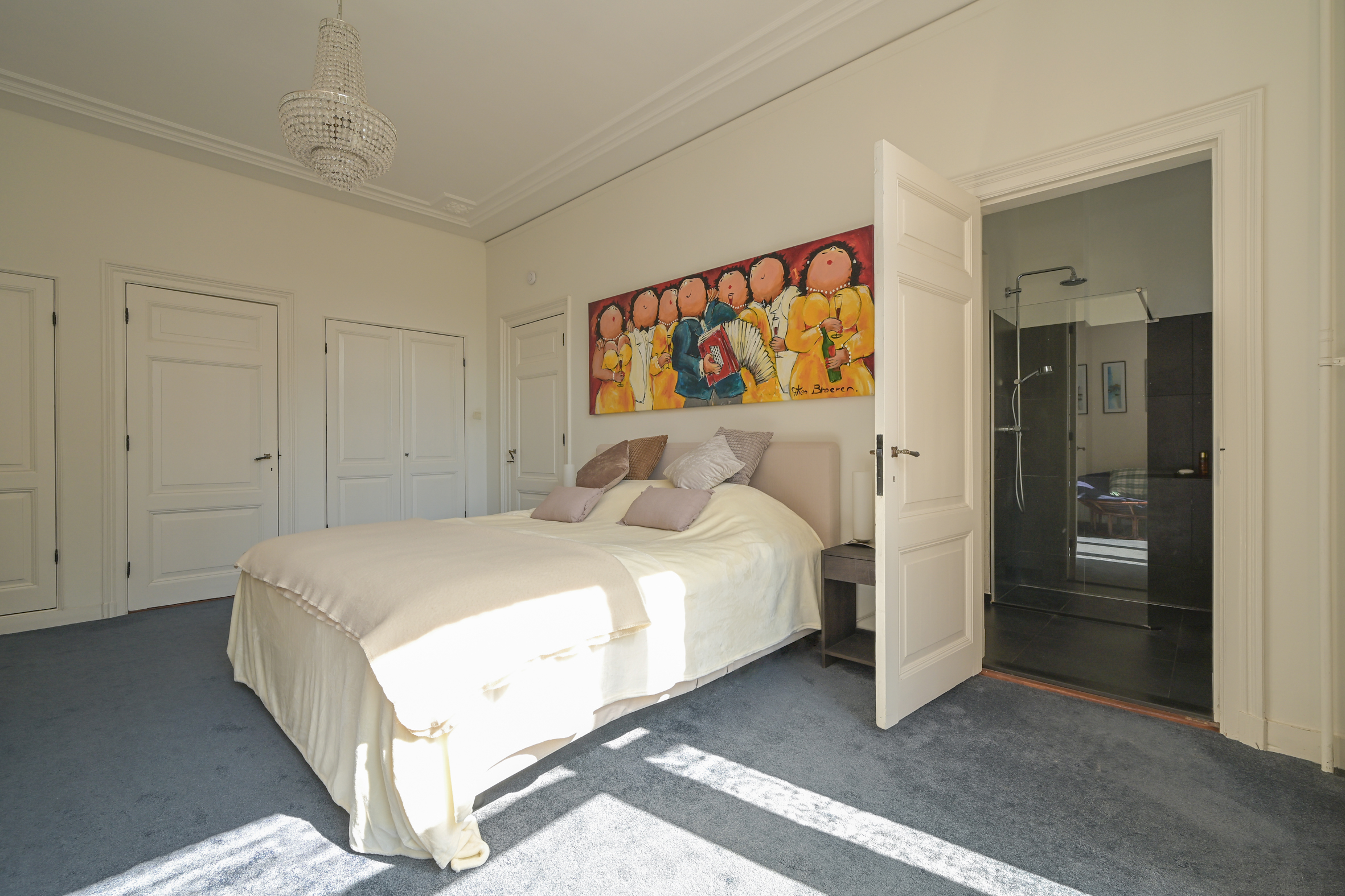De fraaie trap leidt naar de overloop met moderne wc met fonteintje, de voorkamer biedt vrij zicht en heeft een fraaie parketvloer, hoog plafond met lijstwerk, marmeren schouw en ingebouwde kasten. De voorzijkamer is thans in gebruik als inloopgarderobekamer maar kan ook als studeerkamer of extra slaapkamer fungeren. De achterkamer heeft eveneens ingebouwde kasten, een fraai plafond en marmeren schouw en biedt enerzijds toegang tot het ruime achterbalkon en anderzijds toegang tot de moderne badkamer met design ligbad, dito wastafels met ombouw en inloopdouche. De badkamer is voorzien van elektrische vloerverwarming en is ook vanaf de overloop bereikbaar.