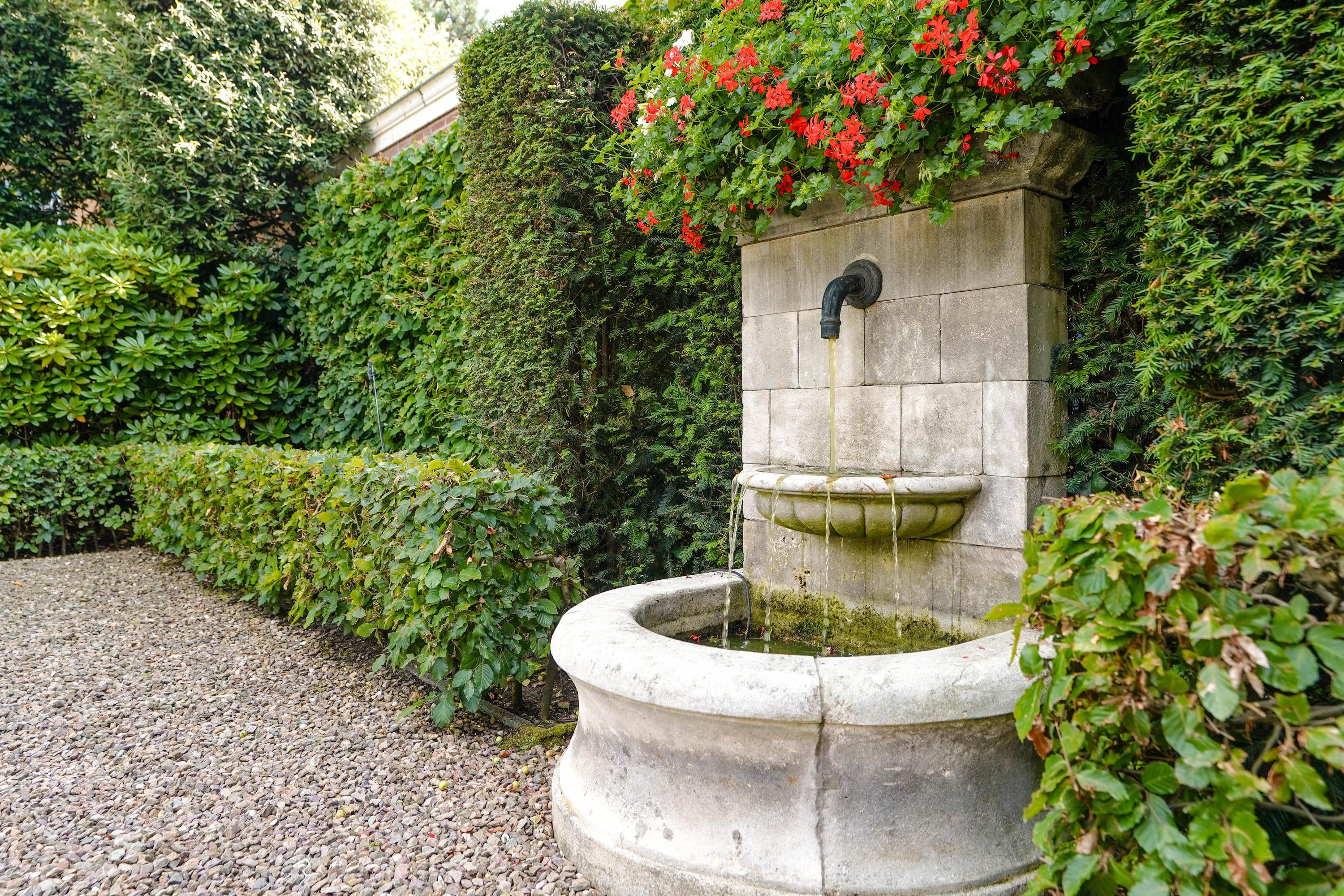 The 46 m² terrace is perfect for sunbathing or entertaining. In summer, the iron gazebo becomes a floral paradise with climbing roses and hanging baskets, ideal for alfresco dining. Two fountains—a French one to the right and a smaller Italian one by the terrace—add a refreshing touch. Bronze sculptures are available separately for purchase.