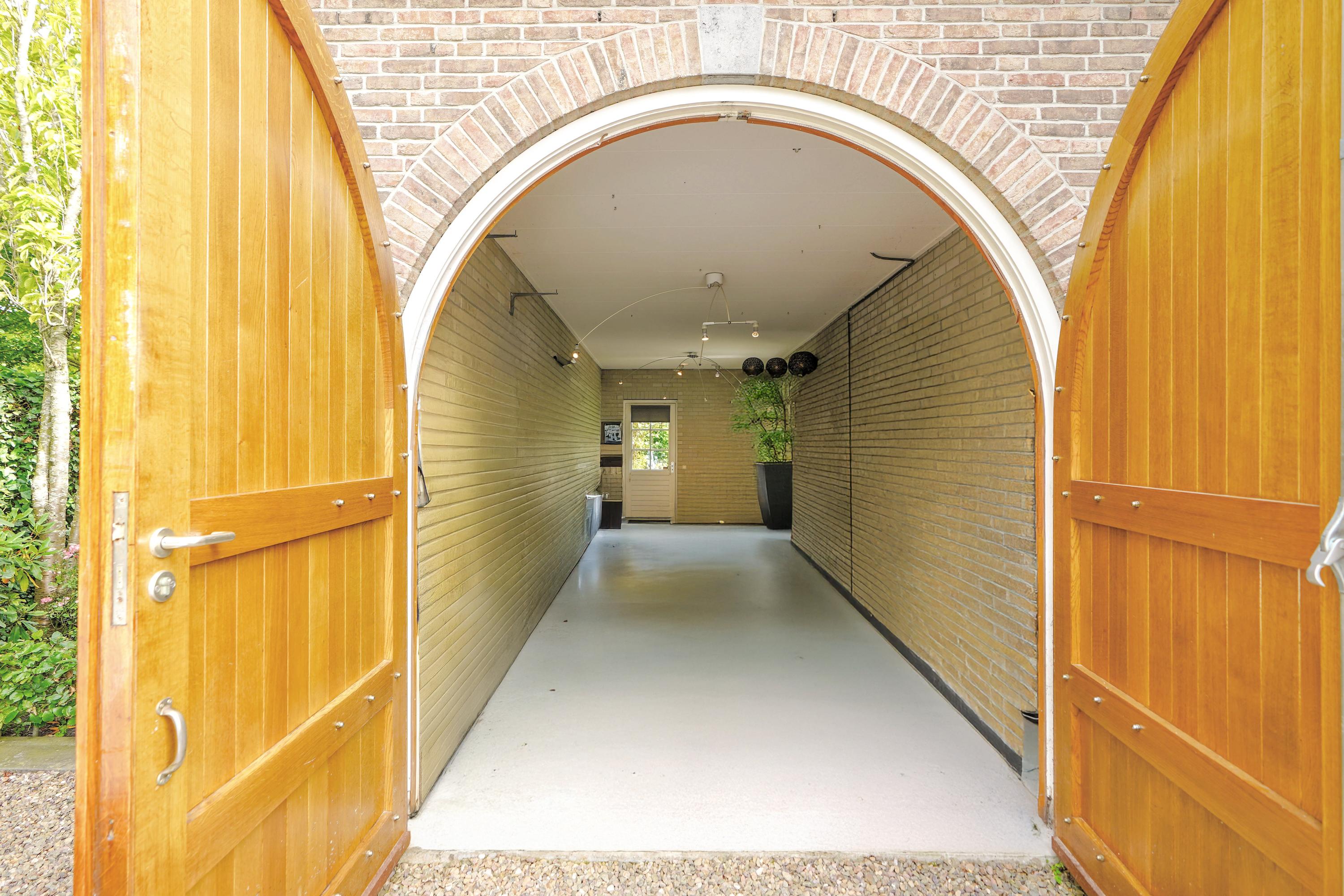 This villa is far from a standard design. Its uniqueness is immediately apparent from the four arched floor-to-ceiling windows and the curved glass facade of the central bay. This bespoke, country-style home is filled with exclusive details: brick cornerstones, a robust oak front door with custom wrought iron hardware, heavy arched "stable doors" on the garage, and elegant chimney and fascia detailing. The hand-formed brickwork and ceramic roof tiles were carefully selected. A satellite-controlled clock on the front gable automatically switches between summer and winter time.