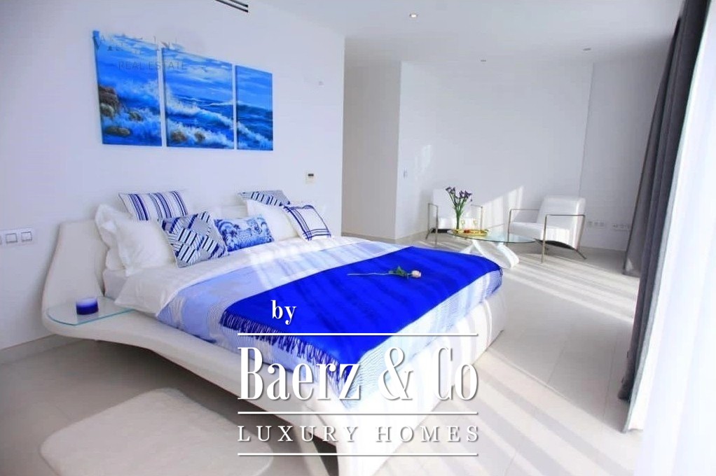 Op de bovenverdieping is de master suite een waar toevluchtsoord. Met zijn privéterras en ononderbroken uitzicht op zee biedt deze suite u een vredige ontsnapping, compleet met een moderne en suite badkamer.