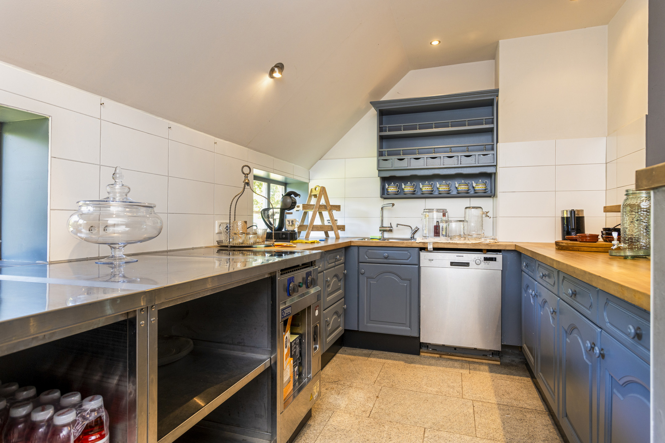 De keuken is een echt uit de kunst: geheel op maat gemaakt en samengesteld door een keukenstudio. De grote keuken is voorzien van zware eikenhouten fronten en granieten werkbladen. Alle inbouwapparatuur is van Gaggenau, wat garant staat voor optimaal design en functie. Er is een apparatenwand met dubbele ijskasten en een stoom- en een heteluchtoven. Aan de andere kant, met uitzicht op het zonnige zijterras een groot werkblad met dubbele spoelbak en een vijf-in-één kokendwaterkraan. Op de kop, in de eigentijdse koof, het fornuis met wokbrander, plancha en vier grote gaspitten.