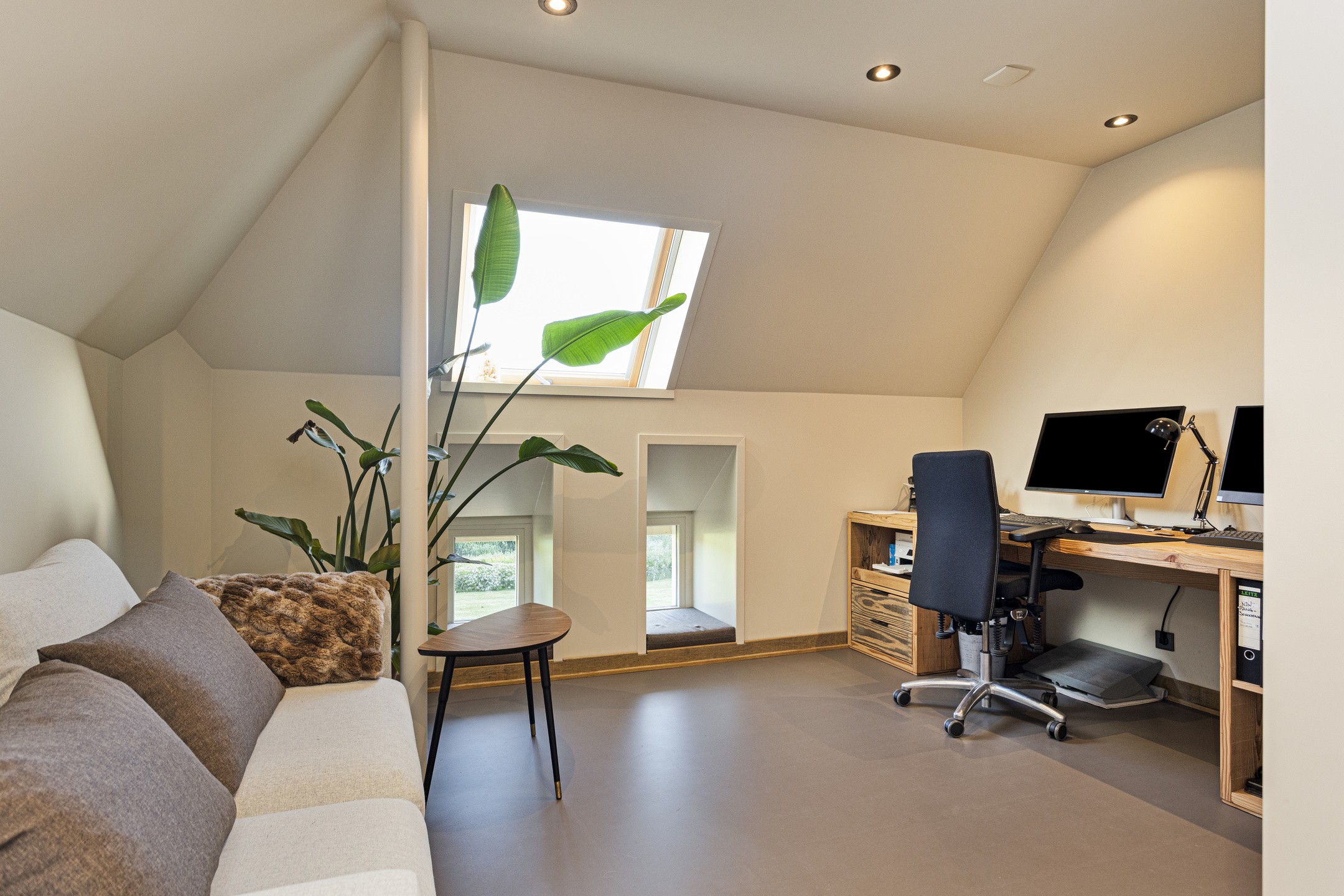 Aan de andere kant onder de kap treffen we de tweede slaapkamer, nu in gebruik als werkkamer.