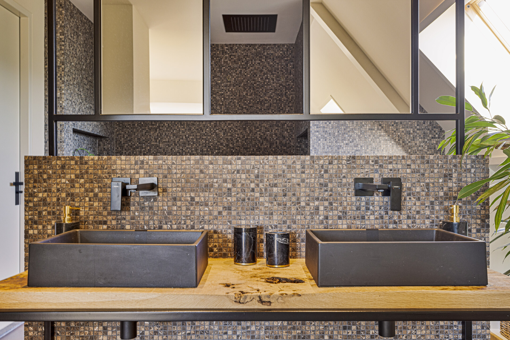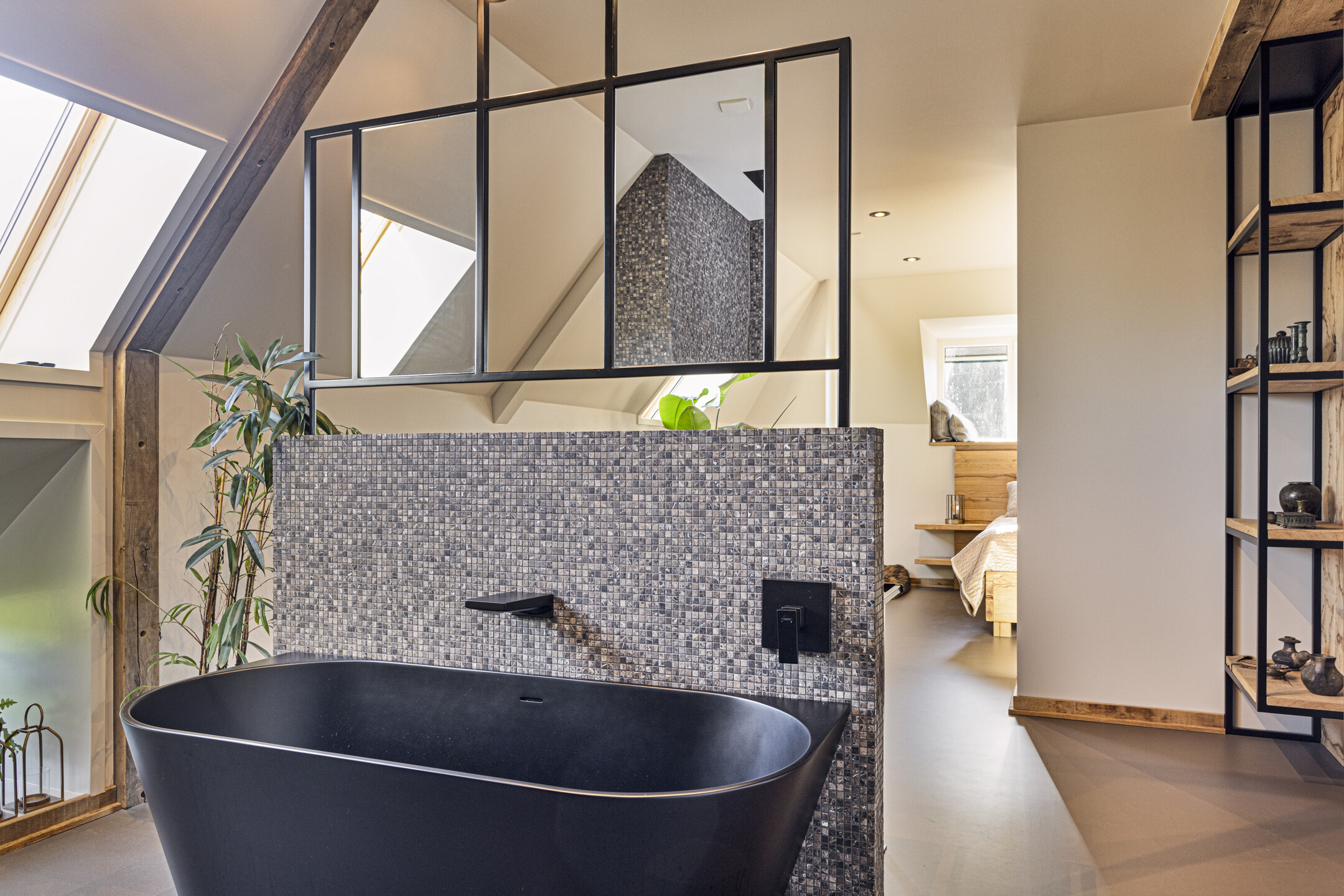 De grote slaapkamer is te bereiken middels de badkamer: met de allure van een exclusief resort, is deze voorzien van een dubbele douche met regendouche, een vrijstaand bad met uitzicht op de tuin, en een grote dubbele wastafel.