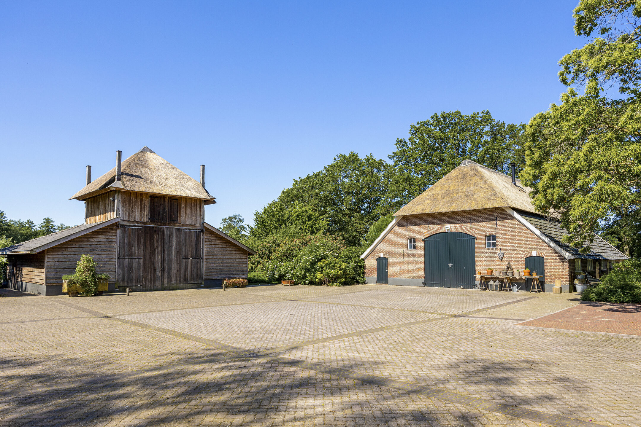 Bij de poort staat de grote stoltenberg, de hooischuur met ruimte voor voertuigen als een trekker en de grasmaaier.