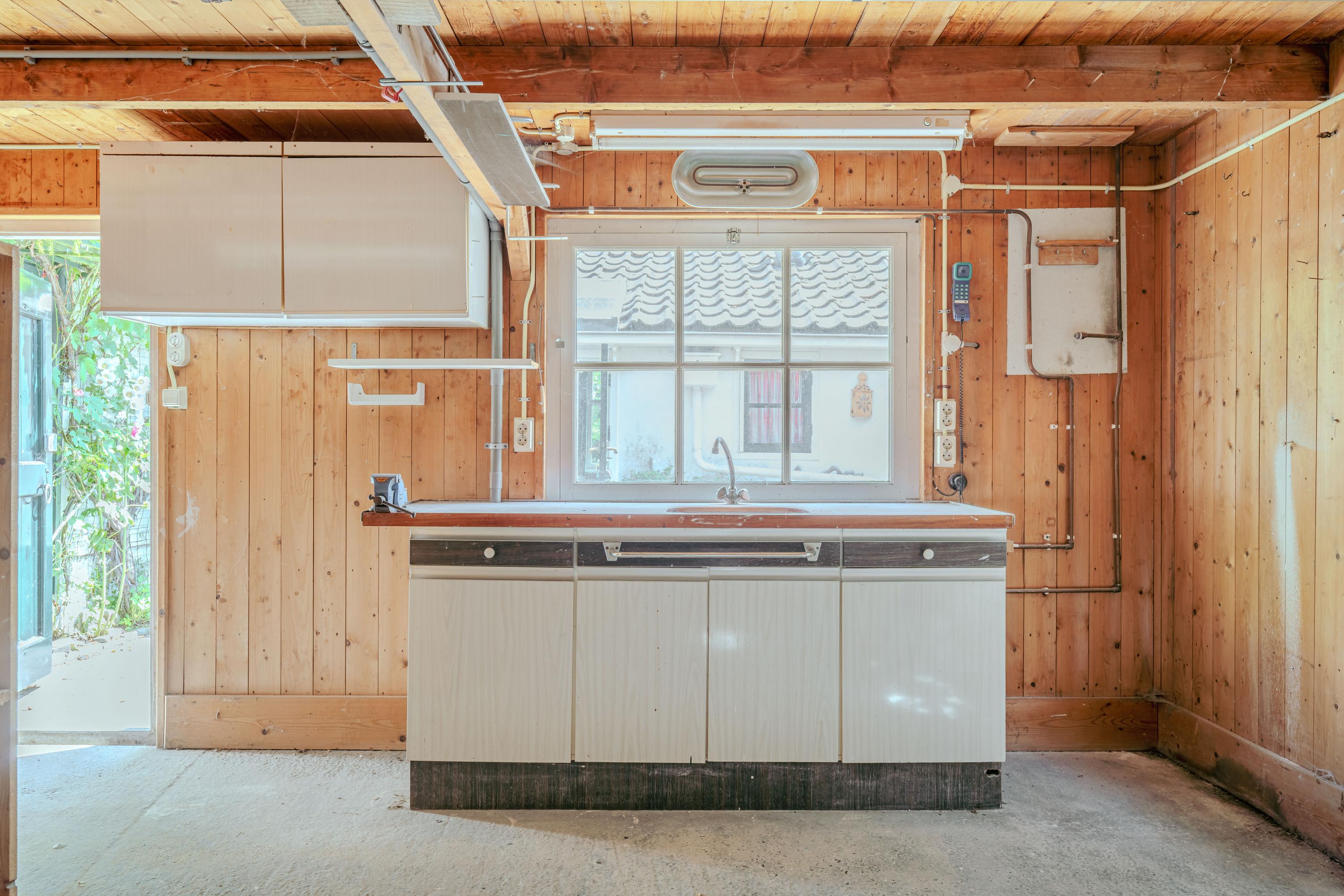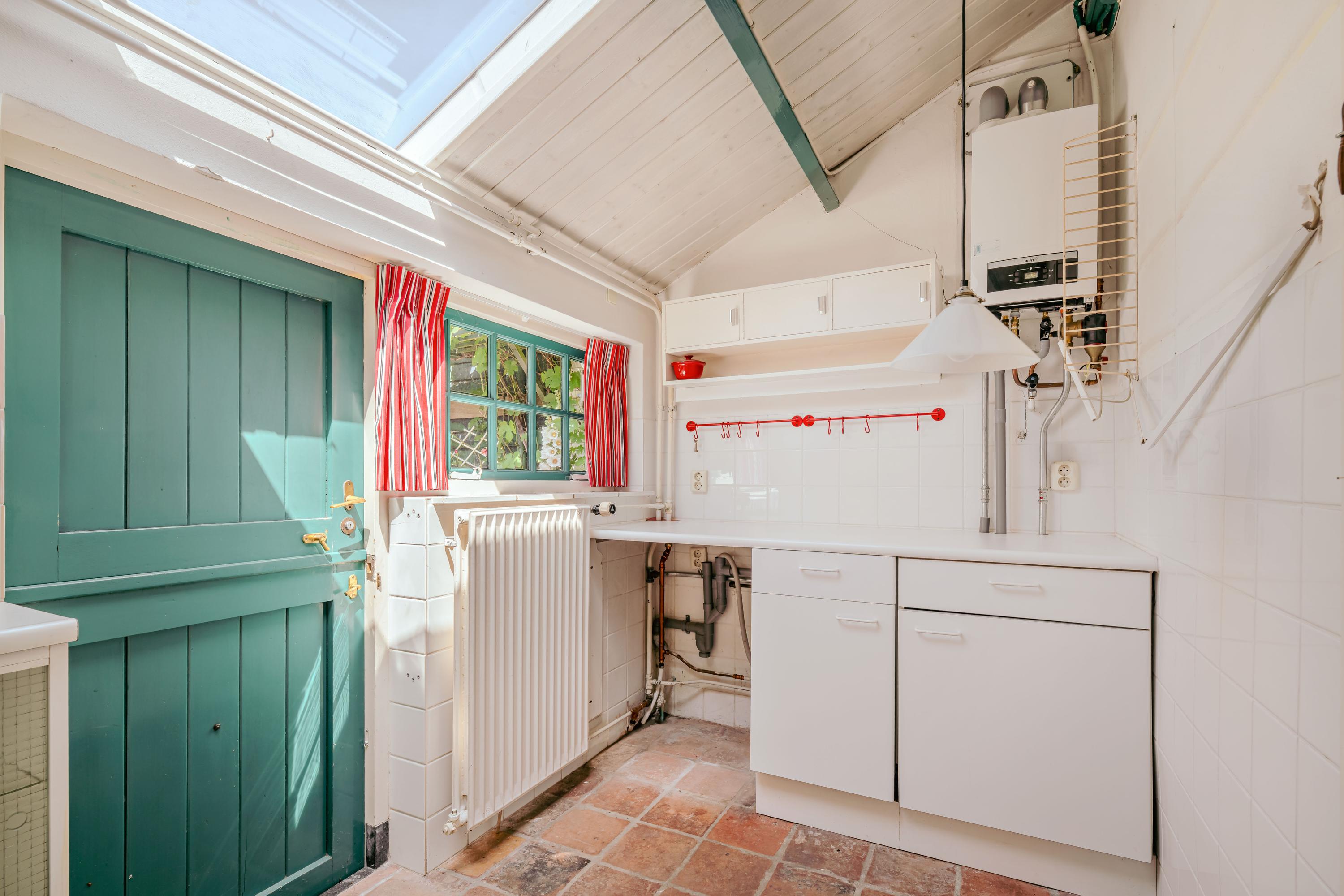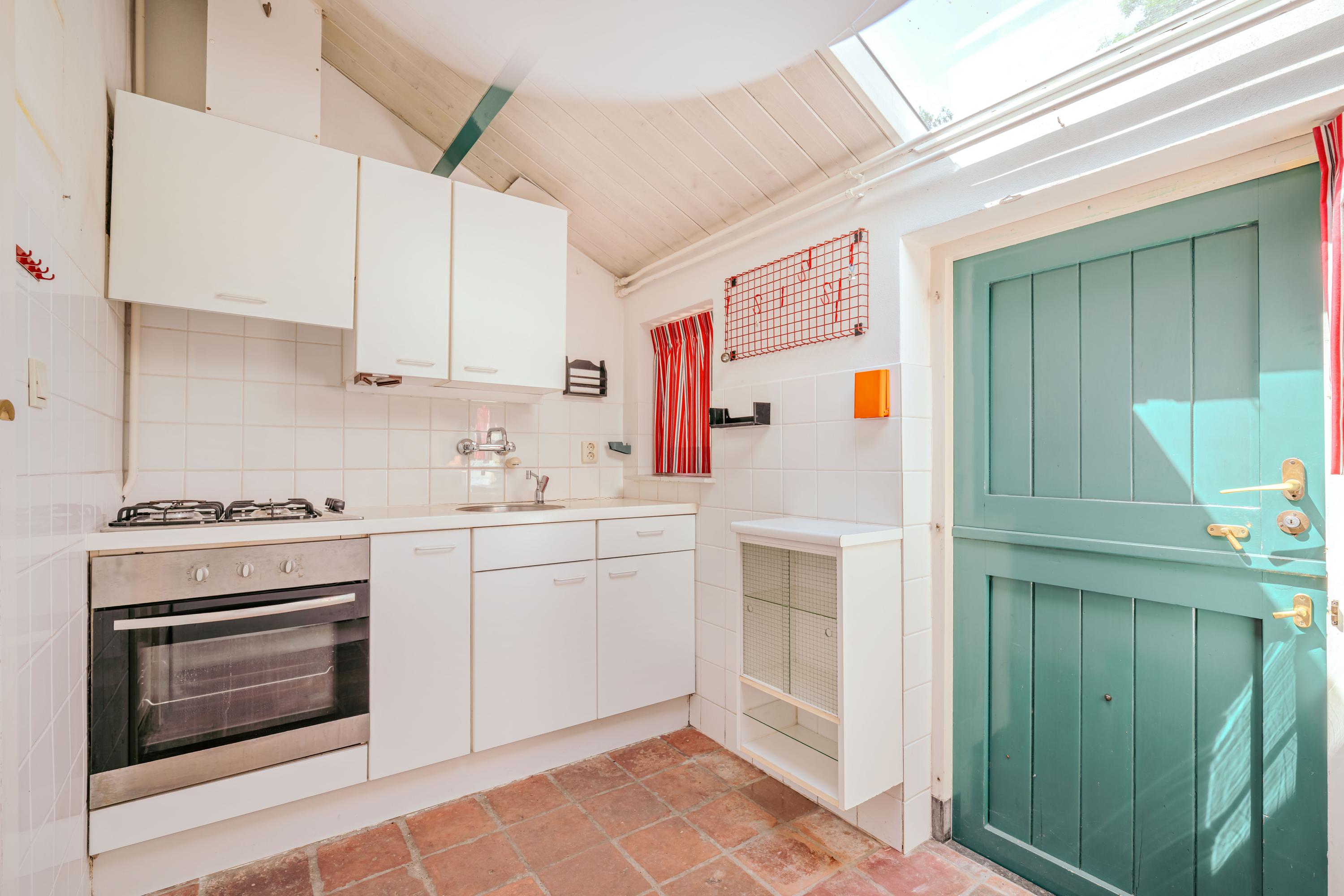 Vanaf de binnenplaats is het woonhuis toegankelijk via twee deuren. De linker deur leidt naar de keuken, waar veel daglicht binnenvalt via dakramen. De keuken is uitgerust met een spoelbak, vier gaspitten, een oven en diverse kasten en lades. Hier bevinden zich ook de cv-ketel en wasmachineaansluiting. Aansluitend ligt de woon- en eetkamer aan de voorzijde van de woning. Deze ruimte heeft houten balken, vaste kasten en ramen met uitzicht op het groen. De haard, houten afwerking en het zicht op de dijk geven de kamer een warme uitstraling. Via de hal met dakraam bereikt u het separate toilet met fonteintje en de badkamer met ligbad, douche en wastafelmeubel.