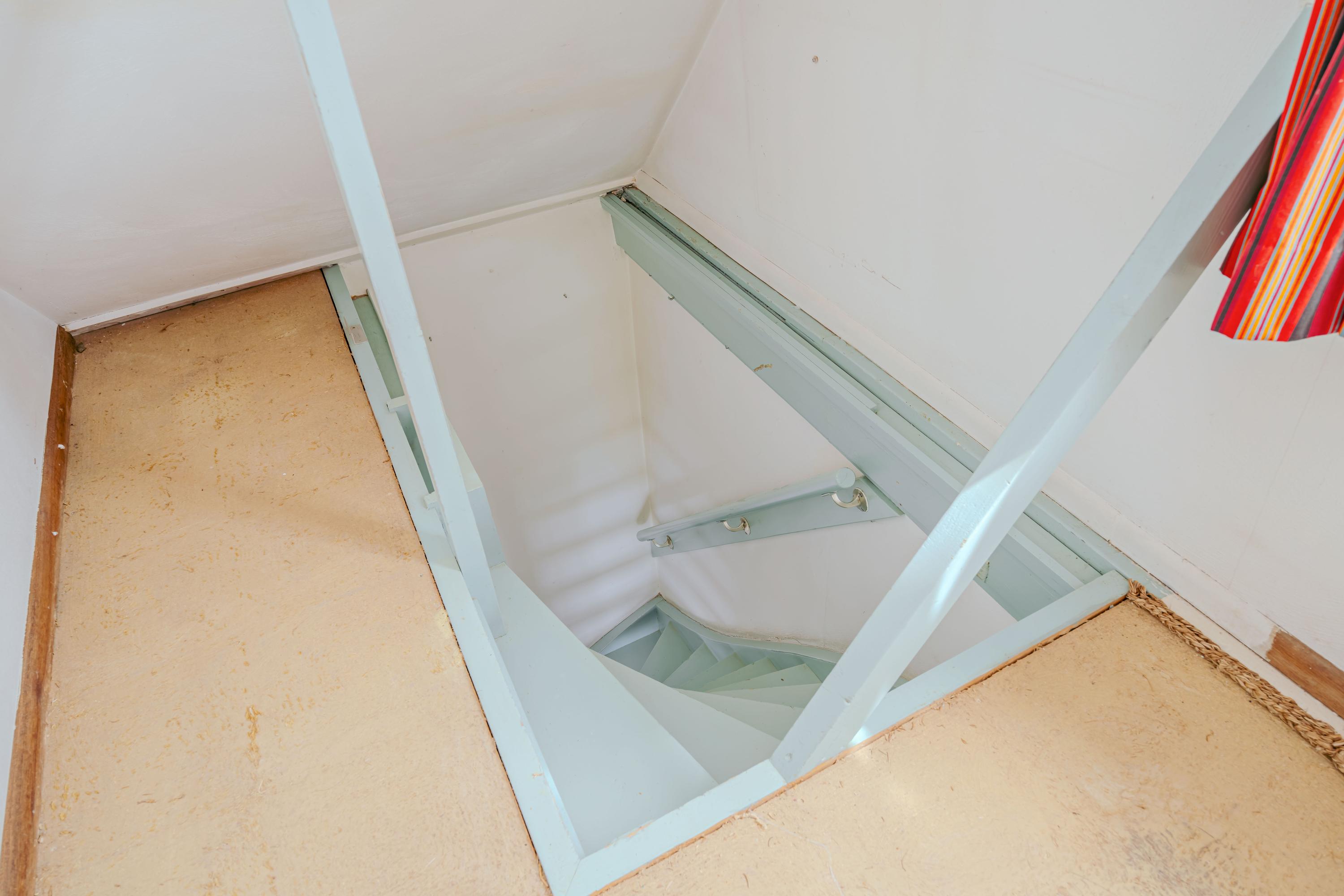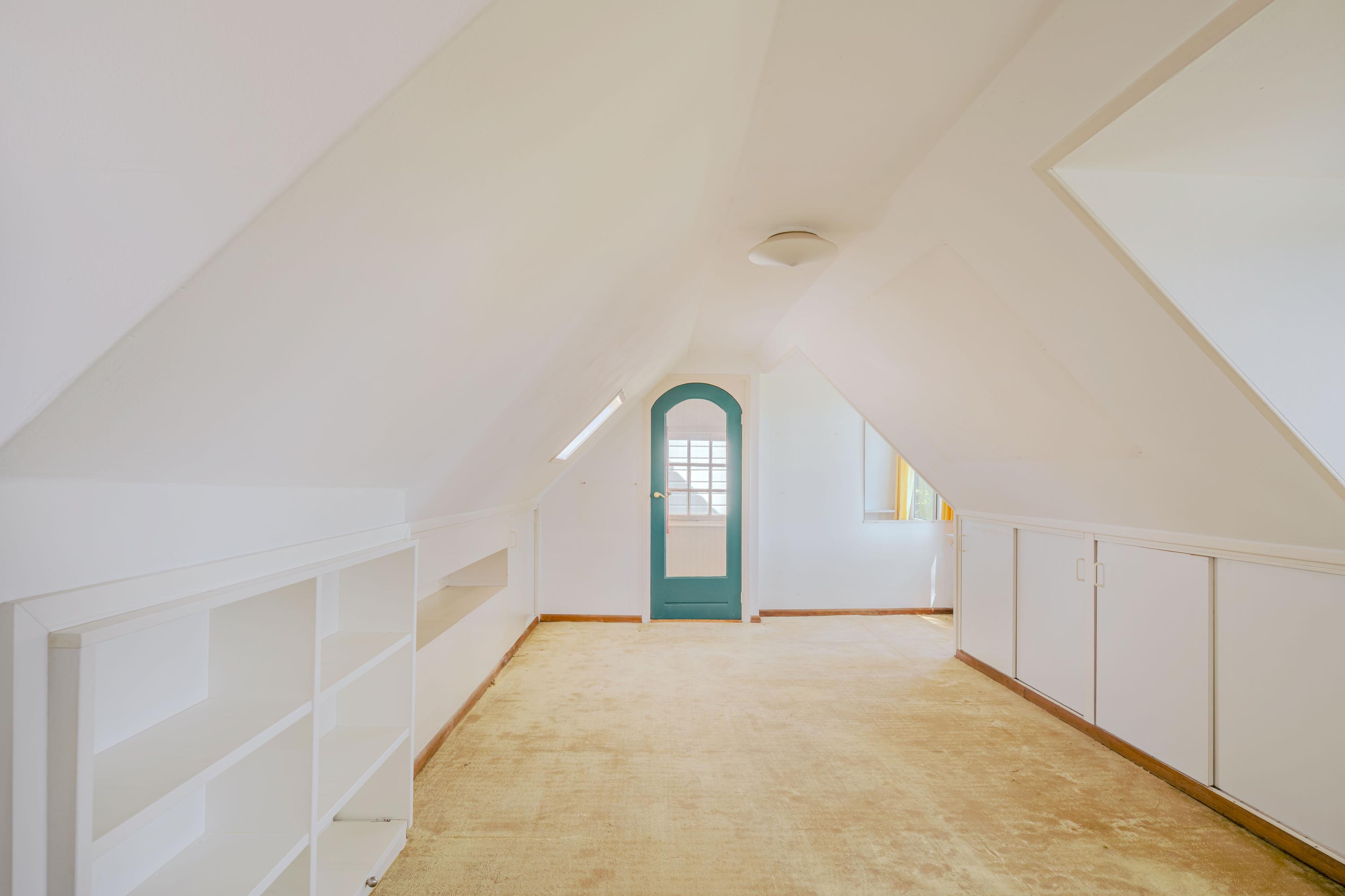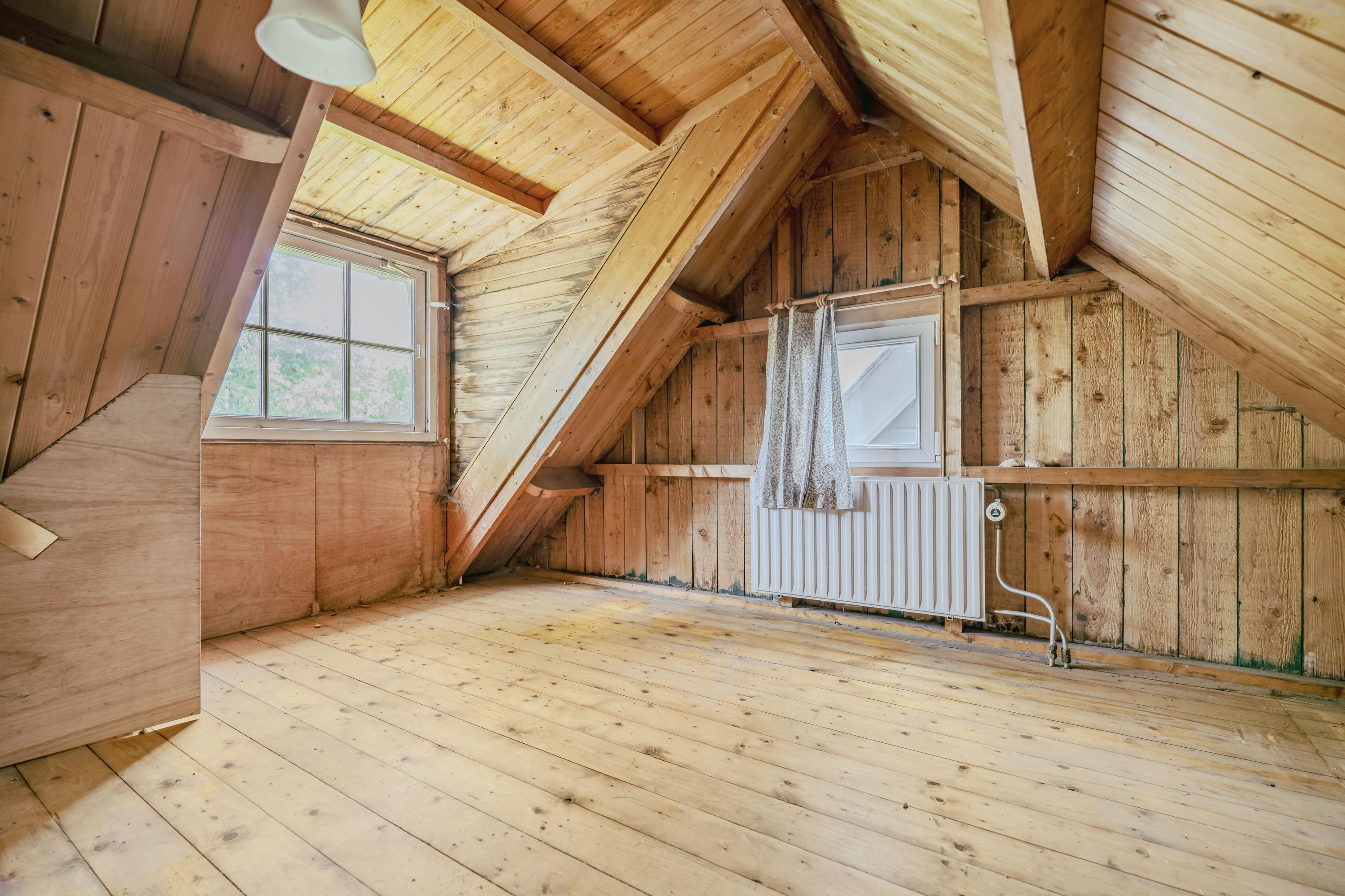 Een houten draaitrap leidt naar de verdieping, met een overloop en een ruime slaapkamer die de volledige etage beslaat. De kamer biedt uitzicht over de Amstel en het omliggende landschap. Onder de schuine daken zijn praktische bergruimtes gecreëerd. Aan de voorzijde bevindt zich een zitje in de raamnis met zicht op de rivier.