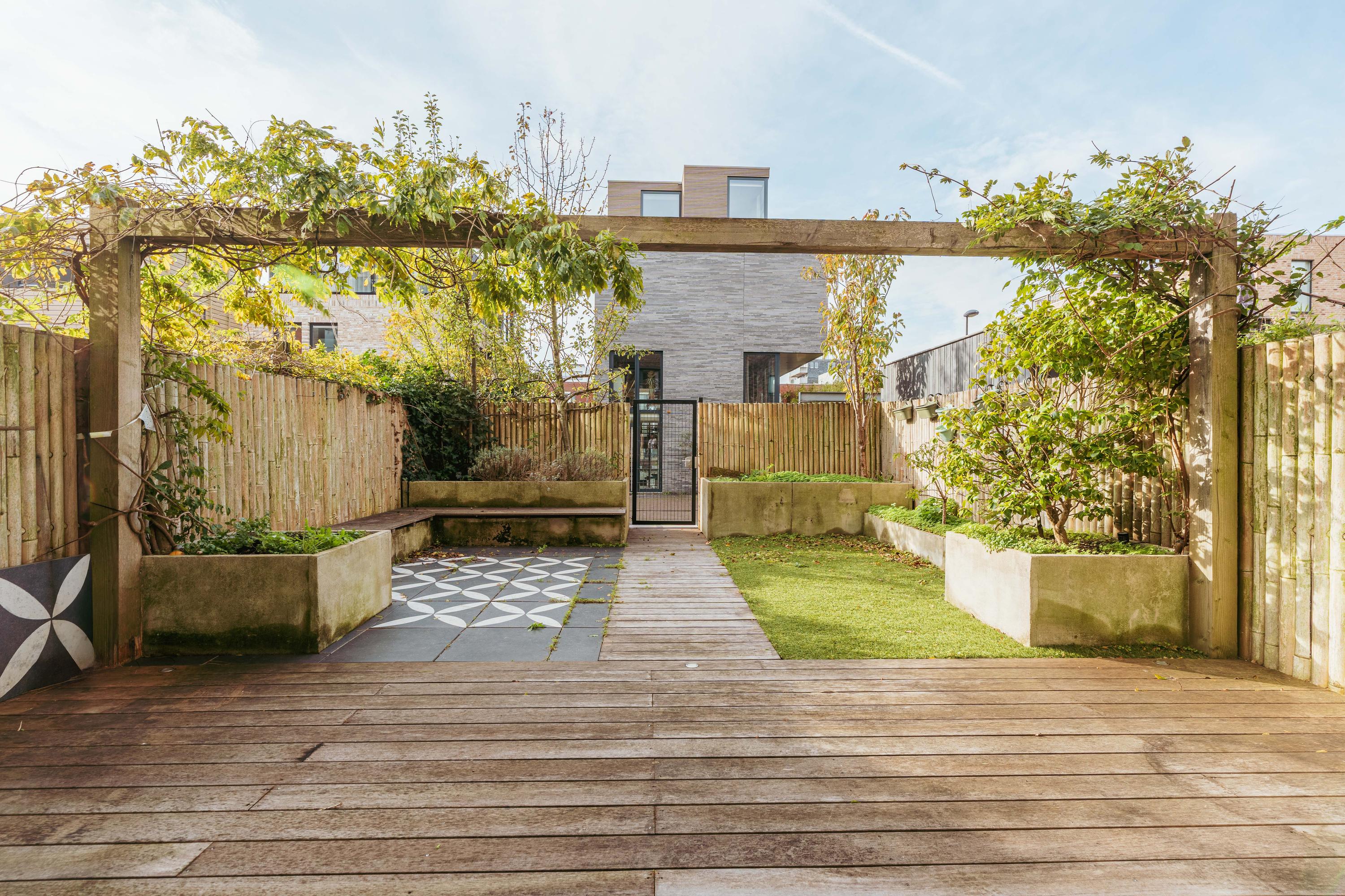 Dubbele openslaande deuren geven toegang tot de onderhoudsvriendelijke achtertuin van circa 54 m². De tuin is fraai aangelegd met houten vlonders, sierbestrating en groen. Achterin bevindt zich een eigen poort naar het achtergelegen terrein met twee privéparkeerplaatsen voorzien van een elektrische laadpaal.