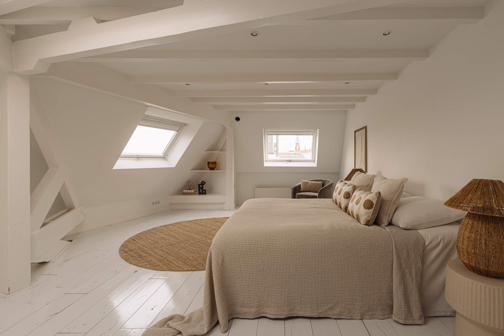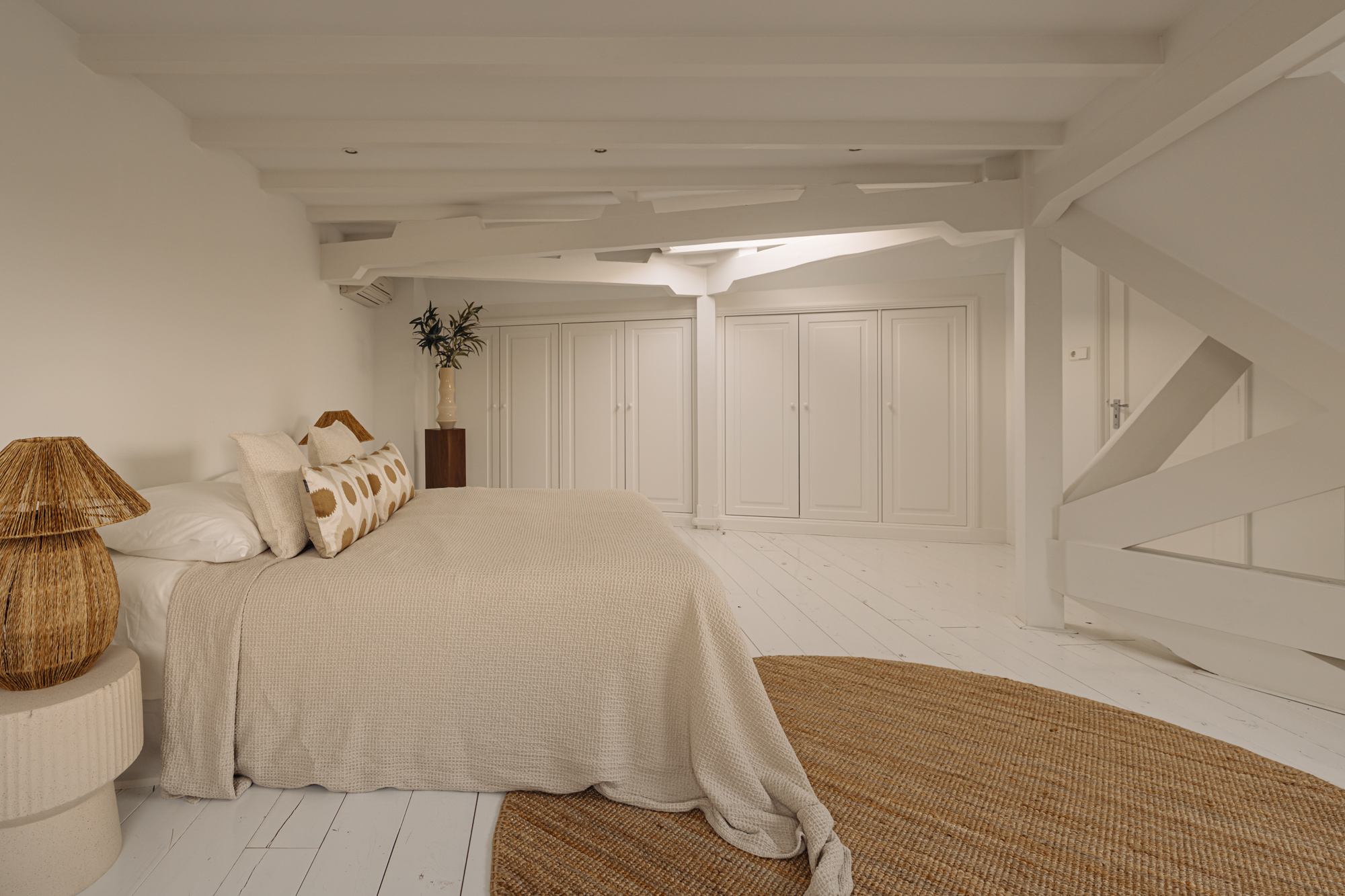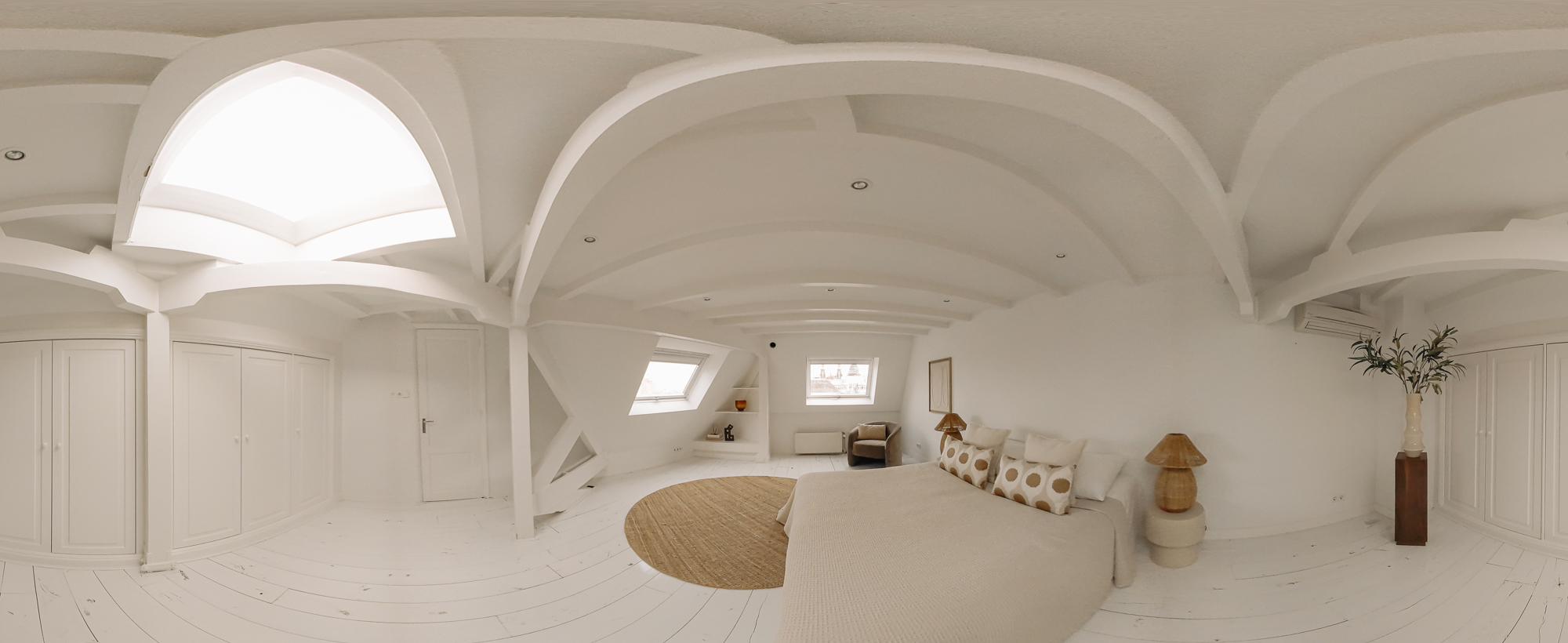 Op de vijfde en tevens bovenste verdieping bevindt zich de tweede slaapkamer, uitgerust met airconditioning, ingebouwde kasten en dakramen die zorgen voor veel daglicht. Vanaf de overloop is een separaat toilet met fontein bereikbaar.