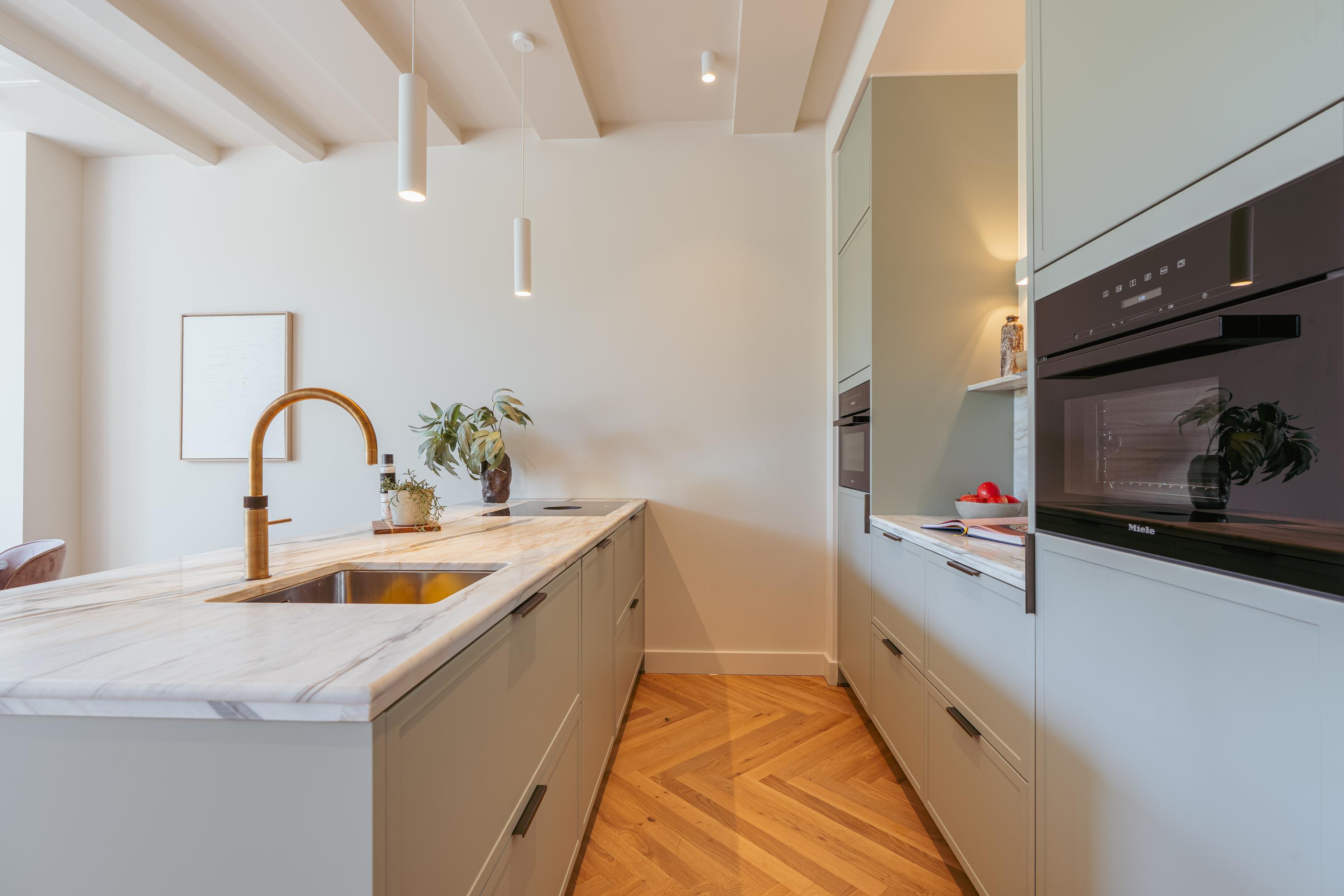 De living en woonkeuken zijn gesitueerd op split level, wat zorgt voor een speels en ruimtelijk effect. De keuken is voorzien van alle denkbare inbouwapparatuur waaronder een Quooker, Siemens Studioline combioven en oven, Bora inductieplaat met geïntegreerde afzuiging, vaatwasser en meer dan genoeg opbergruimte. Een marmeren blad en messing details maken het geheel af! Het bargedeelte met marmeren blad en houten barkrukken maakt deze ruimte perfect voor zowel uitgebreid koken als ontspannen borrelen. De woonkamer aan de voorzijde heeft drie imposante hoge ramen met uitzicht op de majestueuze Keizersgracht. Hier valt het daglicht prachtig naar binnen en creëert in combinatie met de plafondbalken een warme sfeer. Een moderne gashaard vormt het knusse middelpunt van deze ruimte en geeft het extra sfeer.