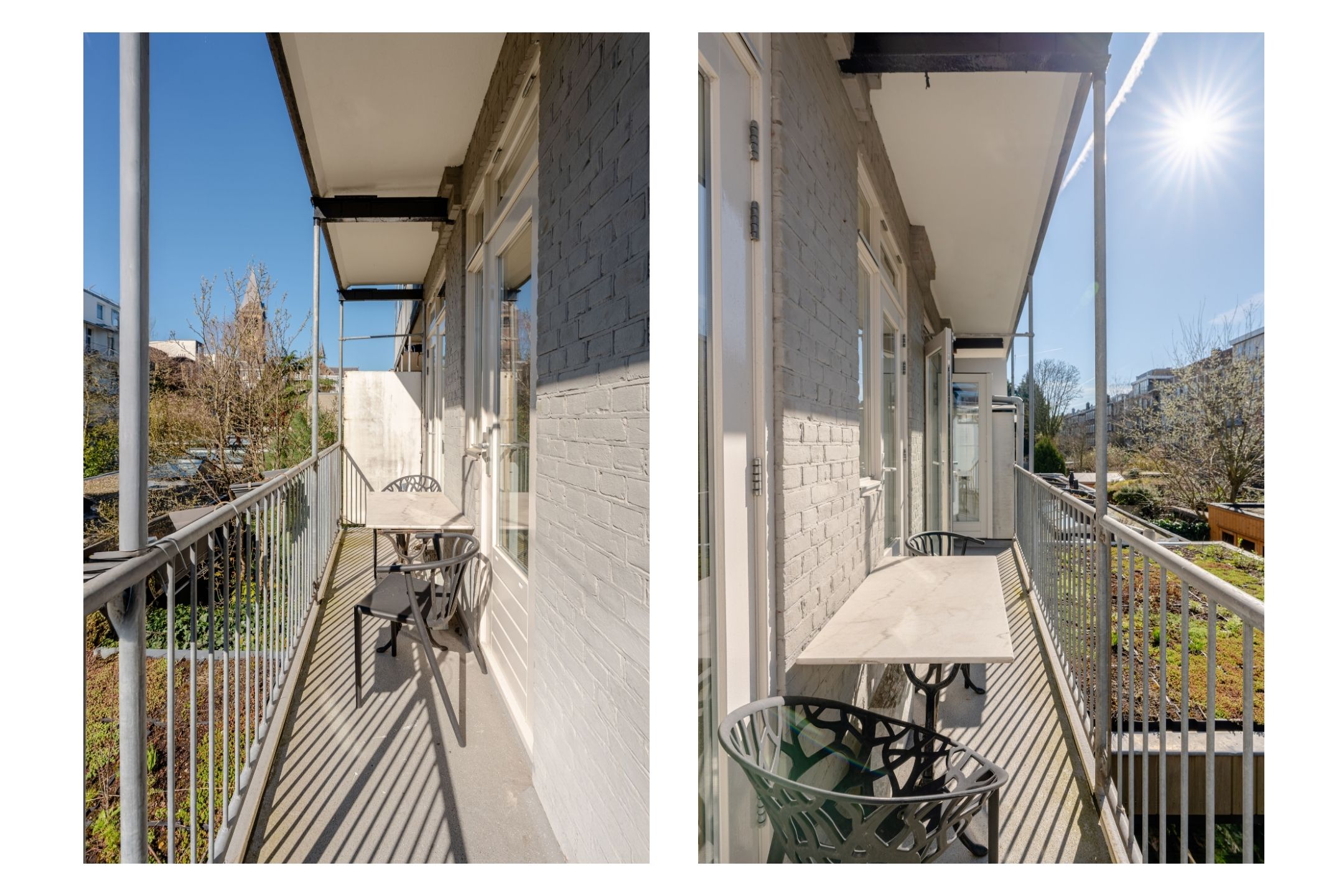 Aan de achterzijde van de woning bevinden zich twee goed bemeten slaapkamers, beide voorzien van openslaande deuren naar het balkon. Hierdoor ontstaat een fijne verbinding tussen binnen en buiten en genieten de kamers van veel licht en een groen uitzicht.