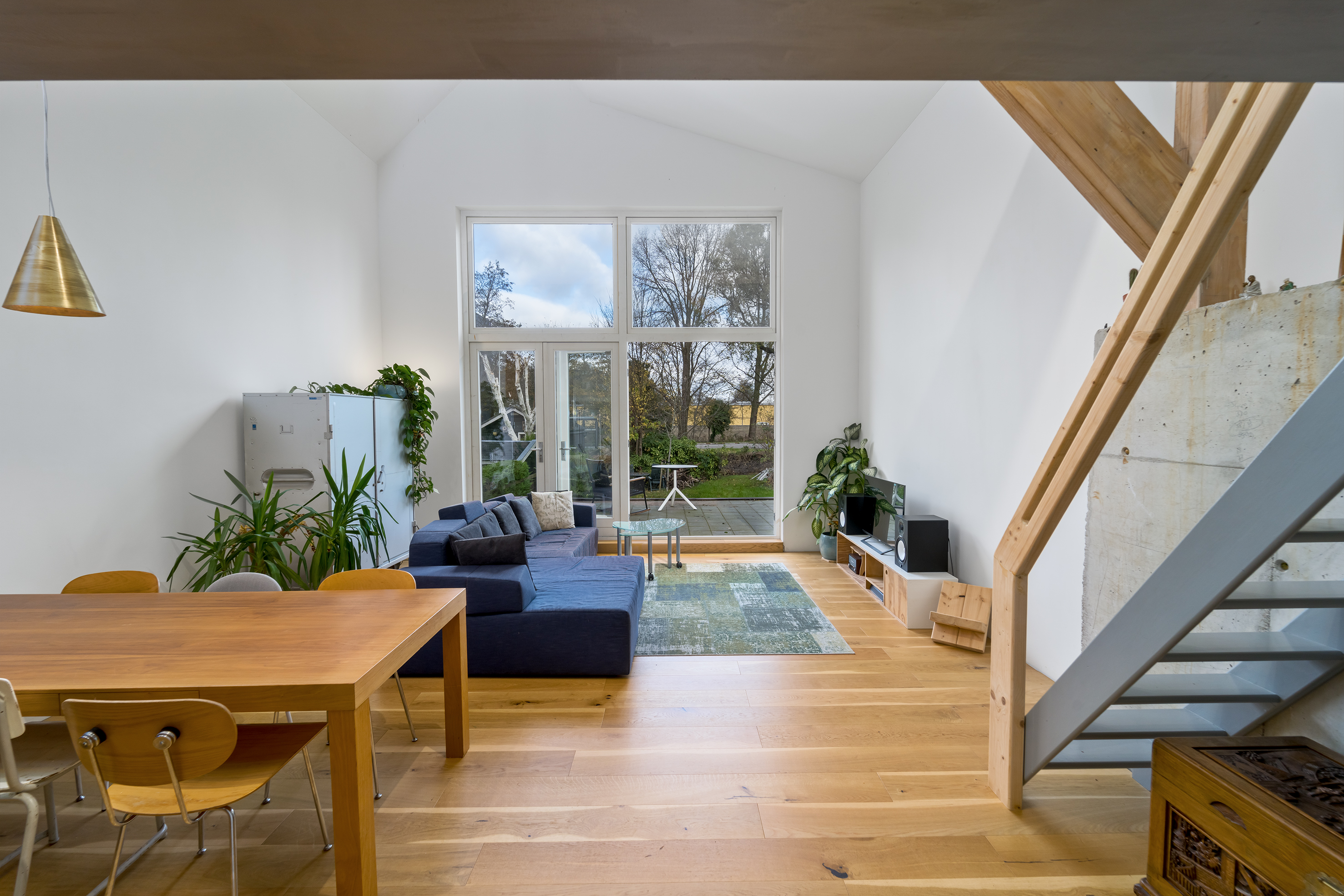 De woning is van binnen al net zo gaaf. Oude en moderne materialen zijn gebruikt bij de nieuwbouw/verbouwing. Stoere houten constructie balken, ruw beton, eiken vloerdelen, klassieke ledenradiatoren en de stalen wenteltrap zijn daar een aantal voorbeelden van.