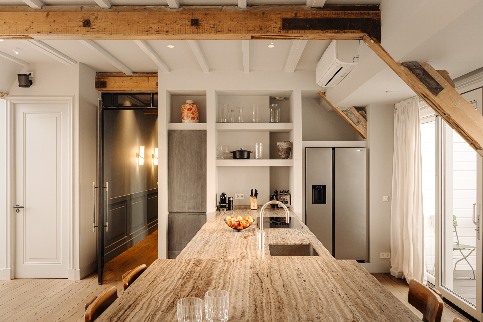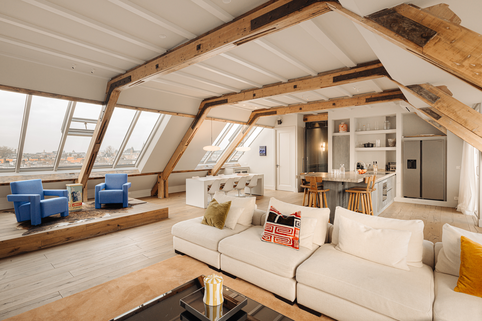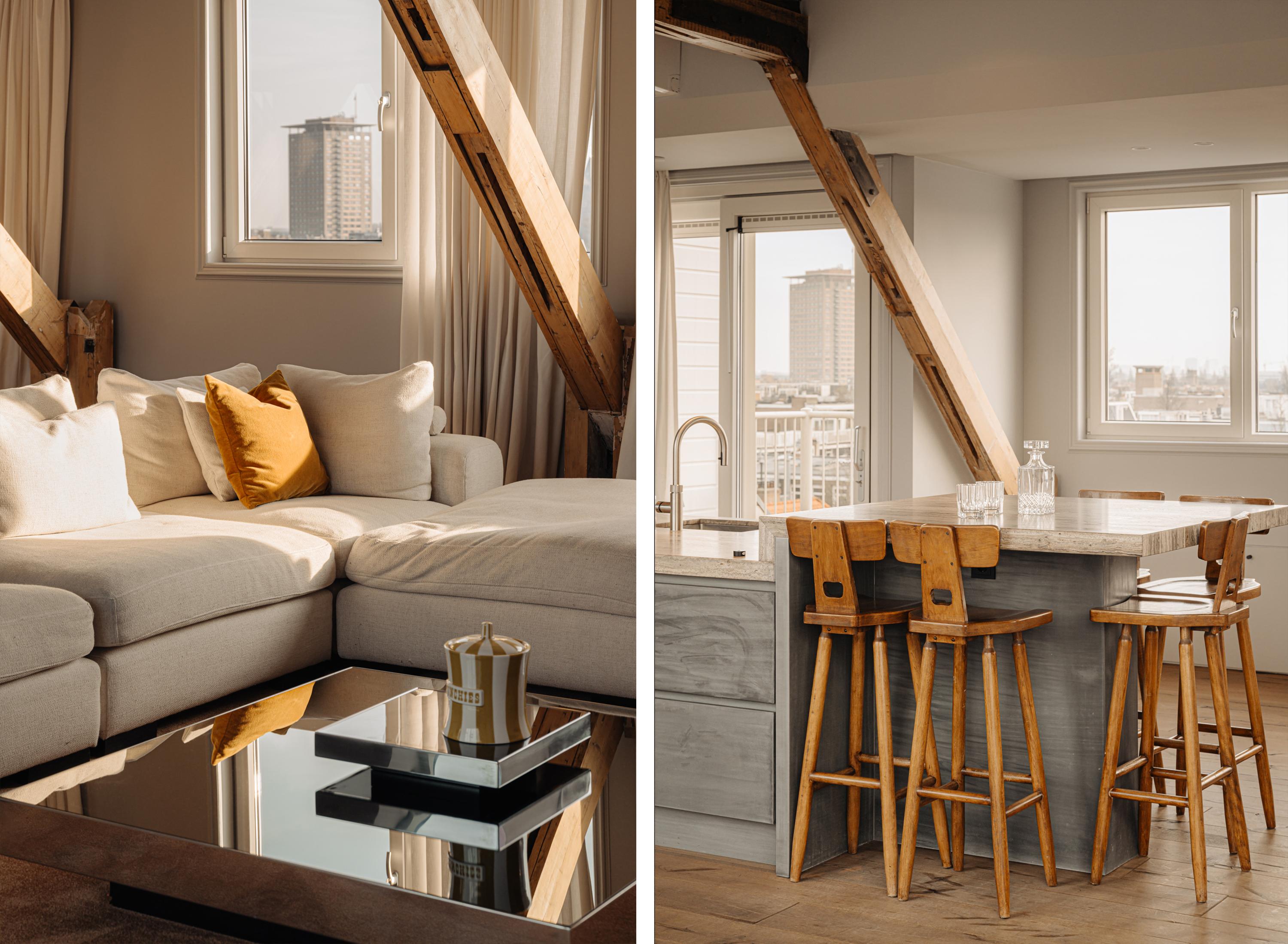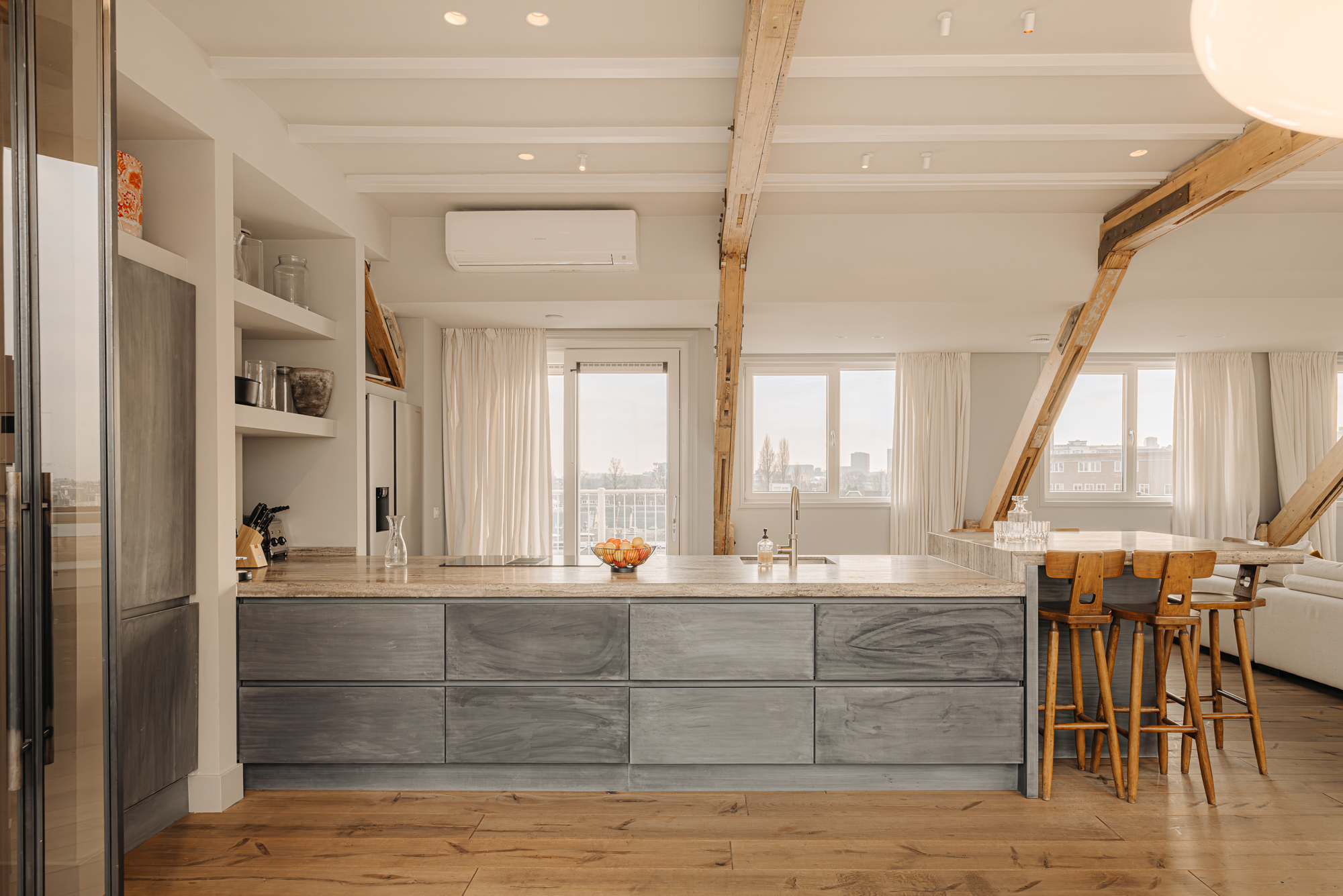 Bij binnenkomst valt direct de ruimtelijke en lichte opzet van de woning op. De woonkamer beschikt over een gezellig balkon gelegen op het zuiden en grote raampartijen aan weerszijden, die zorgen voor veel daglicht en een weids uitzicht over de stad. De zichtbare houten balken geven de ruimte karakter, terwijl het verhoogde zitgedeelte een prettige plek biedt om te ontspannen. Een airco installatie bevindt zich boven de keuken, die is voorzien van een ruim kookeiland met een natuurstenen werkblad en hoogwaardige inbouwapparatuur zoals een 4-pits inductie met afzuiger, een vaatwasser, koel- en vriescombinatie en tot slot een Quooker en een ingebouwde wijnklimaatkast. Een fraai verhoogd bargedeelte bevindt zich haaks aan het kookeiland. De eetruimte biedt plaats aan een grote eettafel die middels de grote raampartijen wederom mooi in het daglicht staat.