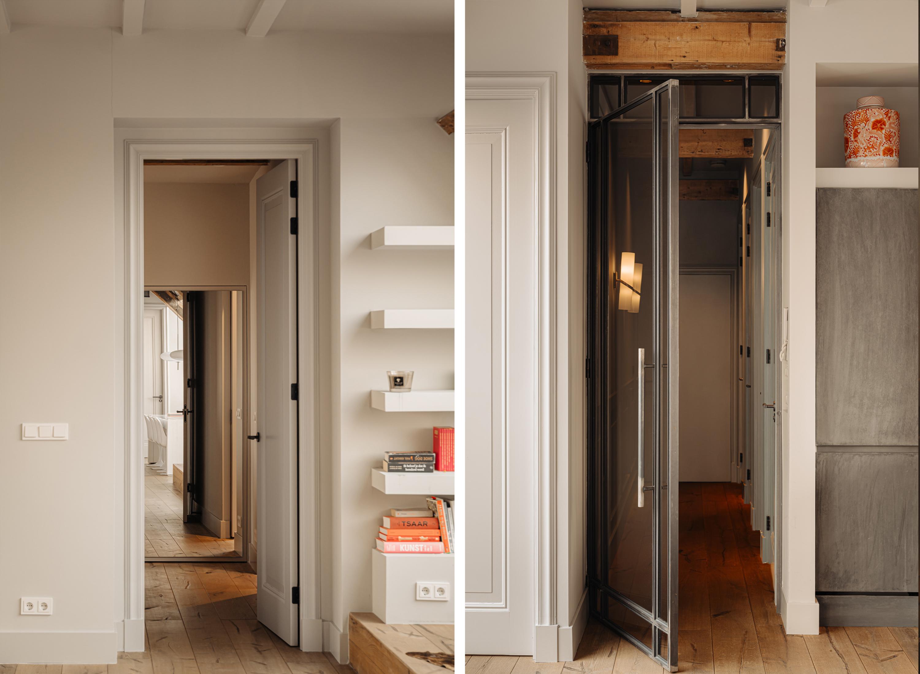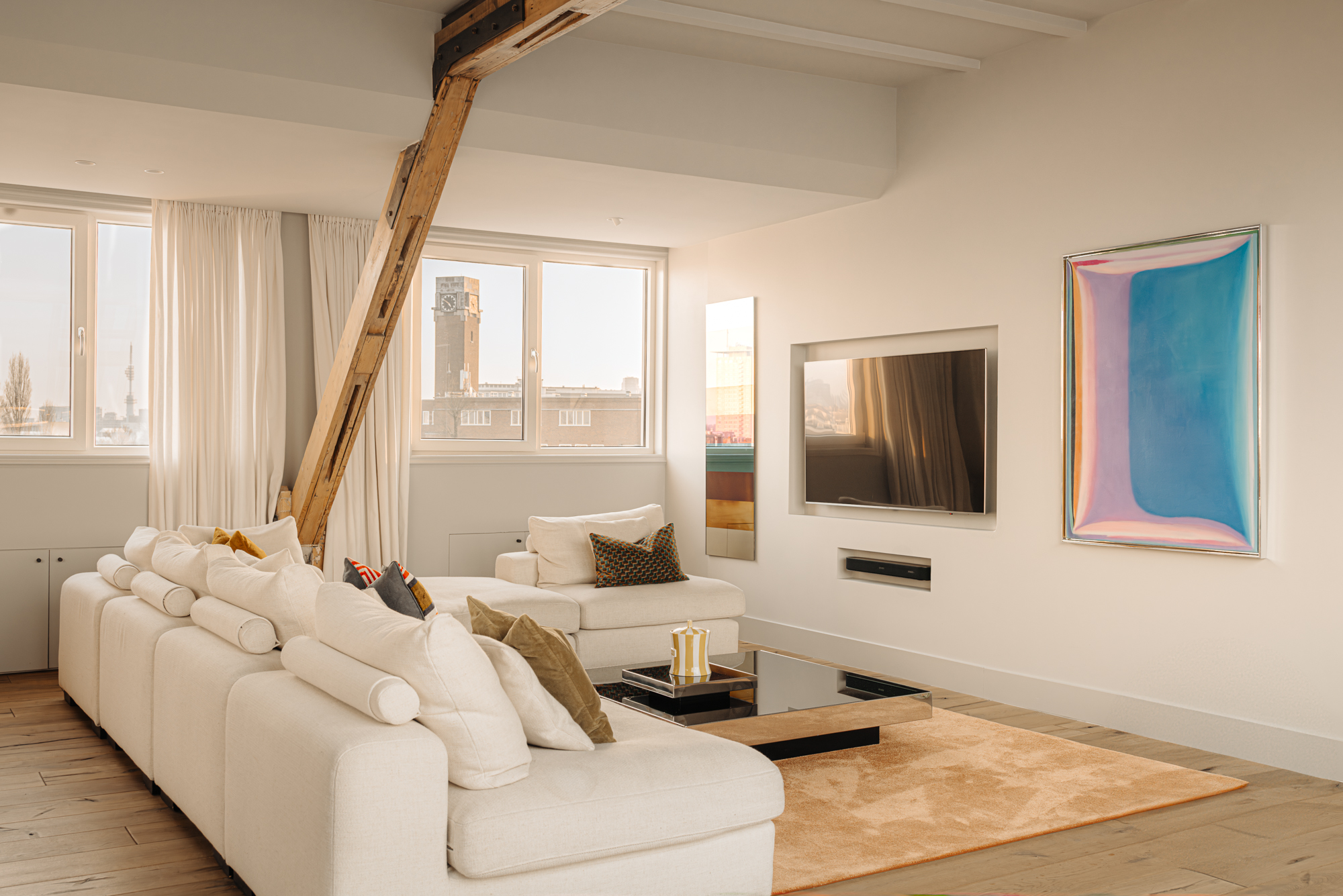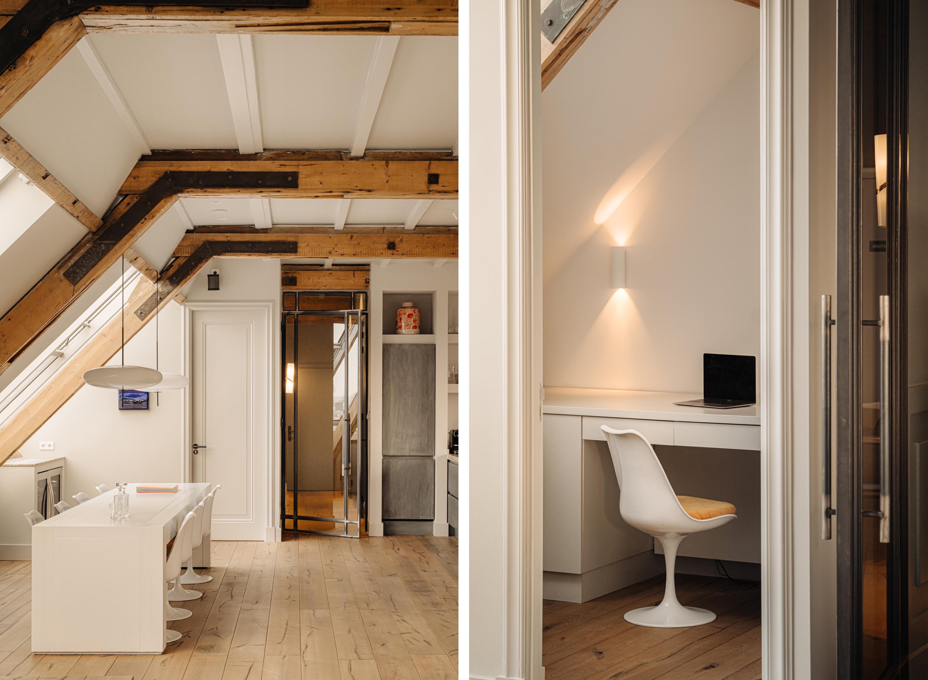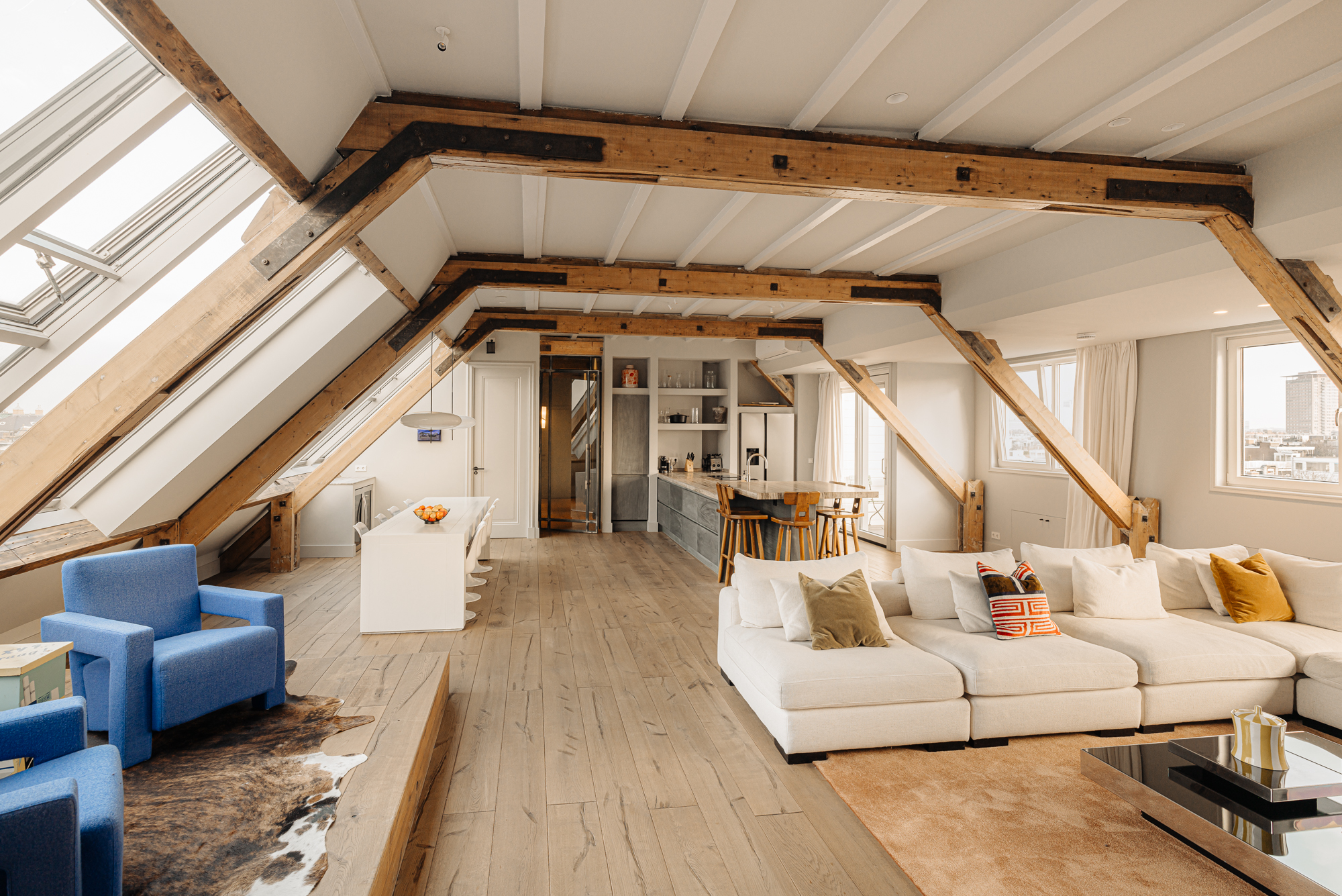 Bij binnenkomst valt direct de ruimtelijke en lichte opzet van de woning op. De woonkamer beschikt over een gezellig balkon gelegen op het zuiden en grote raampartijen aan weerszijden, die zorgen voor veel daglicht en een weids uitzicht over de stad. De zichtbare houten balken geven de ruimte karakter, terwijl het verhoogde zitgedeelte een prettige plek biedt om te ontspannen. Een airco installatie bevindt zich boven de keuken, die is voorzien van een ruim kookeiland met een natuurstenen werkblad en hoogwaardige inbouwapparatuur zoals een 4-pits inductie met afzuiger, een vaatwasser, koel- en vriescombinatie en tot slot een Quooker en een ingebouwde wijnklimaatkast. Een fraai verhoogd bargedeelte bevindt zich haaks aan het kookeiland. De eetruimte biedt plaats aan een grote eettafel die middels de grote raampartijen wederom mooi in het daglicht staat.